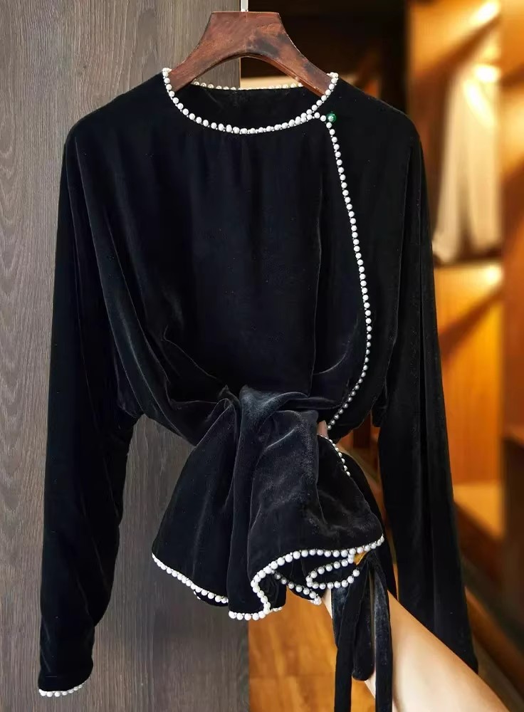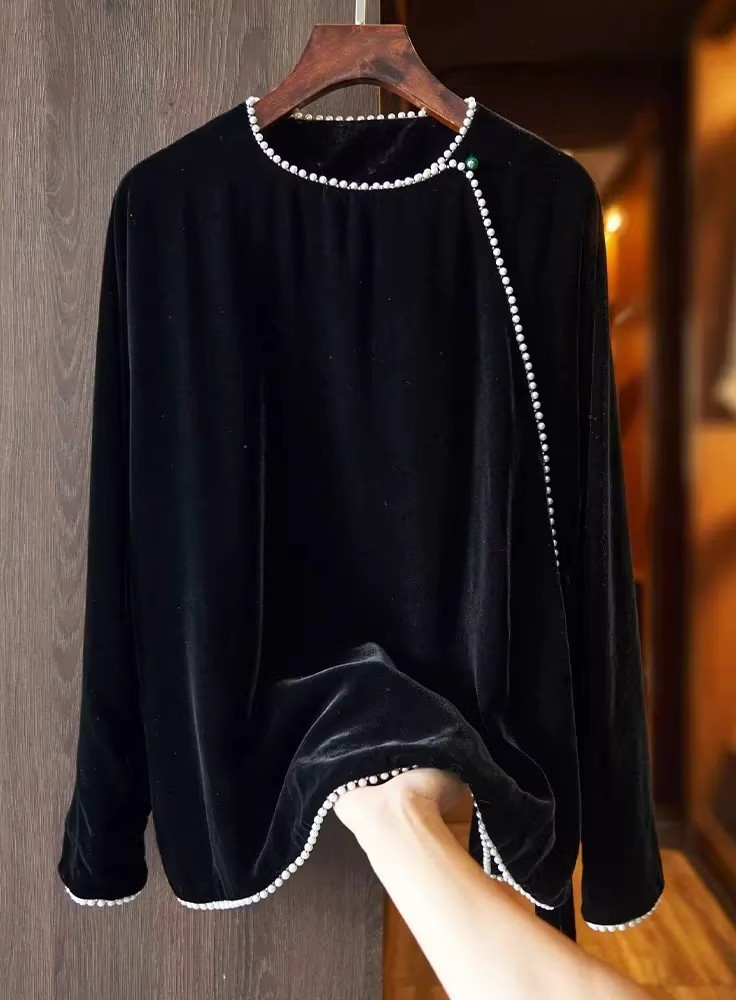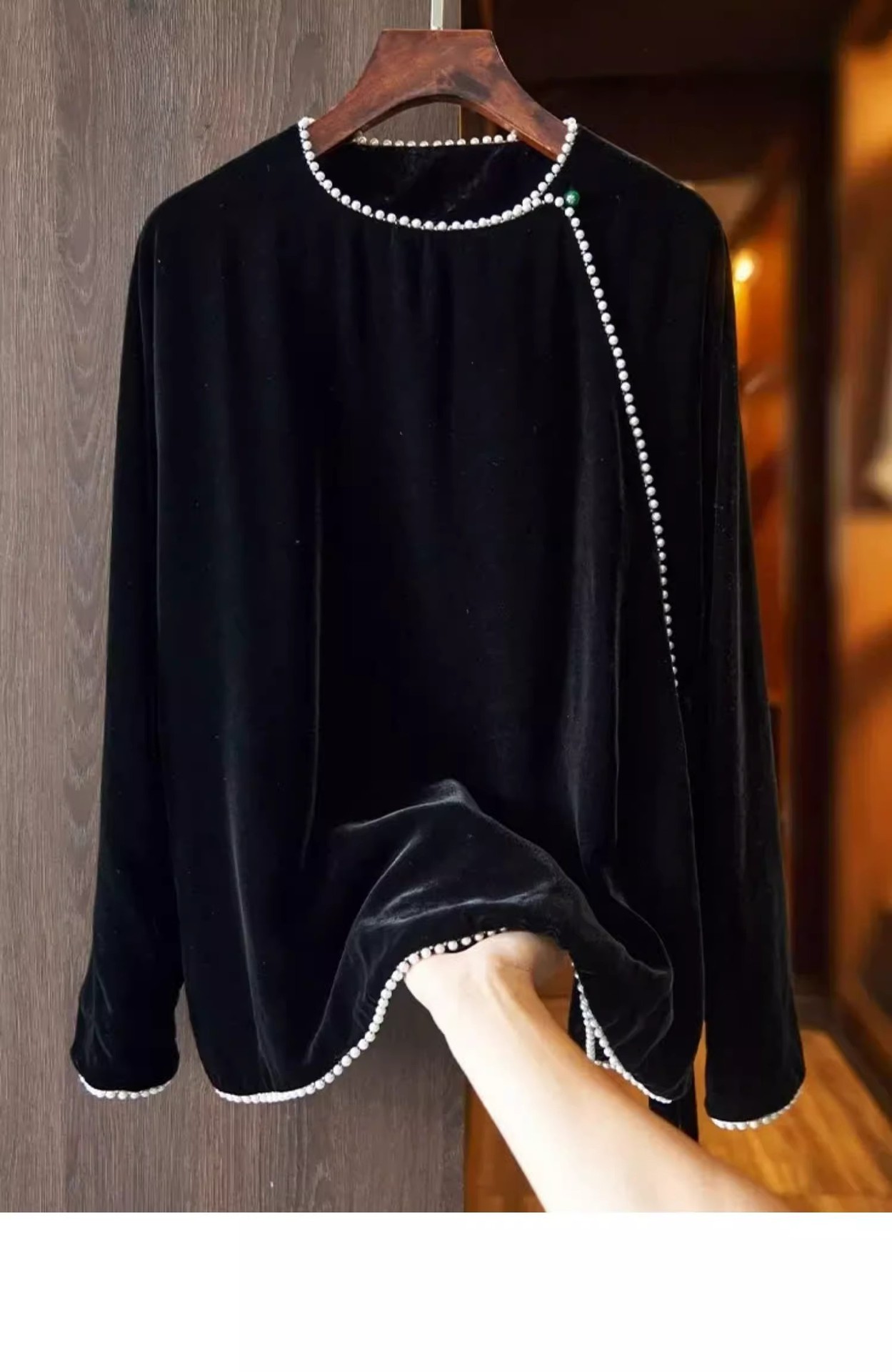 丁摩 黑色仿真丝绒衬衣女秋装新款中式改良唐装女士长袖上衣5ZF-0146