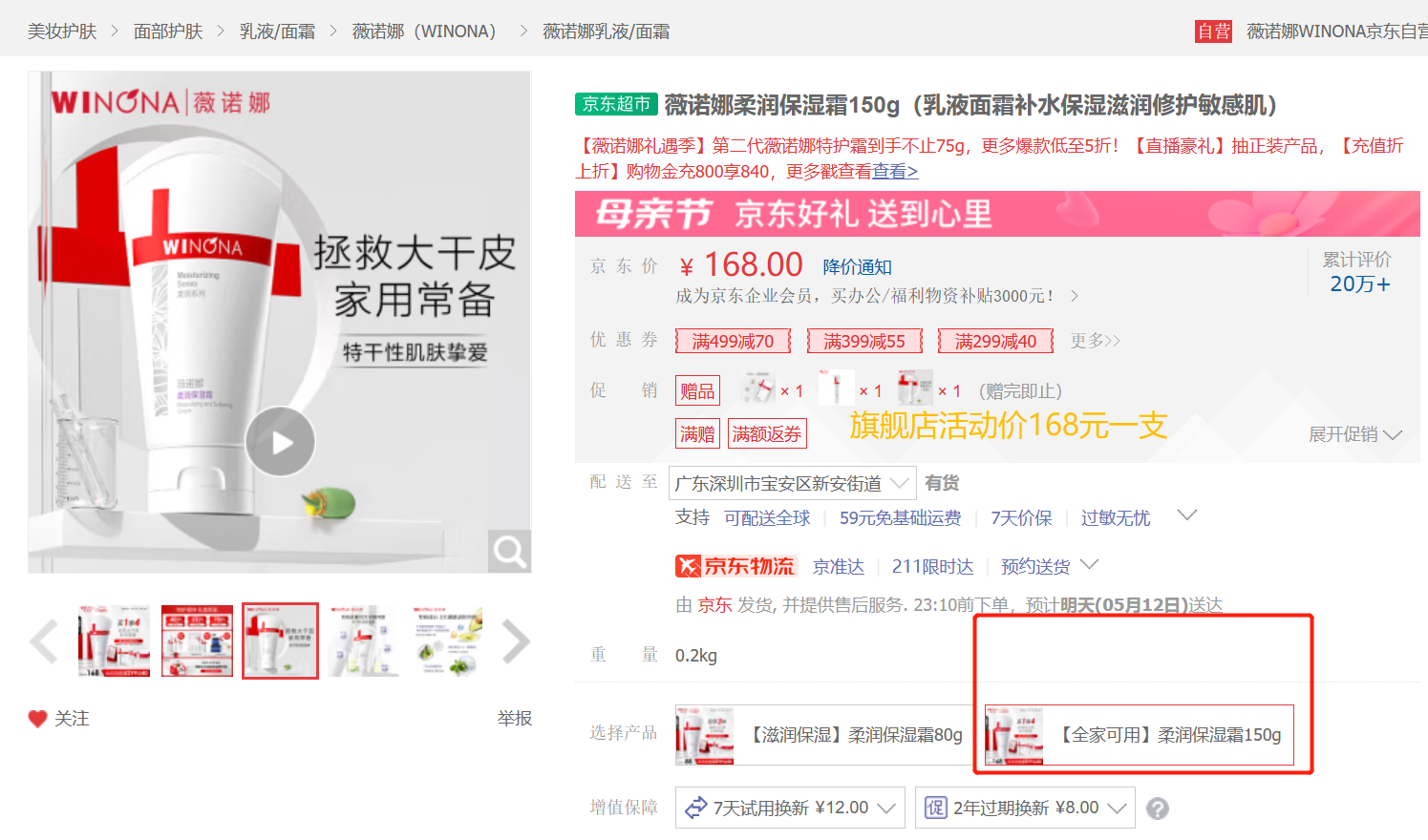 薇诺娜柔润保湿霜 150g/支旗舰店活动价168元!开团均价66元!下单立省102元!产品日期:2022-09-24-2025-09-23
