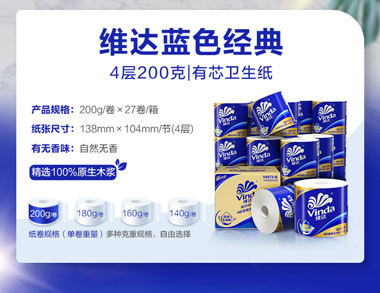 【官方包邮】维达蓝色经典超韧有芯卫生卷纸 4层200g27卷箱装(自然无香)