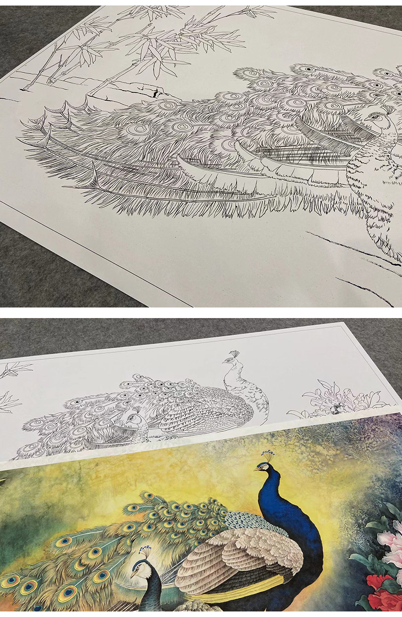 【大彩图】横幅工笔画白描底稿《孔雀》临摹勾线花鸟线稿HN19