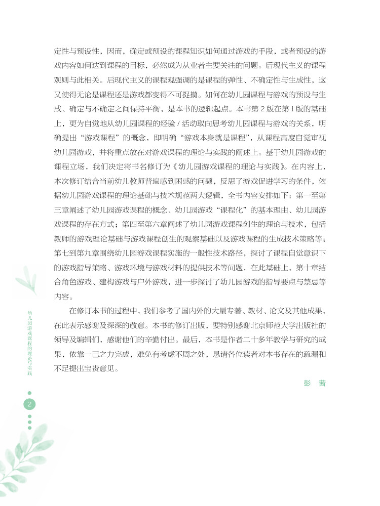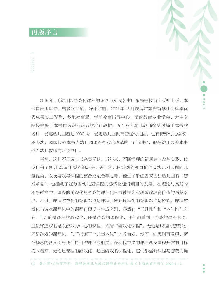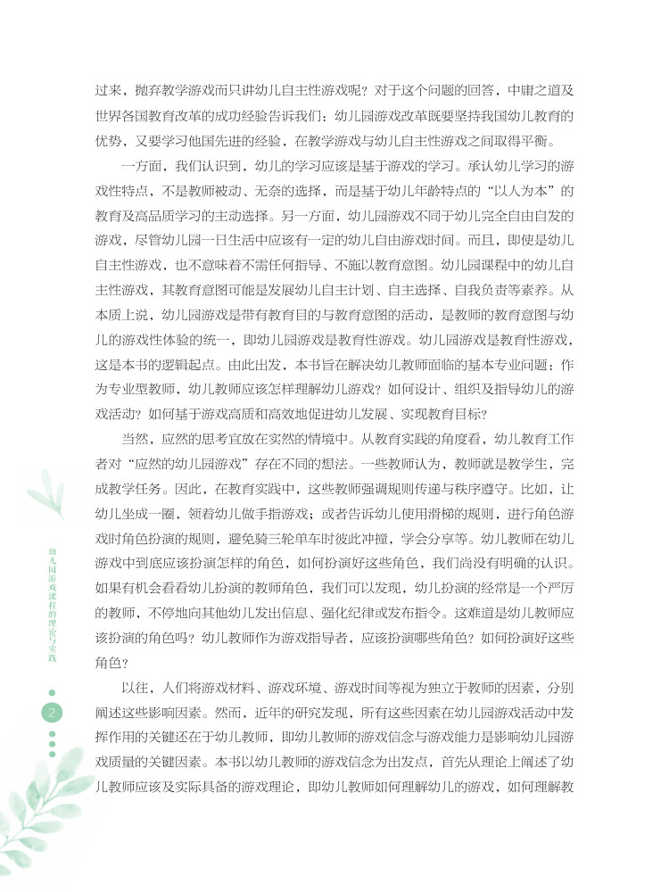 1.回应实践需求:从当前学前教育领域较为关注的游戏与课程的关系入手,回应实践关于二者的困惑--如何理解游戏与课程、如何理解游戏的课程自觉、如何设计游戏课程、如何指导游戏课程等,提供幼儿园游戏课程化的理论框架、思路指引及实践指导。