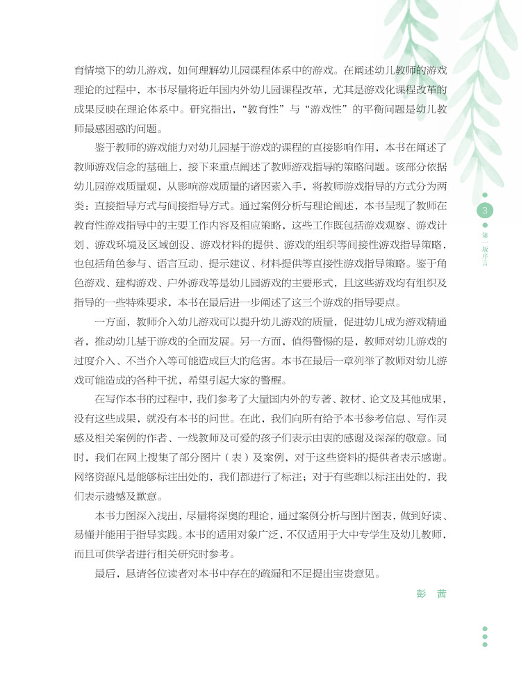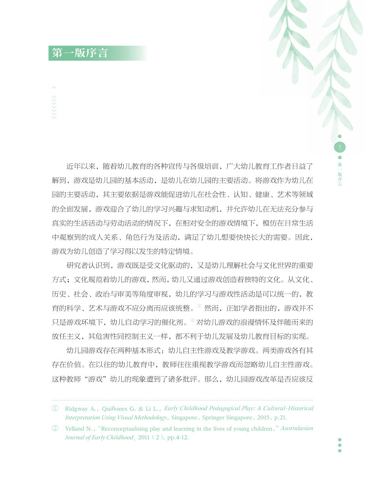 4.受众广泛多元:本书设计上兼顾教材、职后培训及日常工作参考需求,融通理论与实践,既可用作学前教育专业职前培养教材和幼儿园教师培训用书,还可作为一线幼儿园教师及园长、教科研人员等的参考用书。