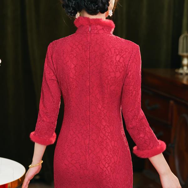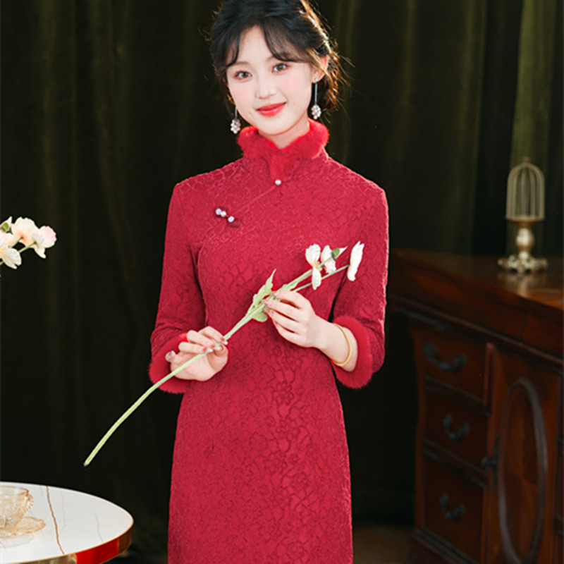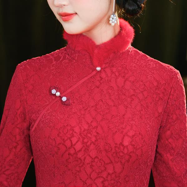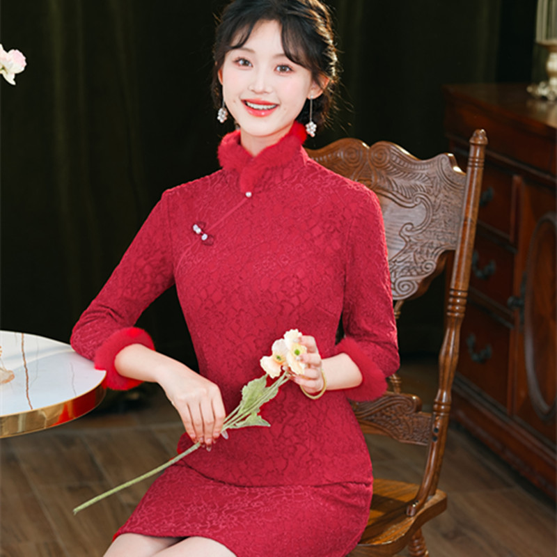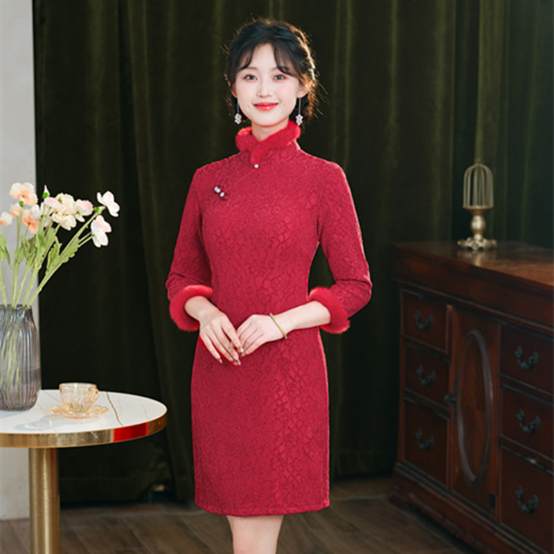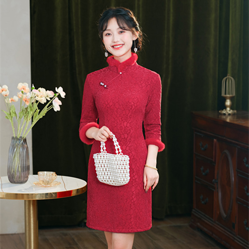 A271023高档旗袍连衣裙红色秋冬新款加绒加厚气质改良版旗袍短款喜庆红装