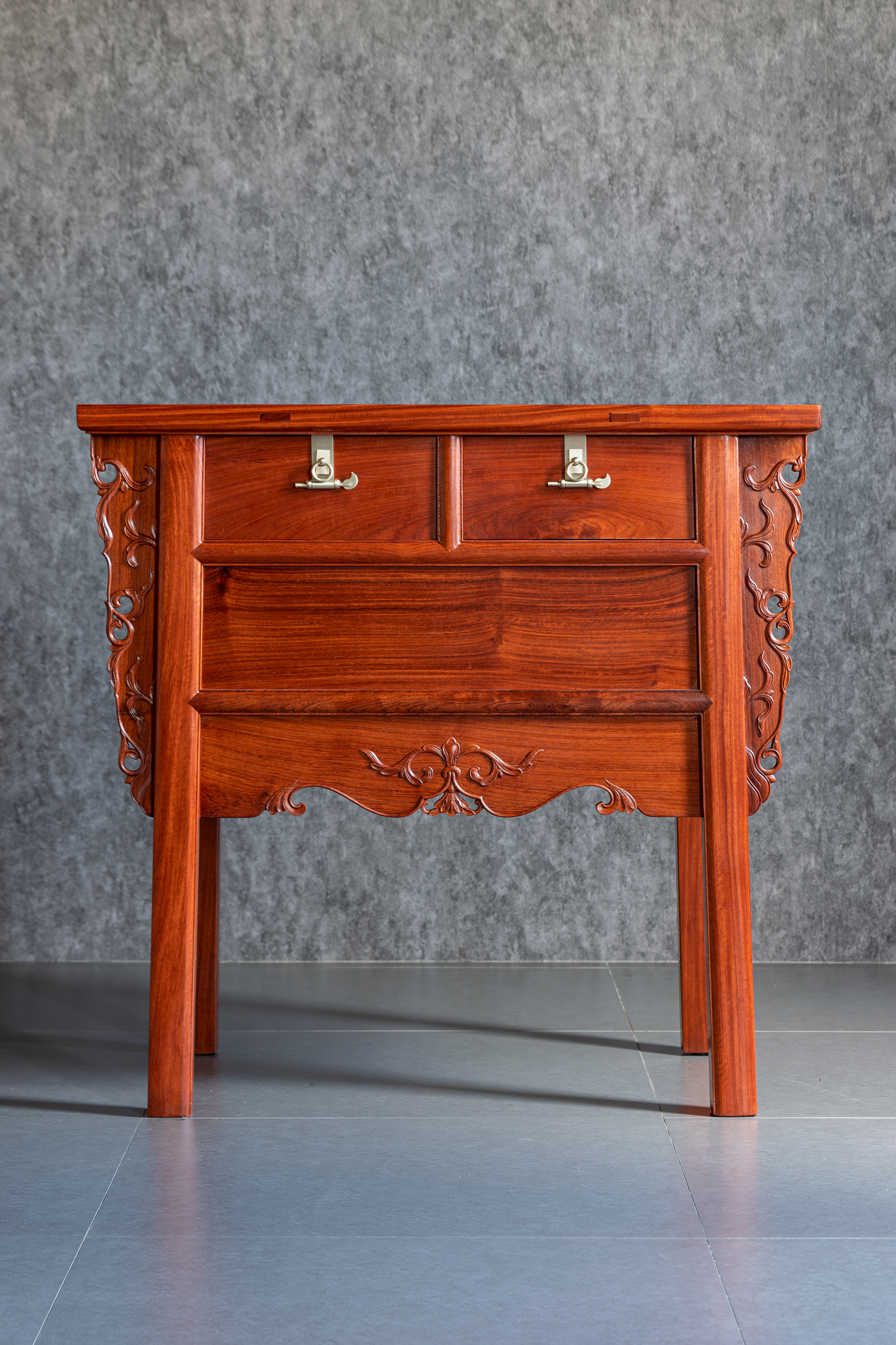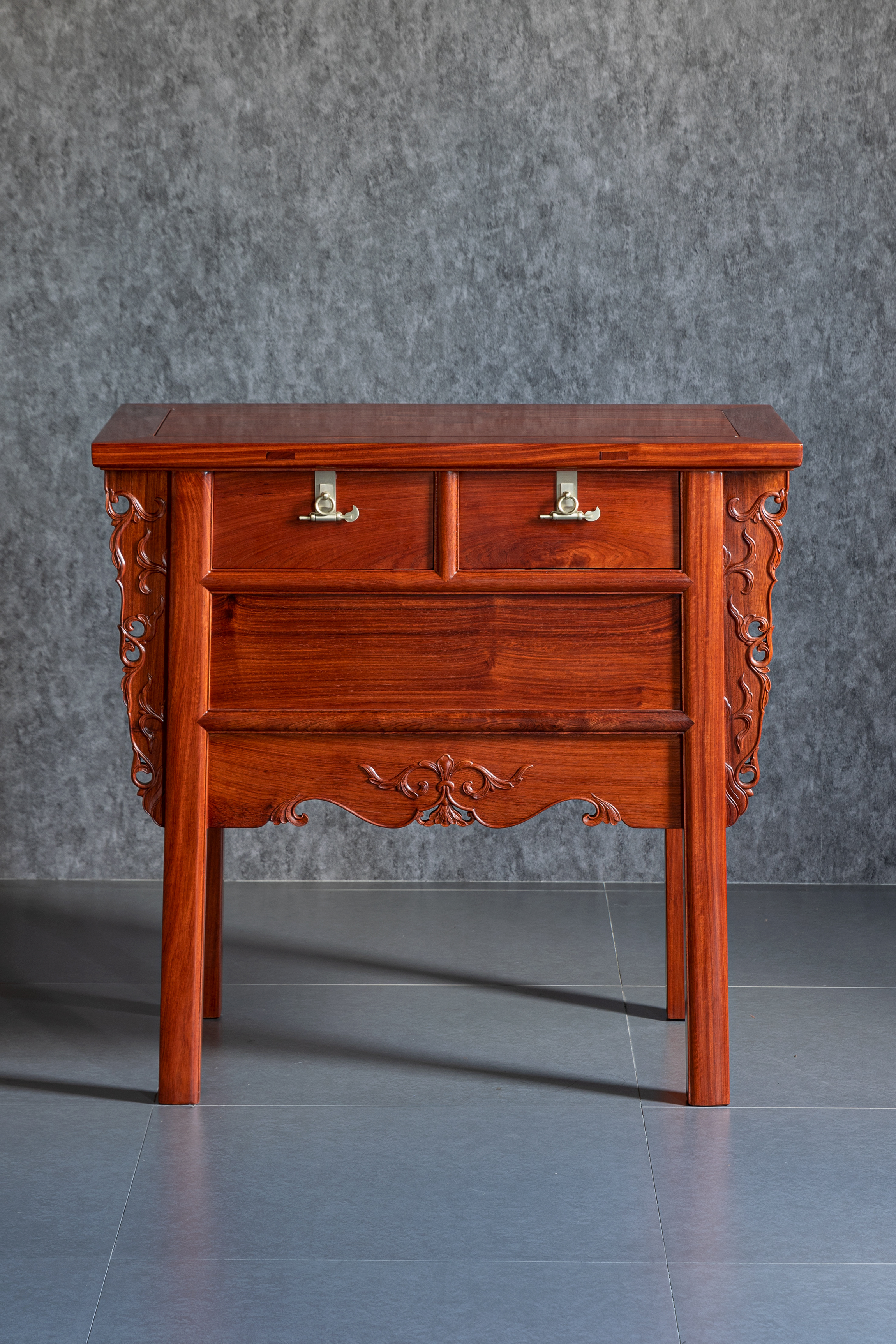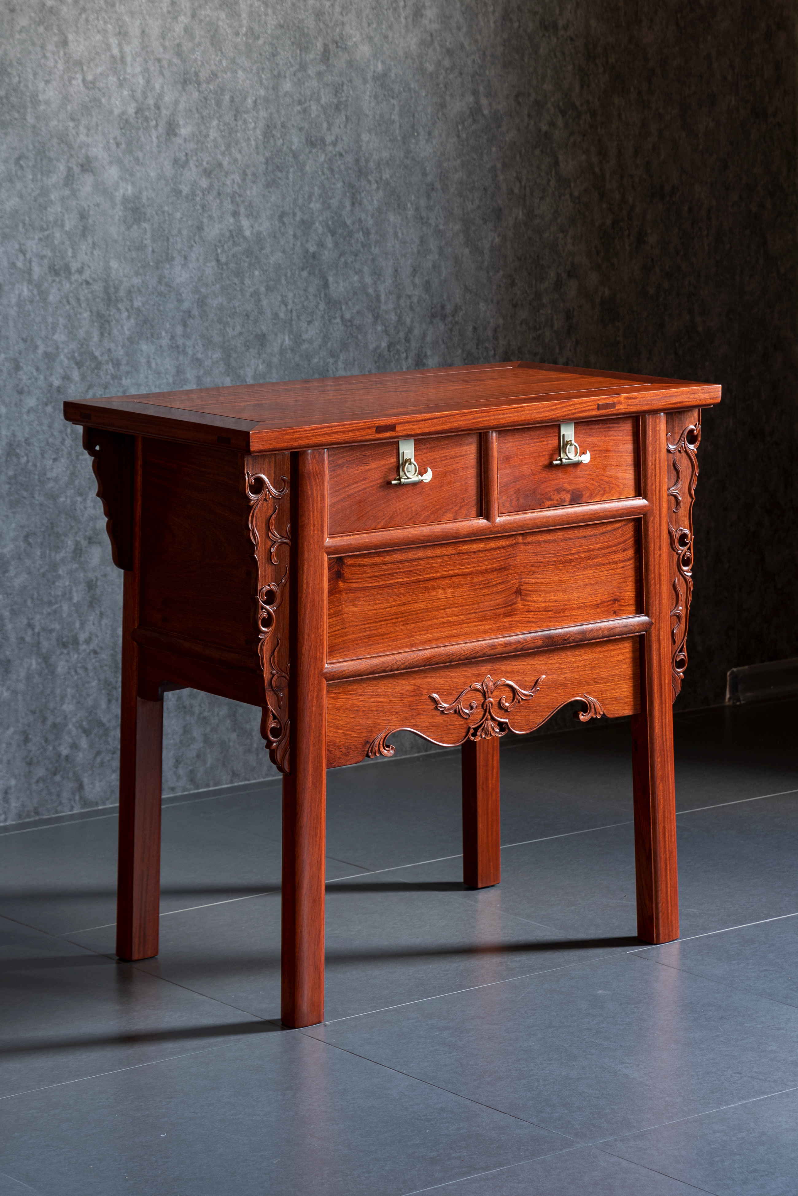 整体淳朴涵秀,攒框镶面心,大边出半透榫,冰盘沿舒敛洗练,侧面框下如暗槽,搬动趁手,设抽屉两具,安铜活,屉下有闷仓,将抽屉完全拉开后可纳藏私人珍罕;前脸壸门式牙条,凤凰点头姿态的卷草纹托角牙子,线条柔和,华丽贵气,打破了屉面及立墙的沉闷感;四足方材外撇,两侧枨下安素刀牙,缅花复刻循原物做法,原汁原味,韵真型实。