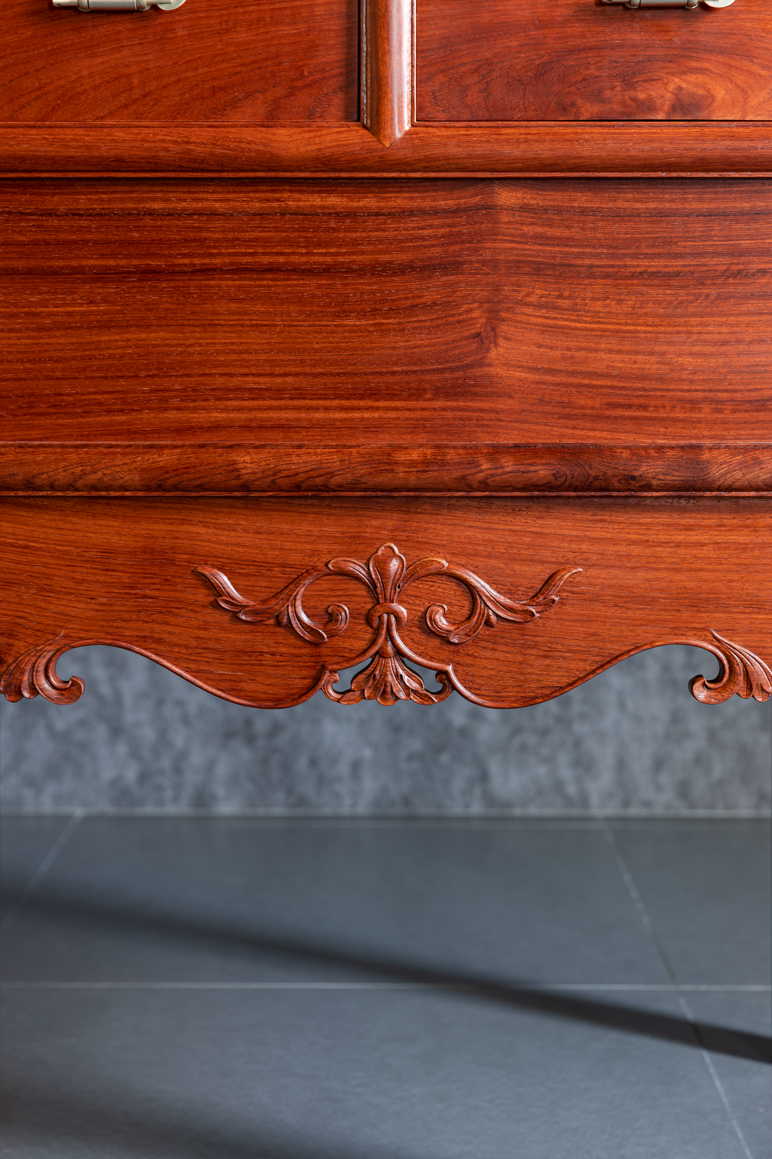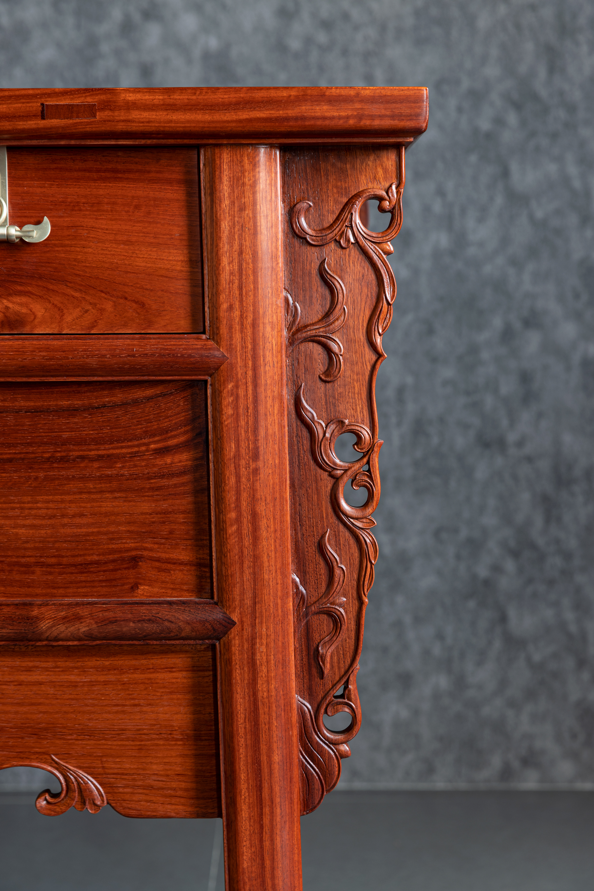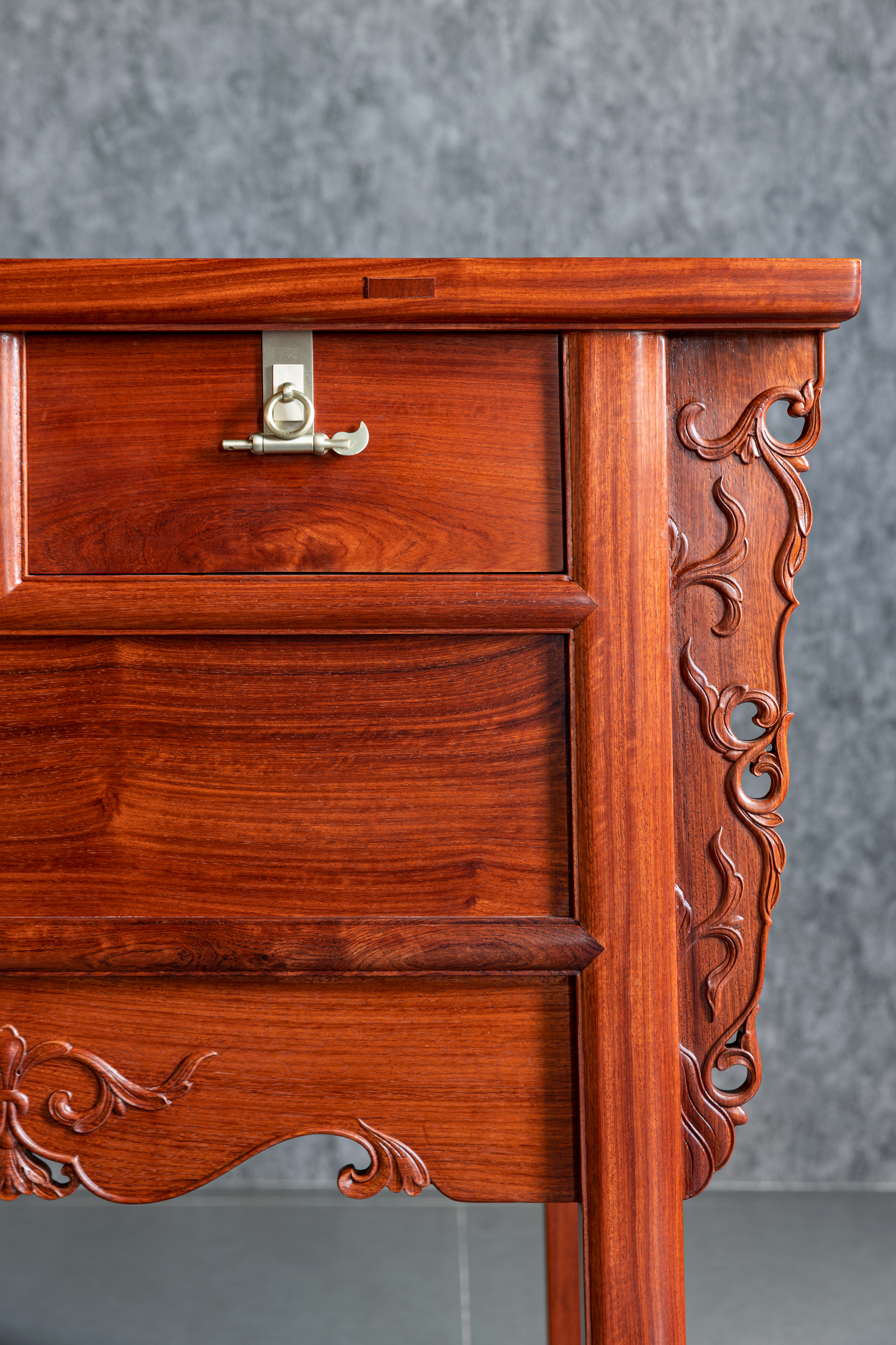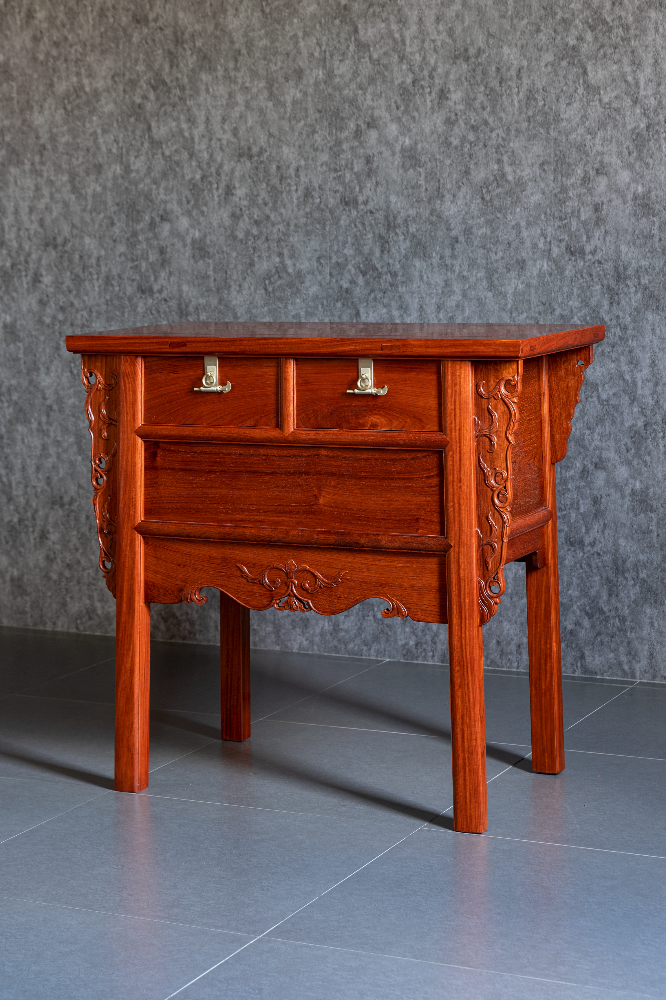 整体淳朴涵秀,攒框镶面心,大边出半透榫,冰盘沿舒敛洗练,侧面框下如暗槽,搬动趁手,设抽屉两具,安铜活,屉下有闷仓,将抽屉完全拉开后可纳藏私人珍罕;前脸壸门式牙条,凤凰点头姿态的卷草纹托角牙子,线条柔和,华丽贵气,打破了屉面及立墙的沉闷感;四足方材外撇,两侧枨下安素刀牙,缅花复刻循原物做法,原汁原味,韵真型实。
