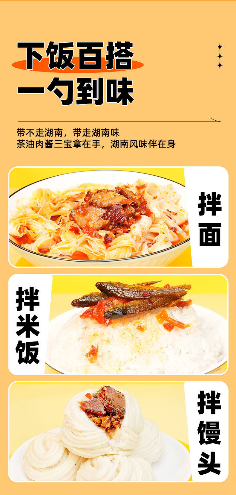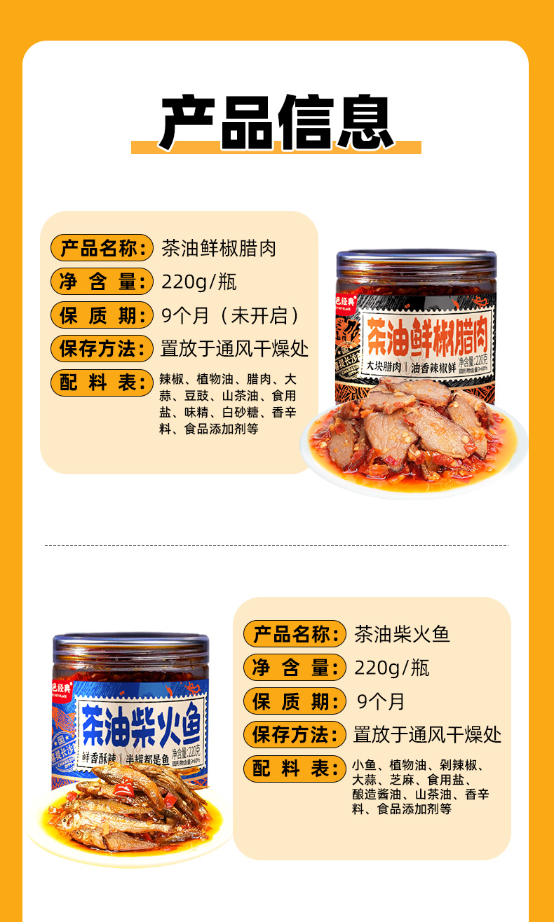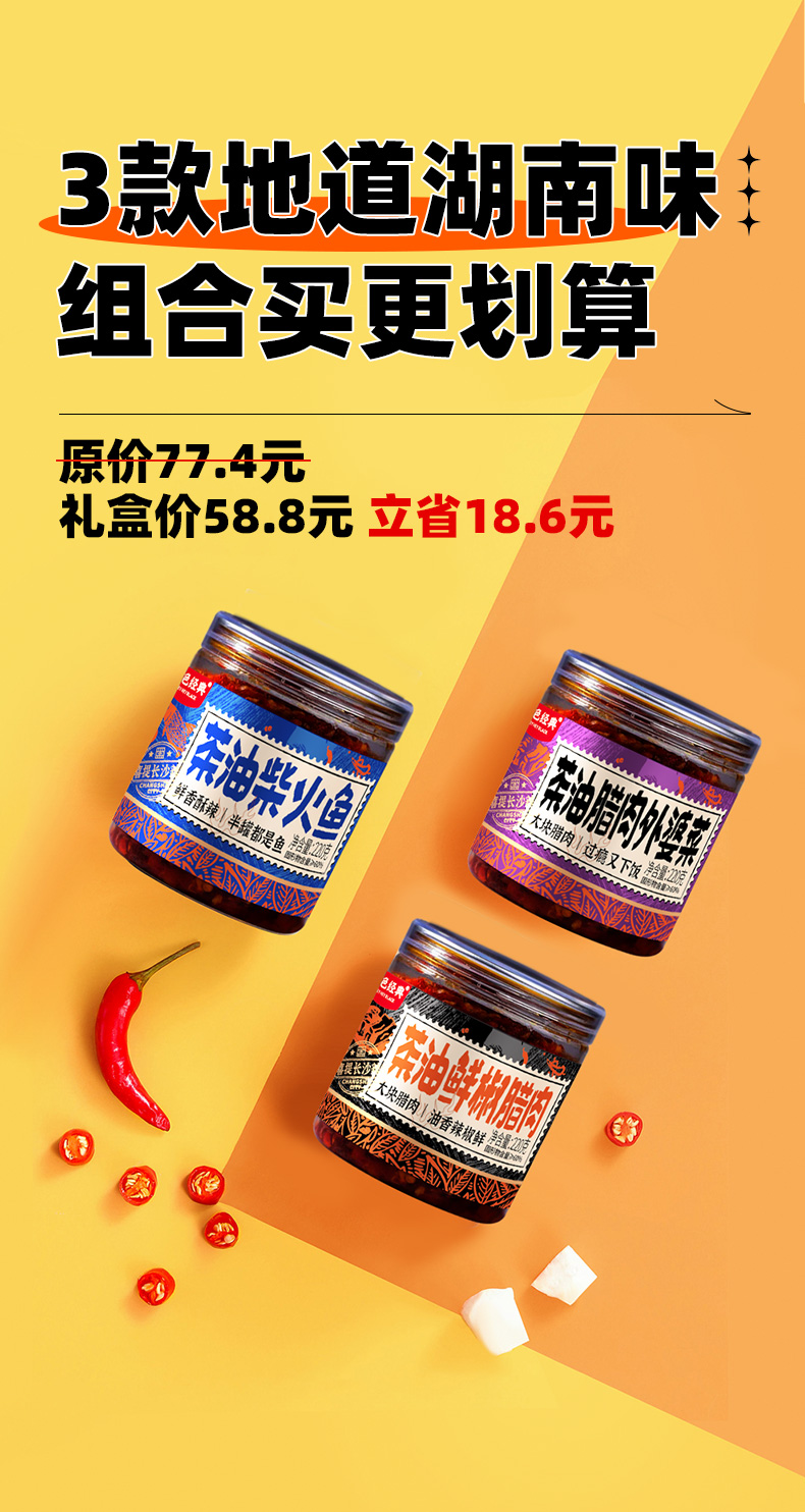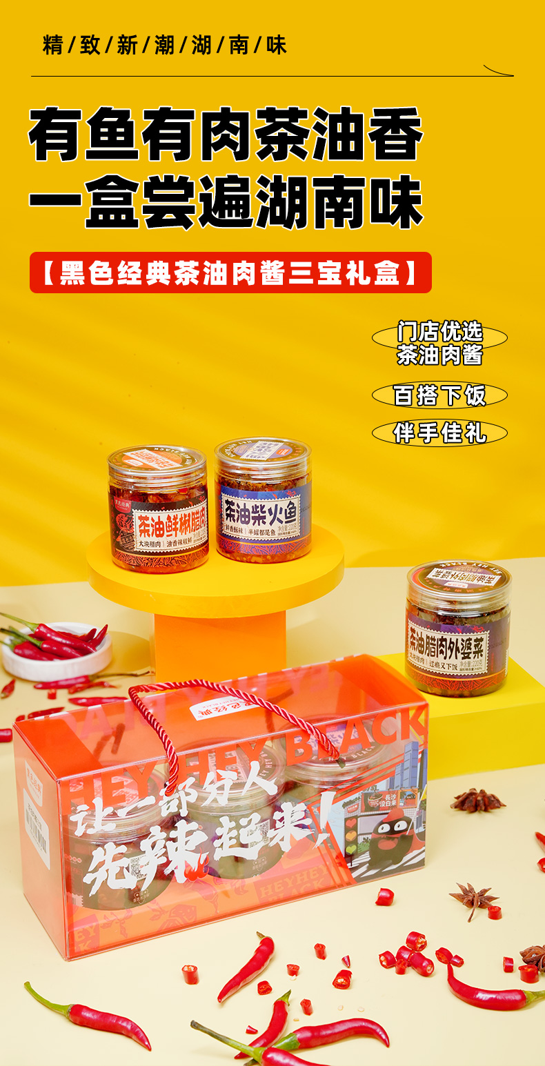 【辣酱伴手礼】茶油肉酱三宝套餐精致礼盒装(茶油鲜椒腊肉+茶油柴火鱼+茶油腊肉外婆菜)220g/瓶*3