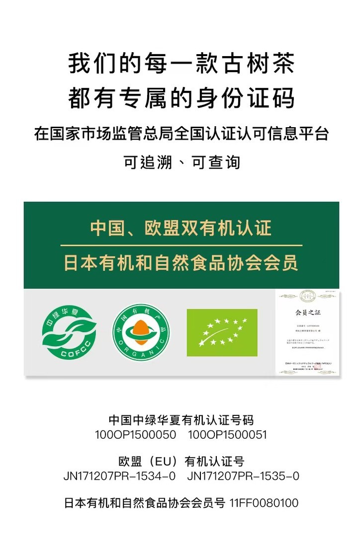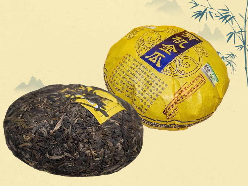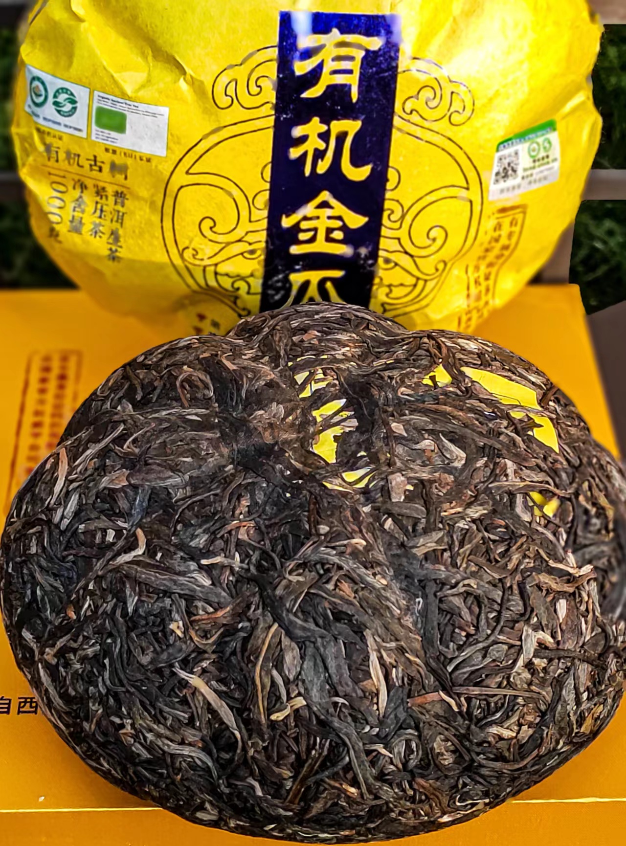 有机金瓜古树普洱生茶精选有机古树茶园百年树龄的古树茶,以2021年采摘的云南乔木大叶种纯料古树茶为原料,在有机干仓内历时两年的有机转化,2023年有机食品生产专线压制而成。