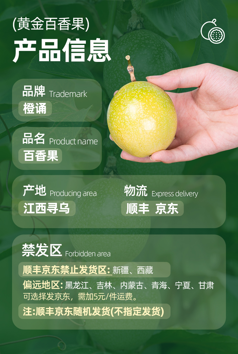 【品名】江西寻乌黄金百香果 【储存方法】请置于阴凉干燥处 【产地】江西省赣州市寻乌县 【发货地】江西省赣州市寻乌县 【发货快递】顺丰/京东 【不发货区域】新疆,西藏,青海,甘肃,宁夏,黑龙江,吉林,内蒙古,港澳台地区不发 【发货时效】48小时,下雨节假日顺延 |