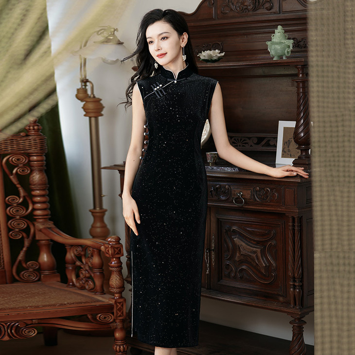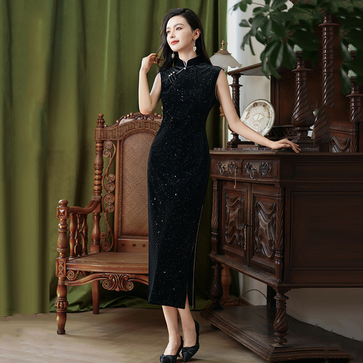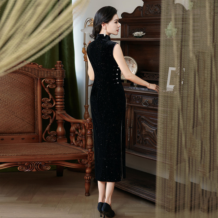 老上海复古修身无袖烫金丝绒高级感ZQ60563