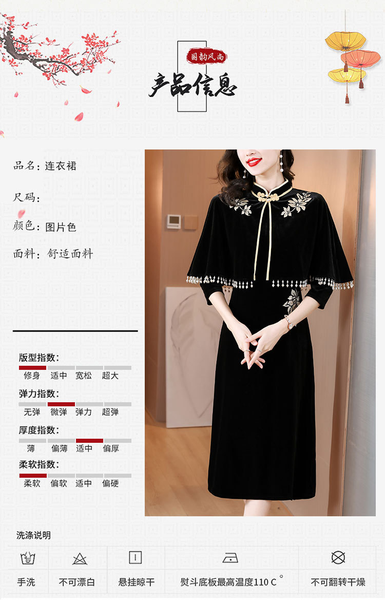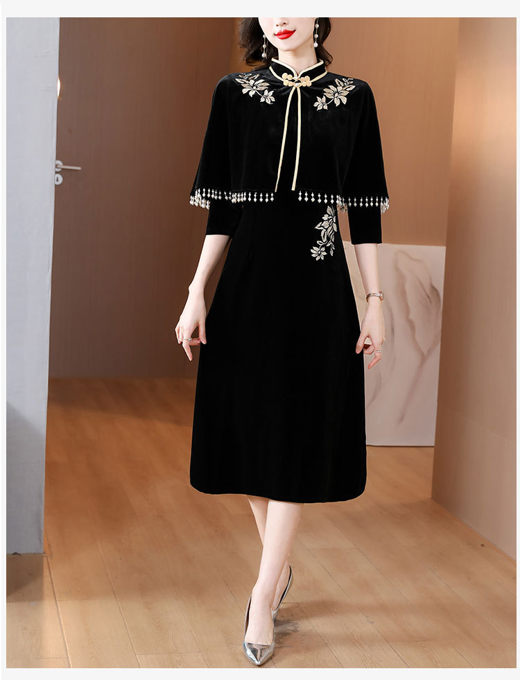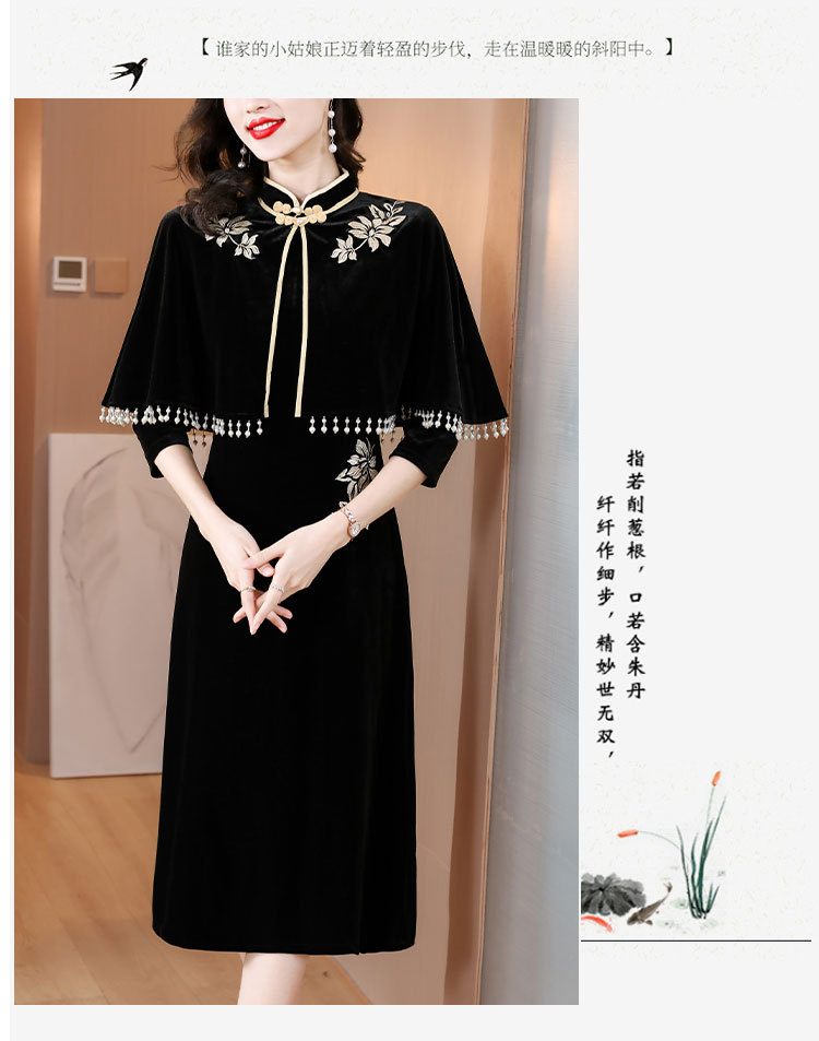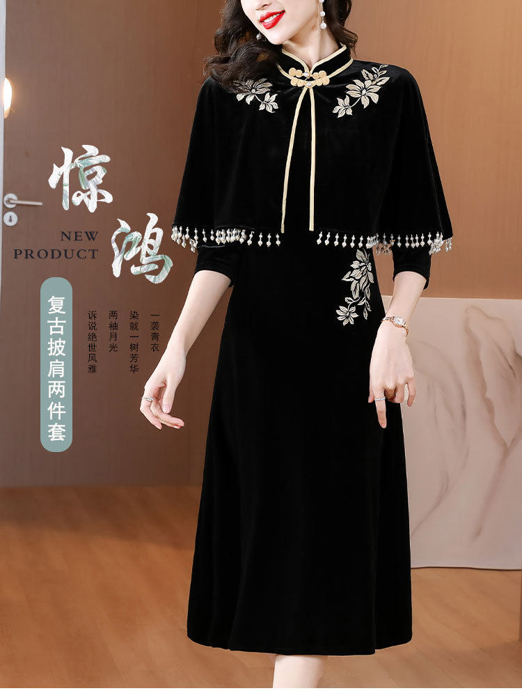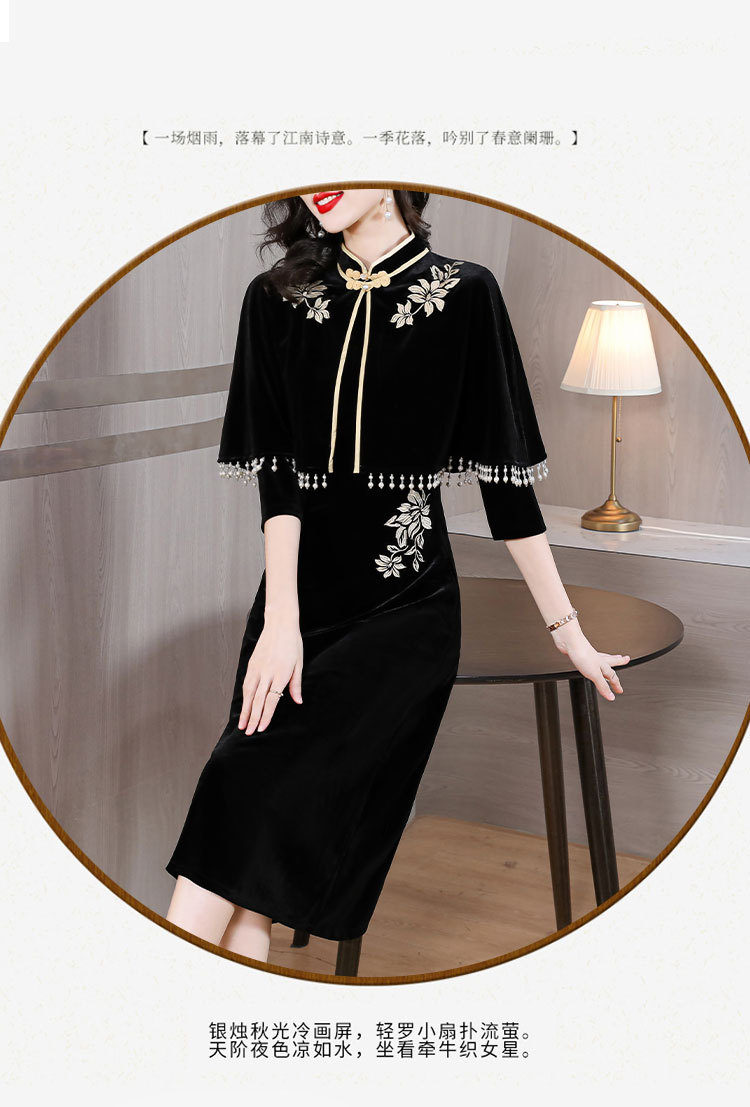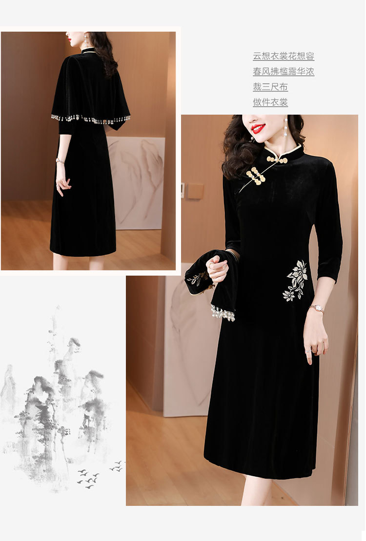 DD-金丝绒刺绣改良旗袍披肩连衣裙女2023秋冬新款时尚洋气减龄中长裙