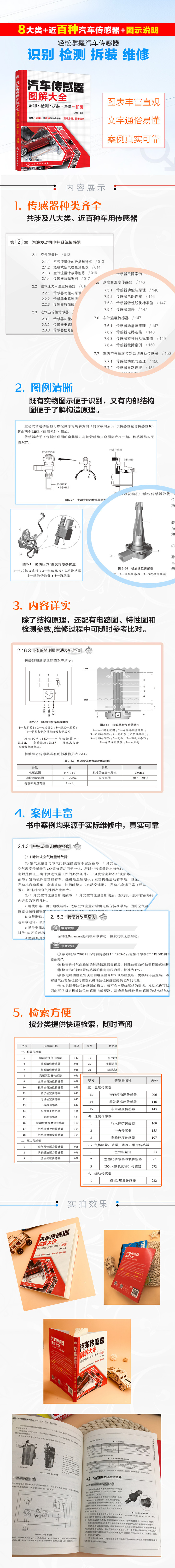 内容编排用心:既有实物图示便于识别,又有内部结构图示方便了解构造原理,更搭配有传感器特性图和检测参数,方便维修诊断参考。