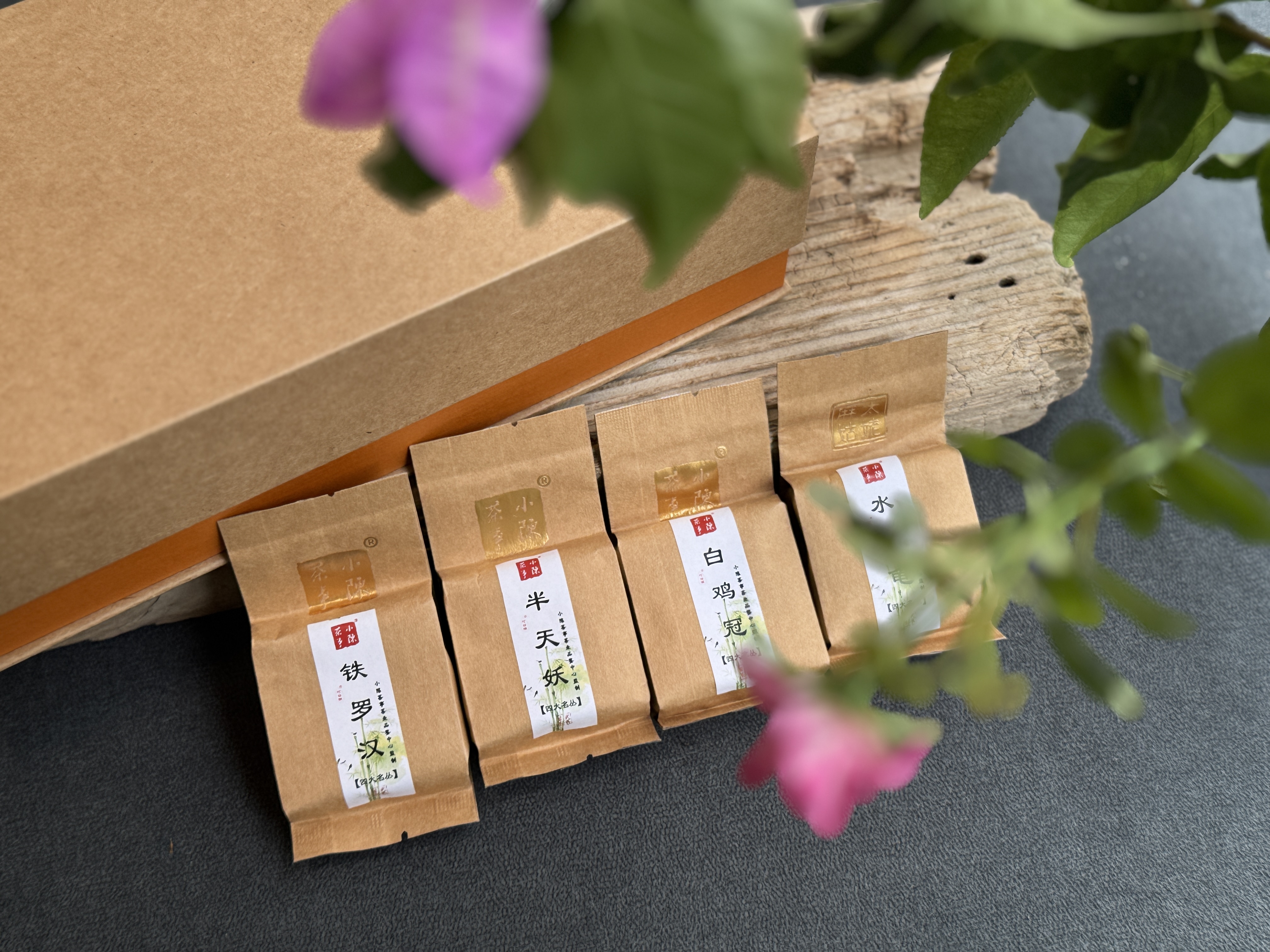 是了,它们是铁罗汉、水金龟、半天妖和白鸡冠四款名丛组成的武夷岩茶组合——“四大名丛”。