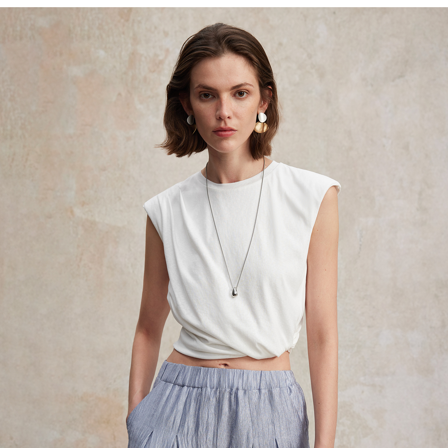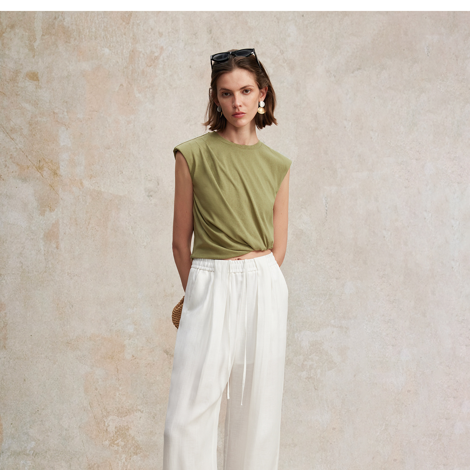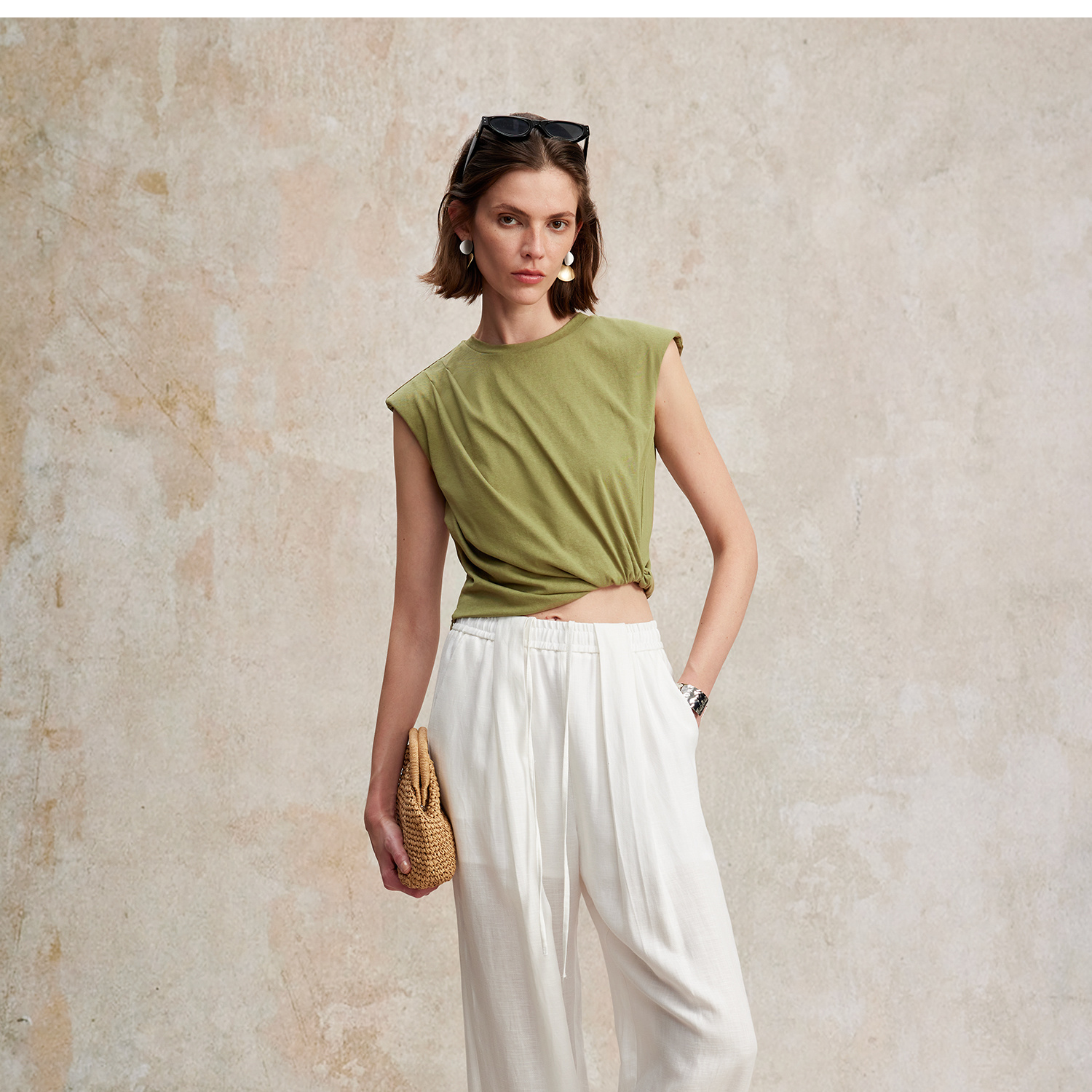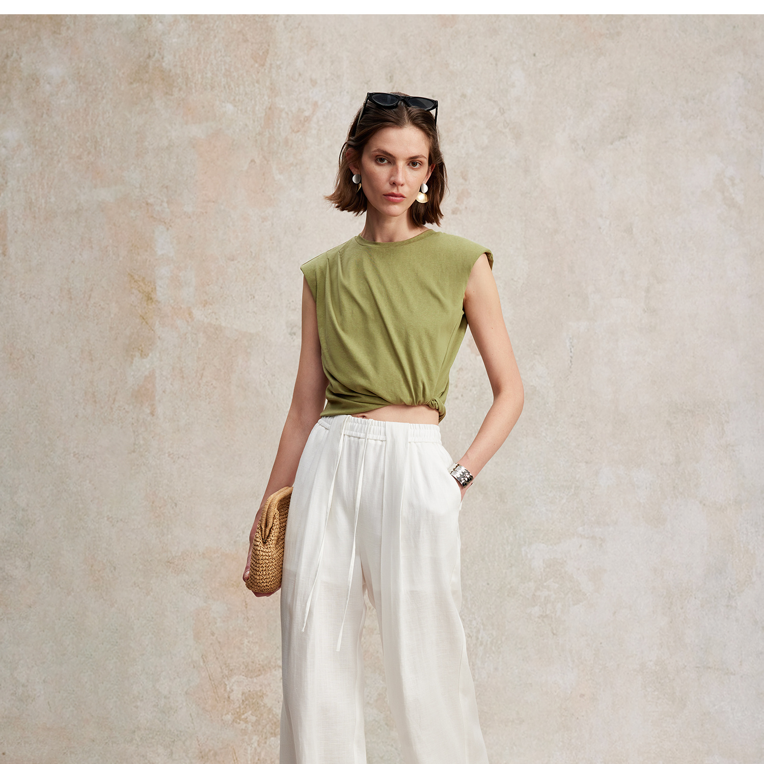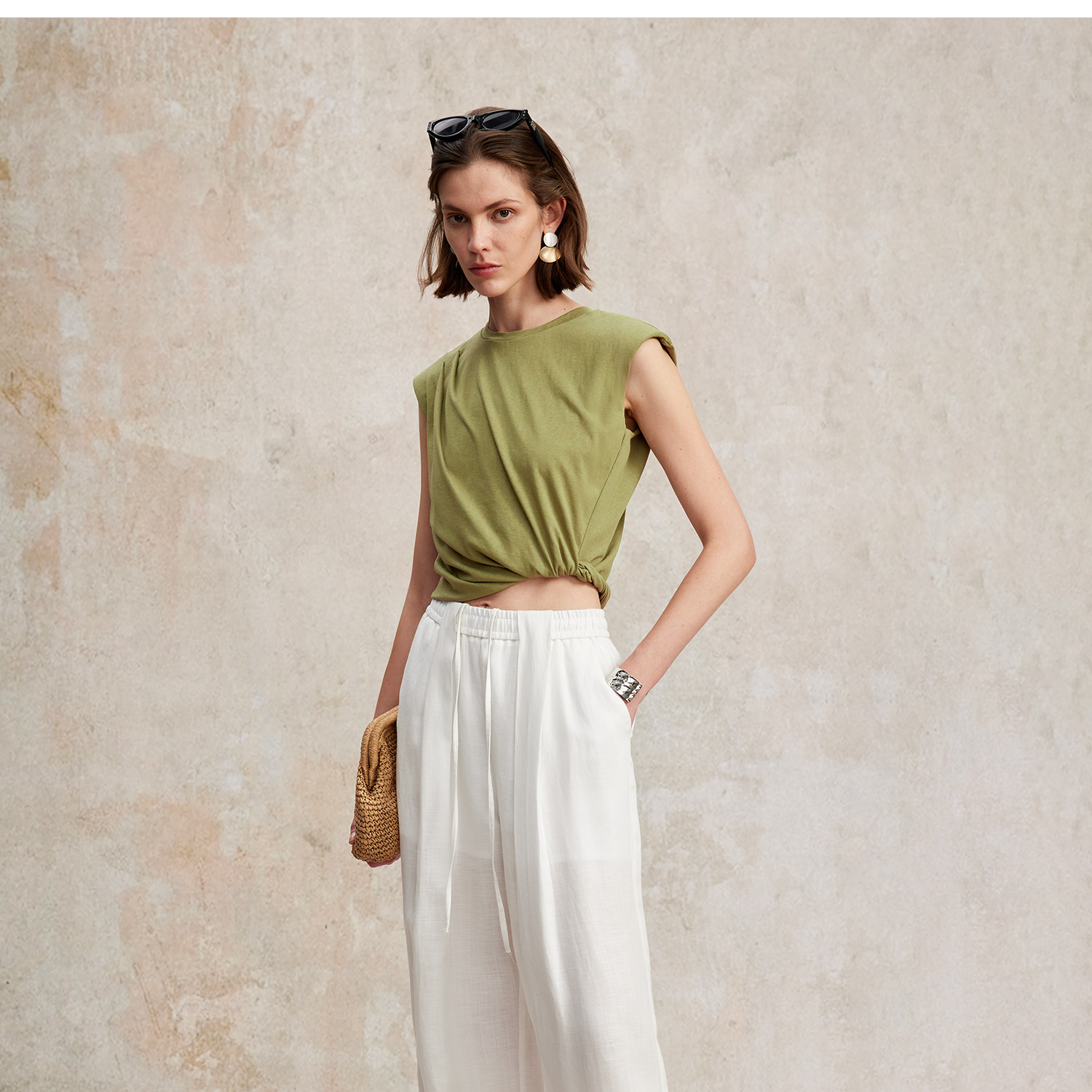 亚麻棉宽肩无袖扭结短款T恤T2502037