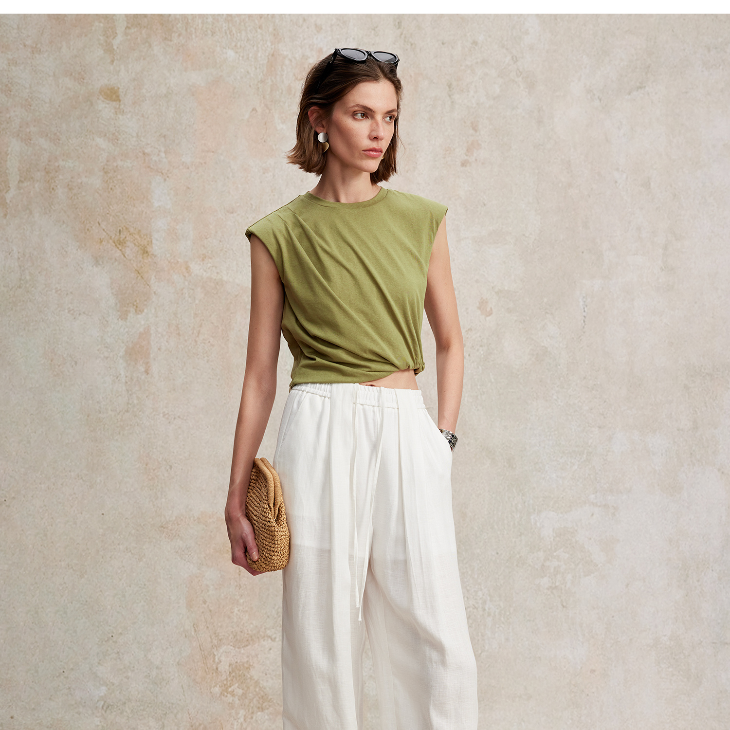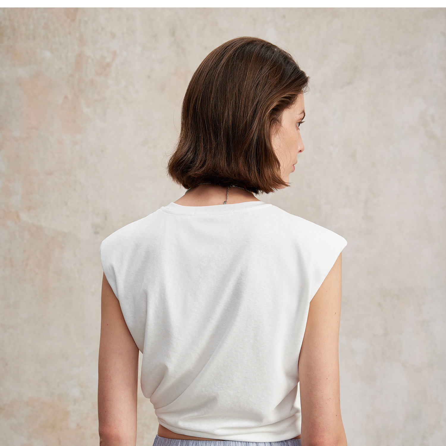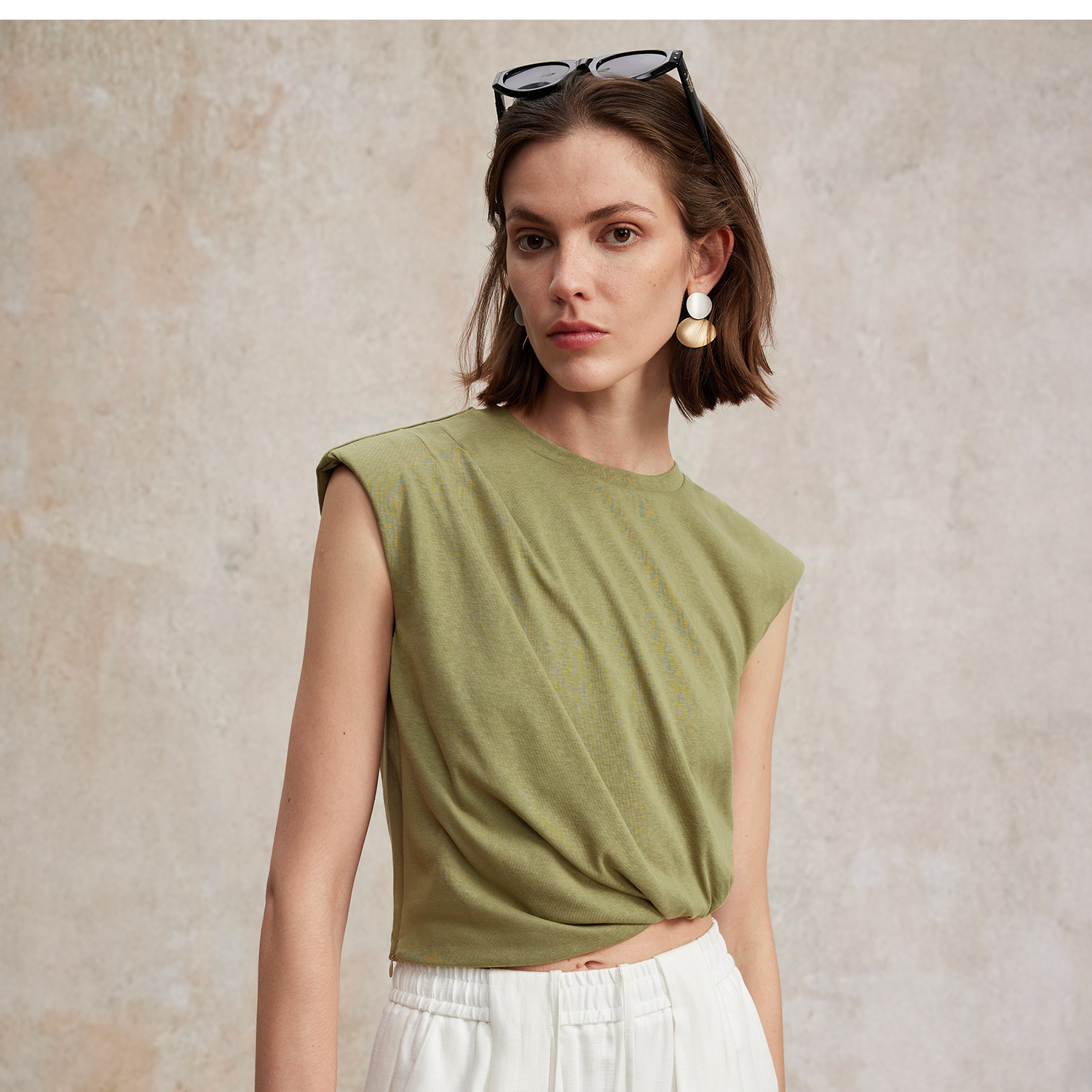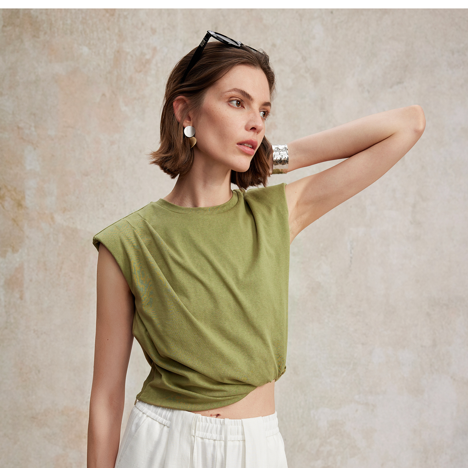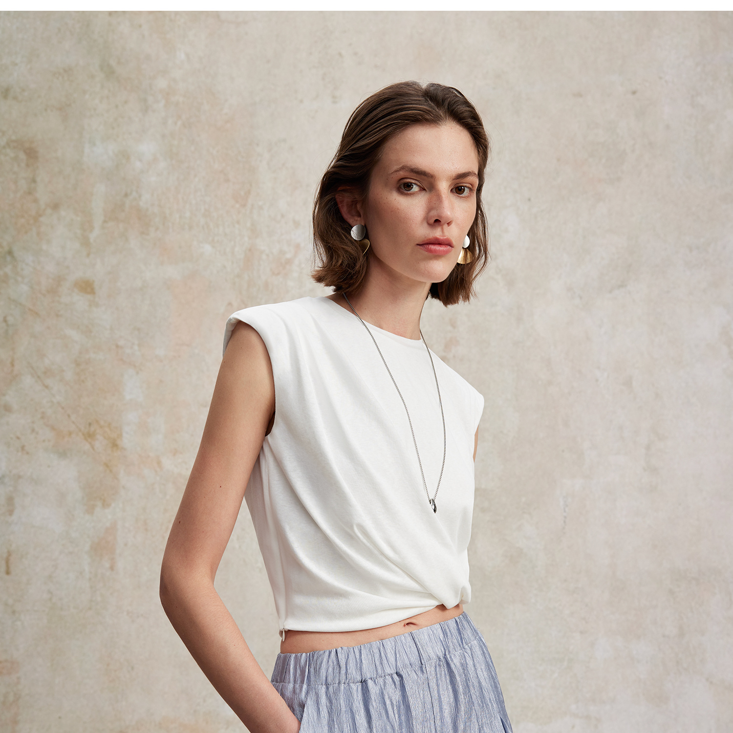 亚麻棉宽肩无袖扭结短款T恤T2502037
