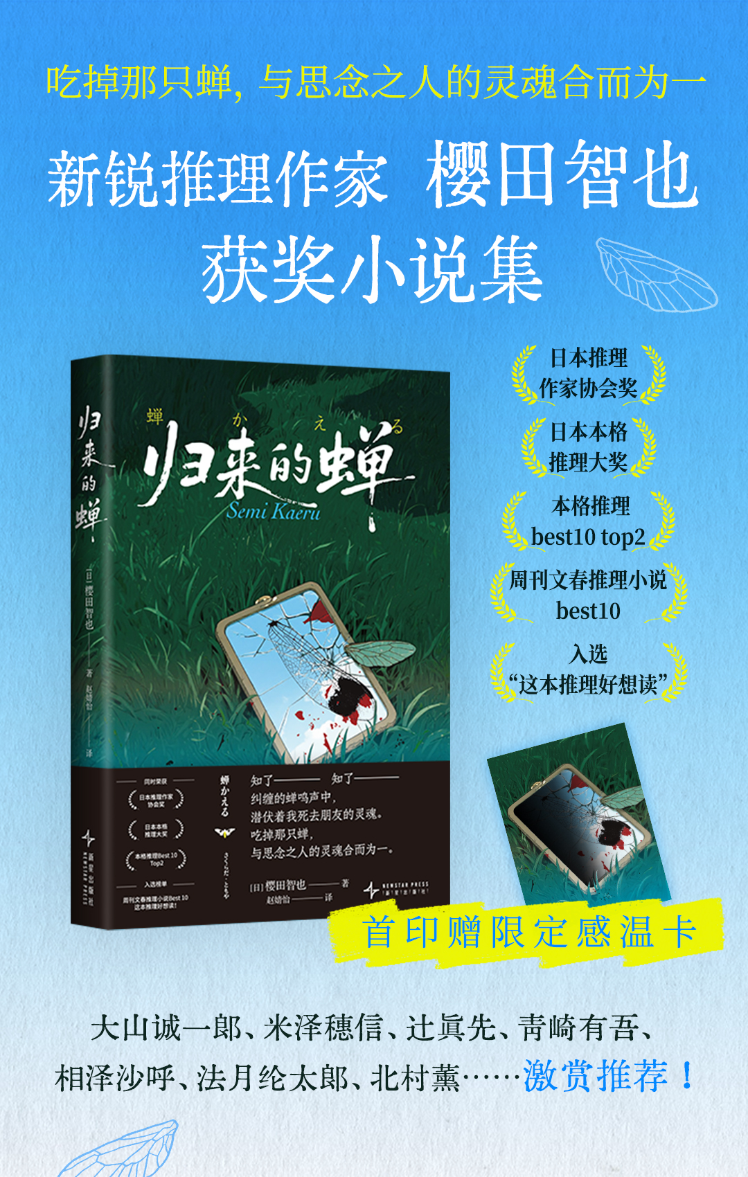 樱田智也,1977年出生于北海道,硕士毕业于埼玉大学。2013年,以《探照灯与诱蛾灯》获第十届推理新人奖,2017年,发表同名短篇小说集。2018年,该书收录的《火与标本》入围第71届日本推理作家协会奖(短篇类)。2020年,本书收录的《小町蜘蛛》入围第73届日本推理作家协会奖(短篇类)。2021年,作品《归来的蝉》同时获得第74届日本推理作家协会奖与第21届日本本格推理大奖。