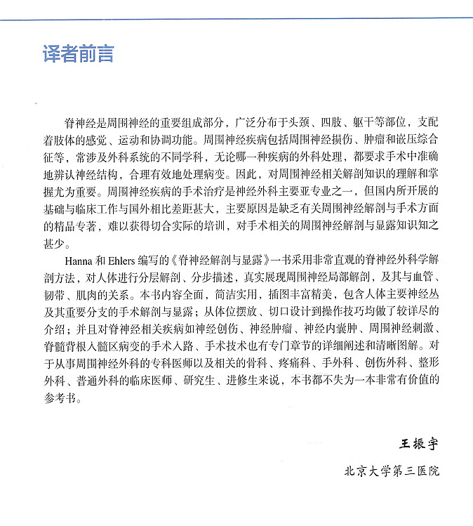 本书对了解脊神经解剖与手术入路很好有帮助,尤其适合年轻医生作为基础读物。目前靠前还没有相关的著作出版。本书可供神经外科医生、骨科医生、麻醉科医生、疼痛科医生、超声科医生参考。