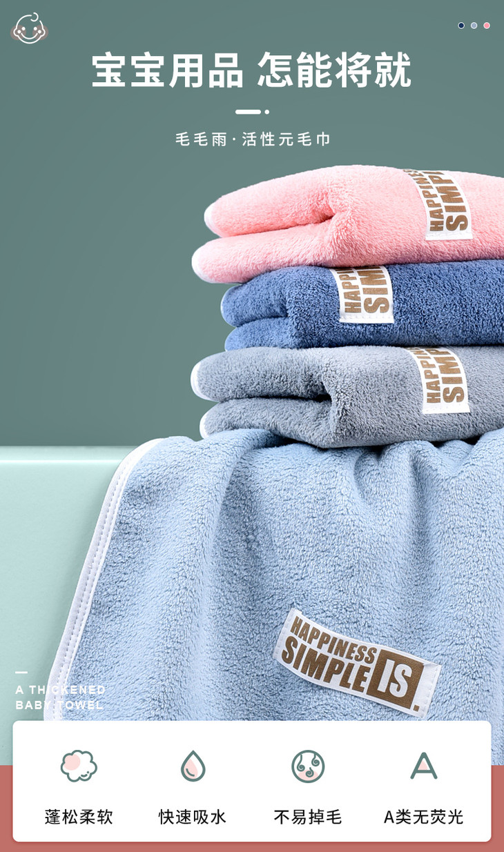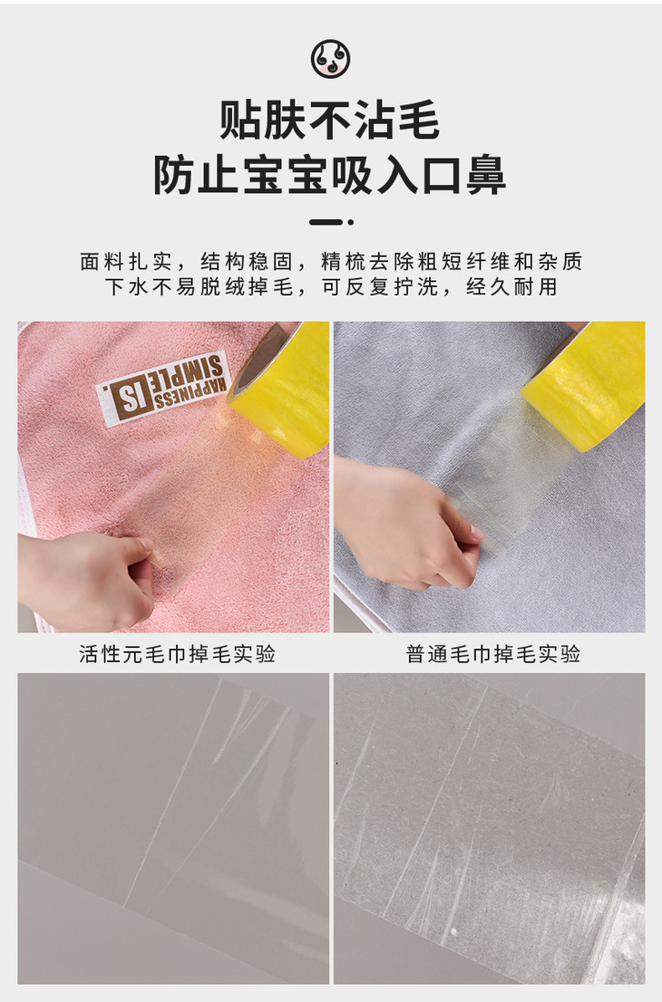 无论是对于大人还是宝宝来说,在选择毛巾时,不但要柔软、吸水的,还要找不掉毛、不掉色,安全性高的。
