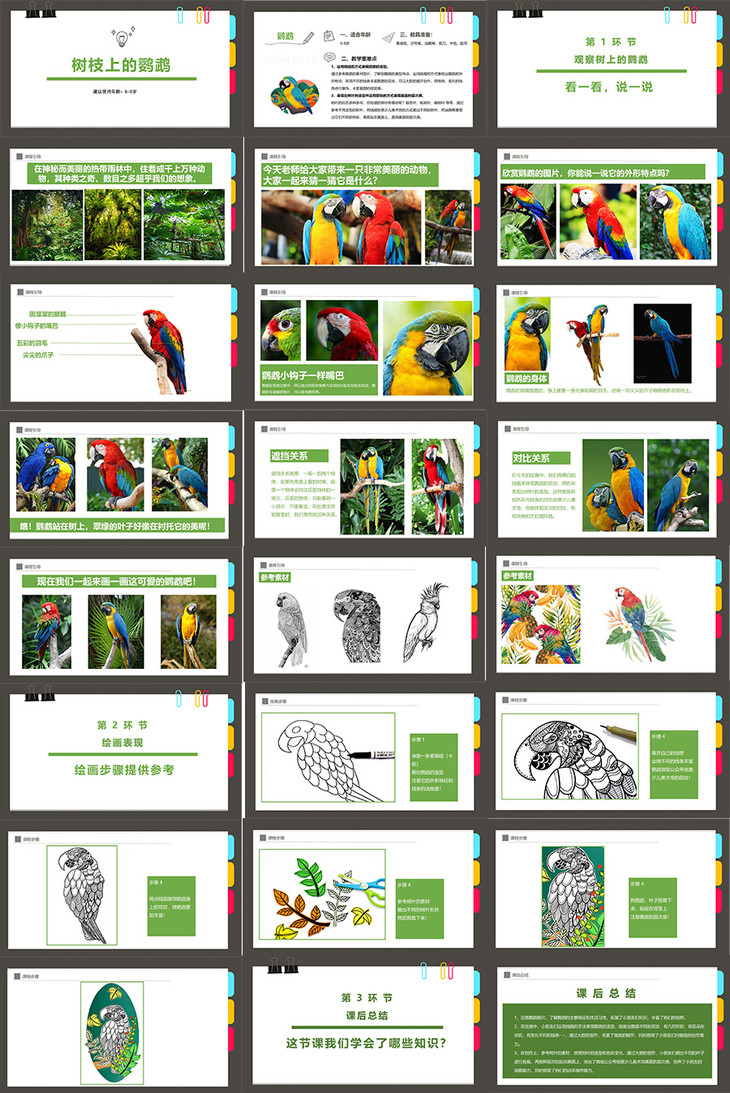 通过参考鹦鹉的素材图片,了解到鹦鹉的典型特点,运用线描的方式表现出鹦鹉的外形特点,再用不同的线条丰富鹦鹉的花纹,可以大胆的展开创作,用弯曲、变形的线条进行装饰,丰富画面的视觉感。