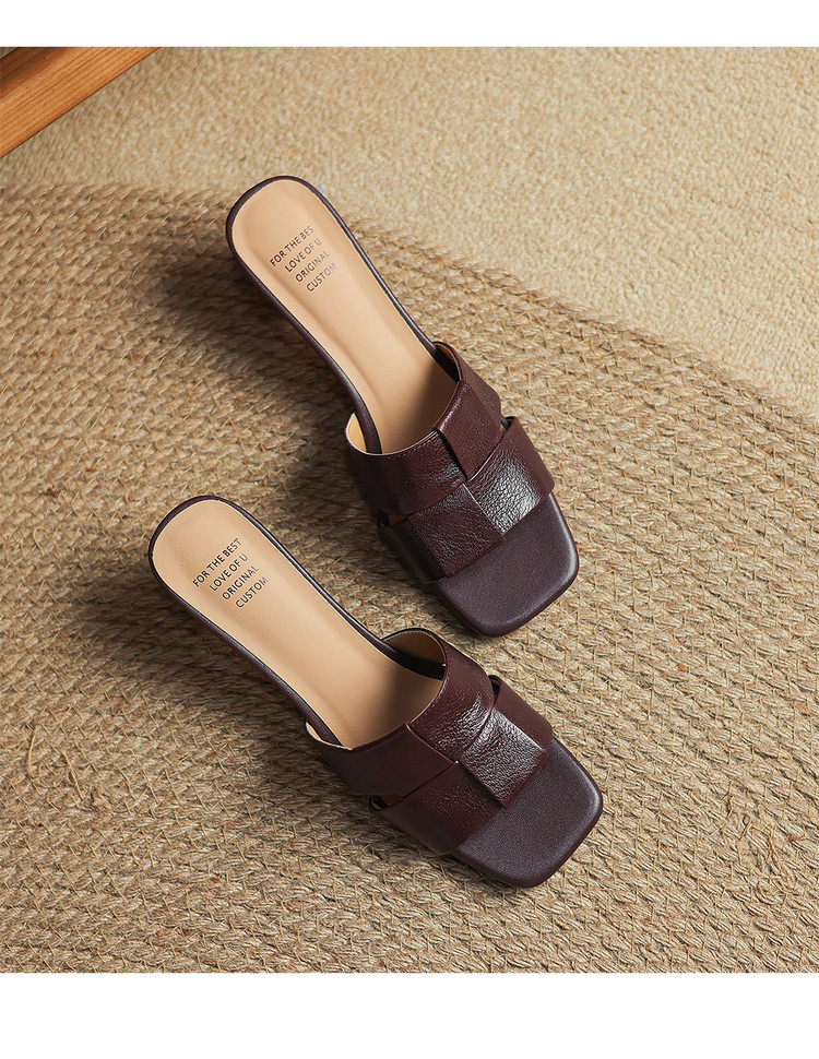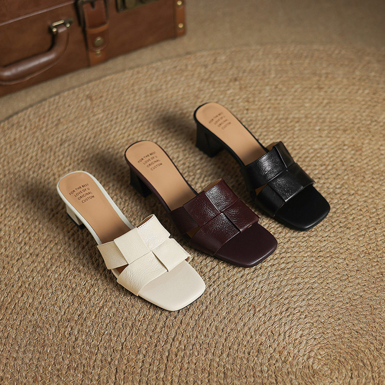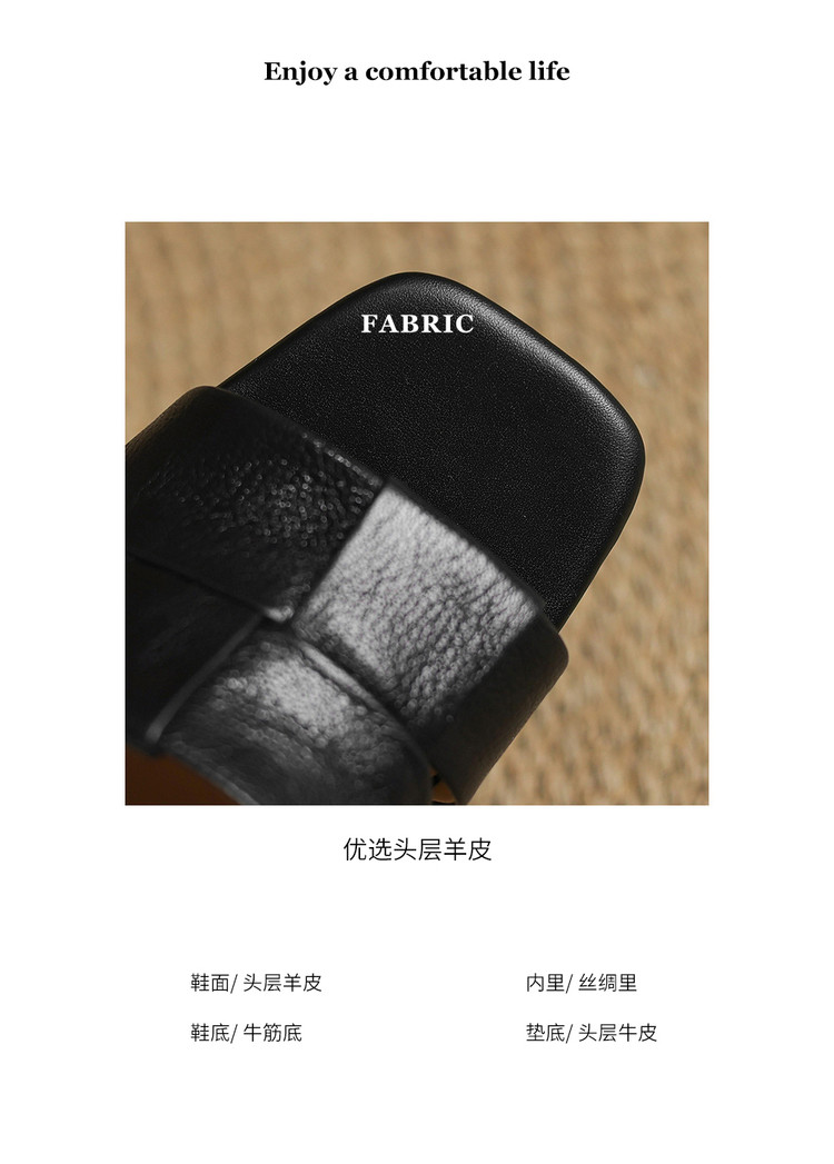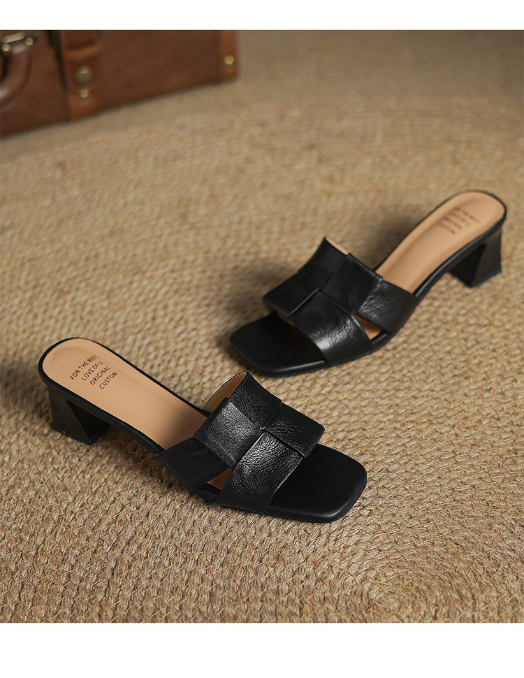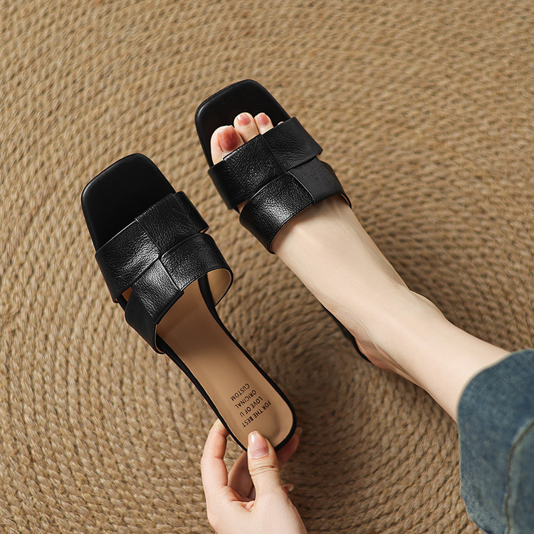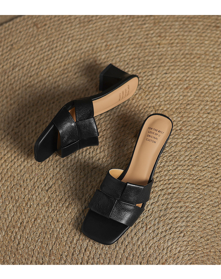 【预售5天】舒适柔软羊皮版方头粗跟凉拖鞋女外穿夏季新款软皮编织百搭中低跟拖鞋女DS&1837