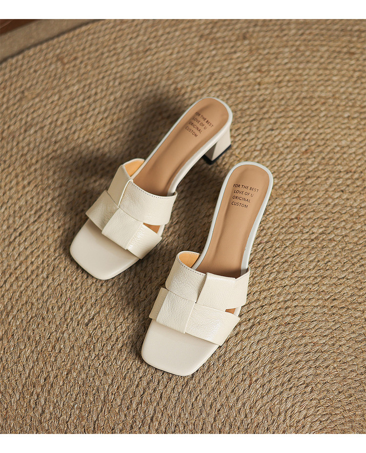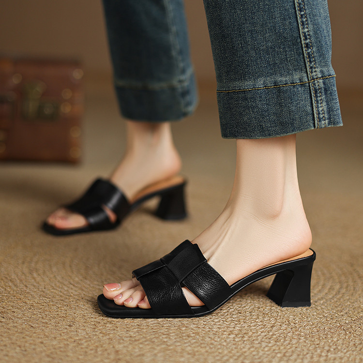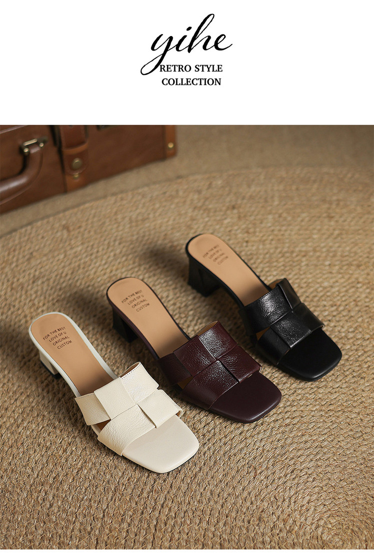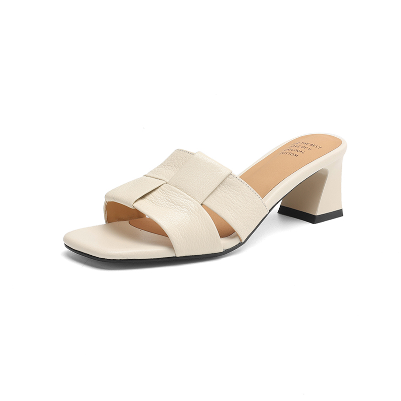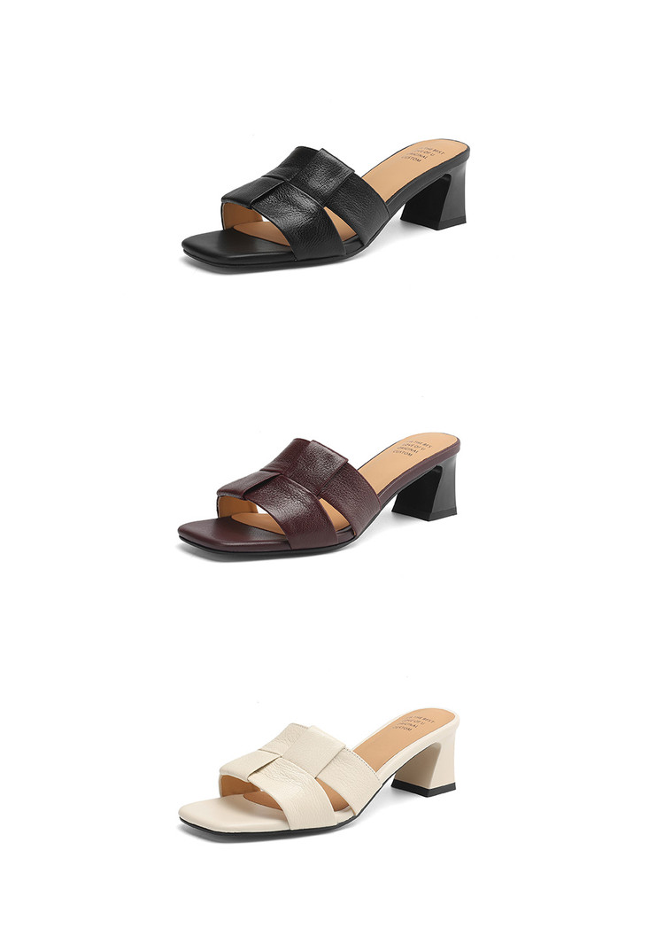 【预售5天】舒适柔软羊皮版方头粗跟凉拖鞋女外穿夏季新款软皮编织百搭中低跟拖鞋女DS&1837