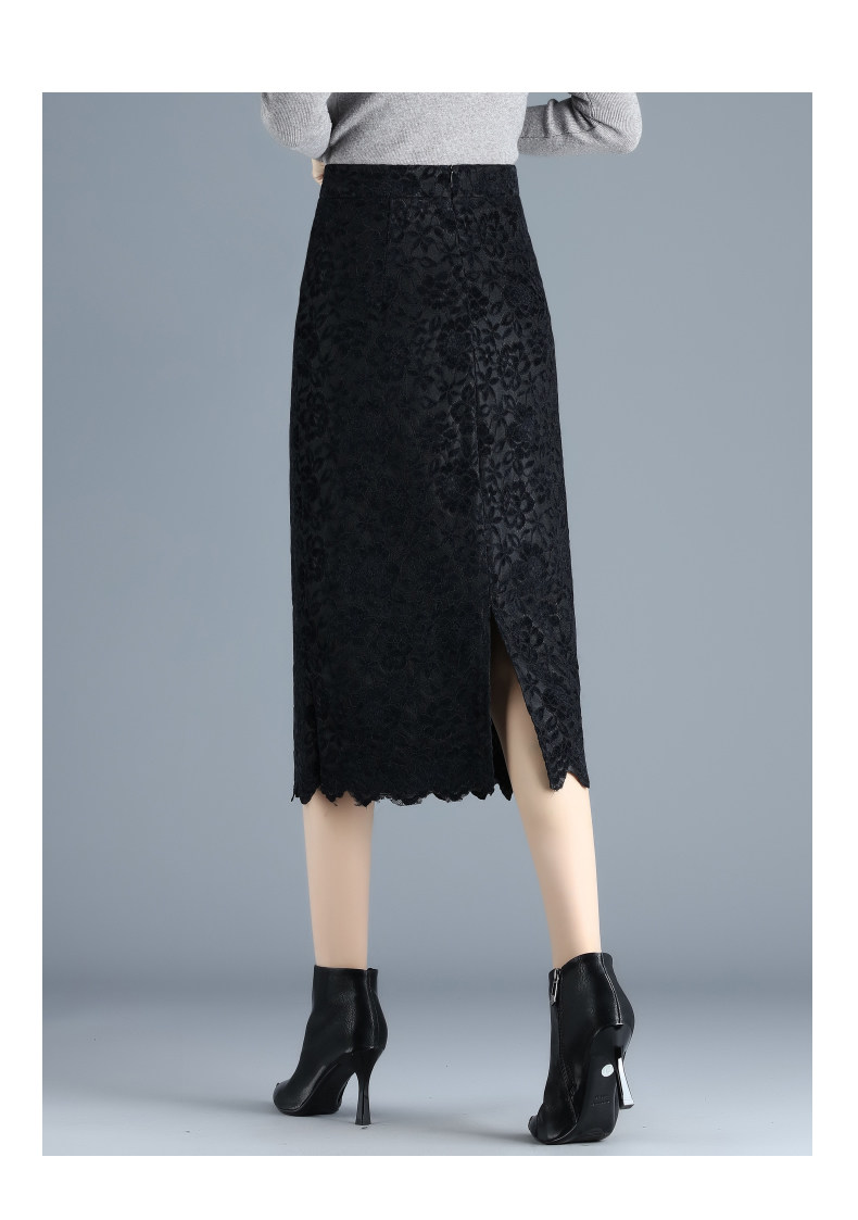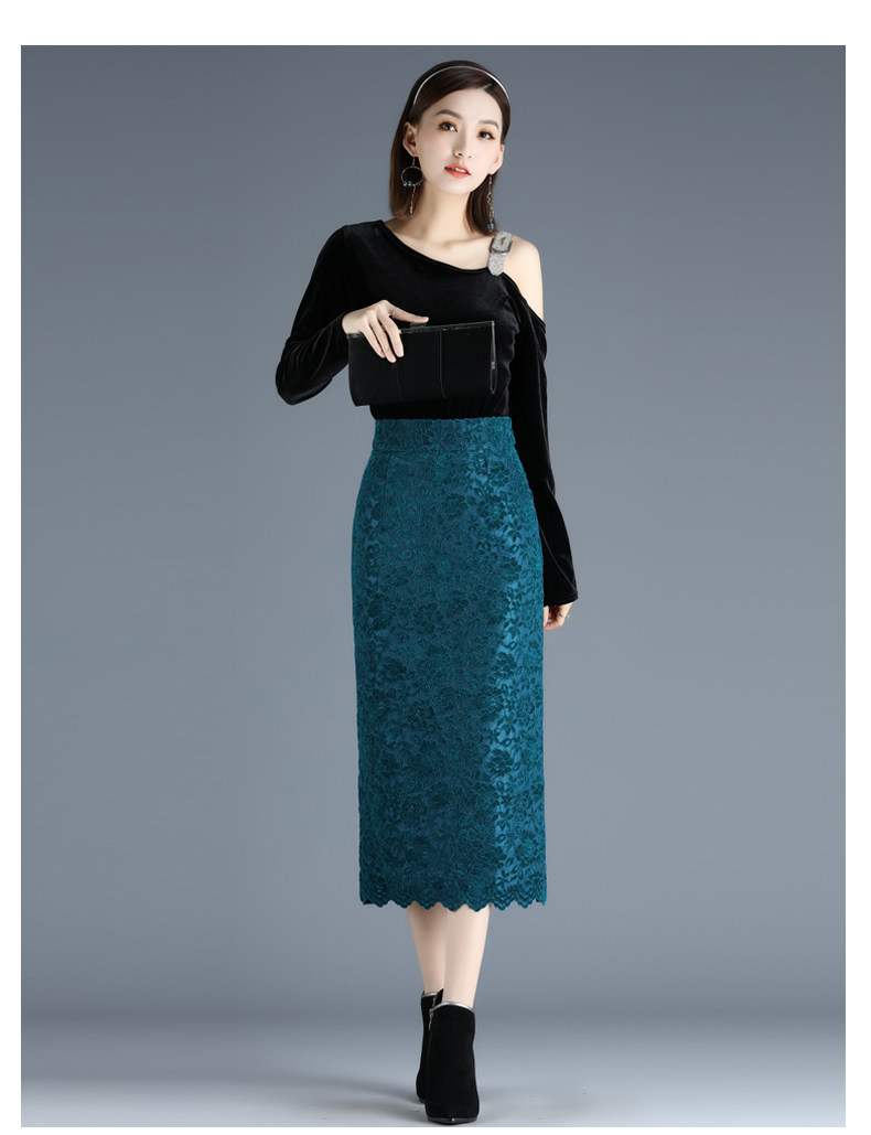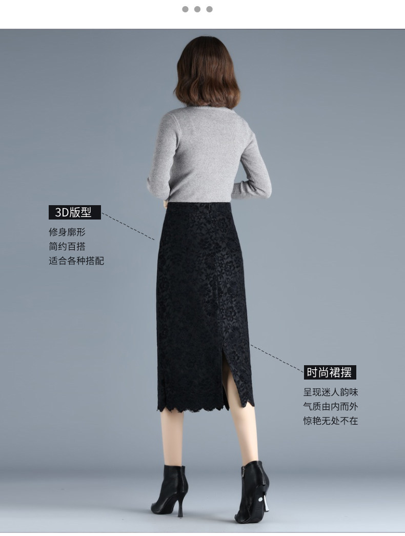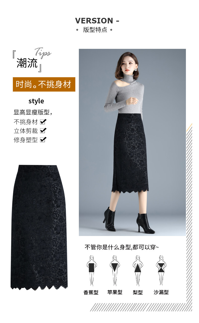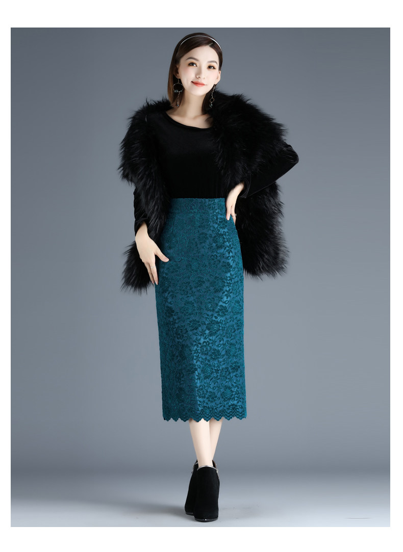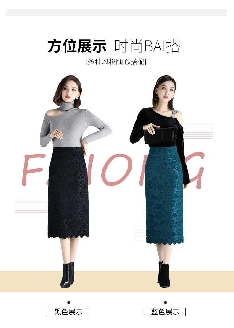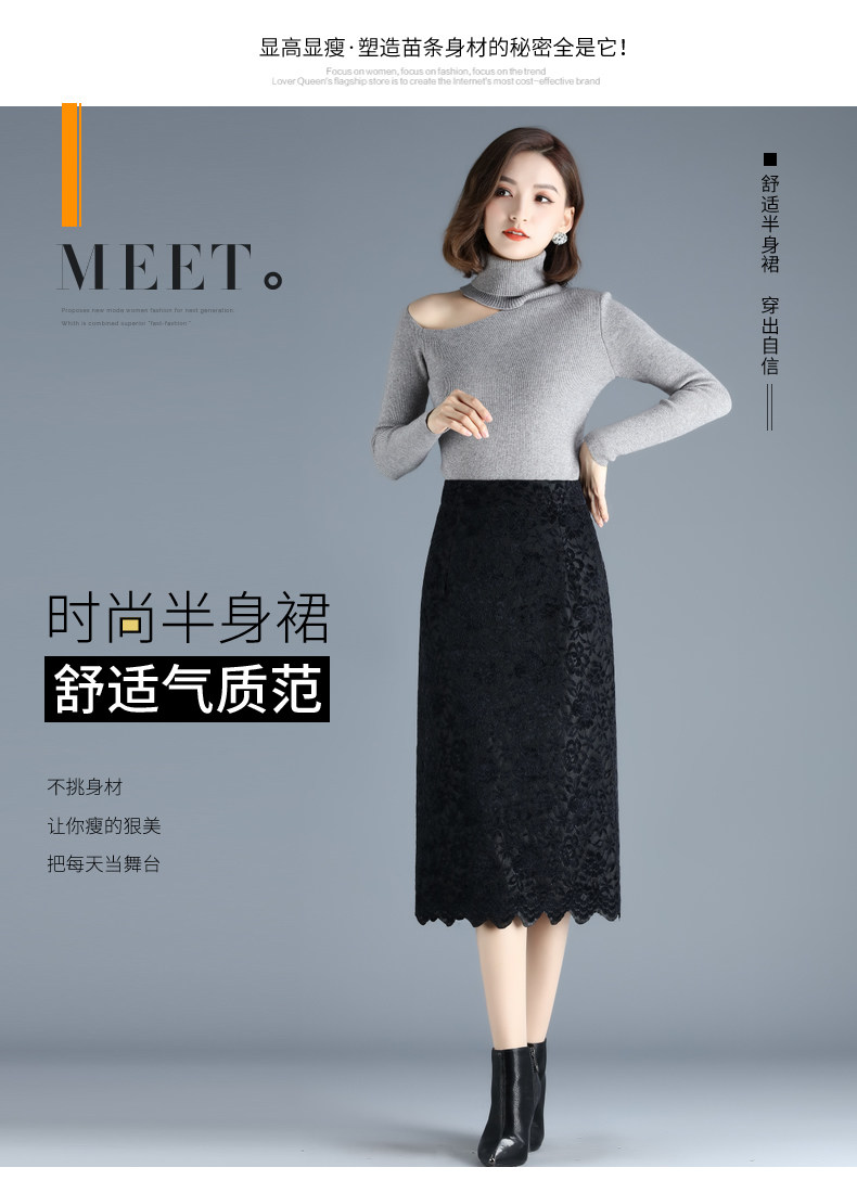 TY-8632秋冬植绒蕾丝裙半身裙女2020新款高腰修身包臀裙中长款开叉一步裙