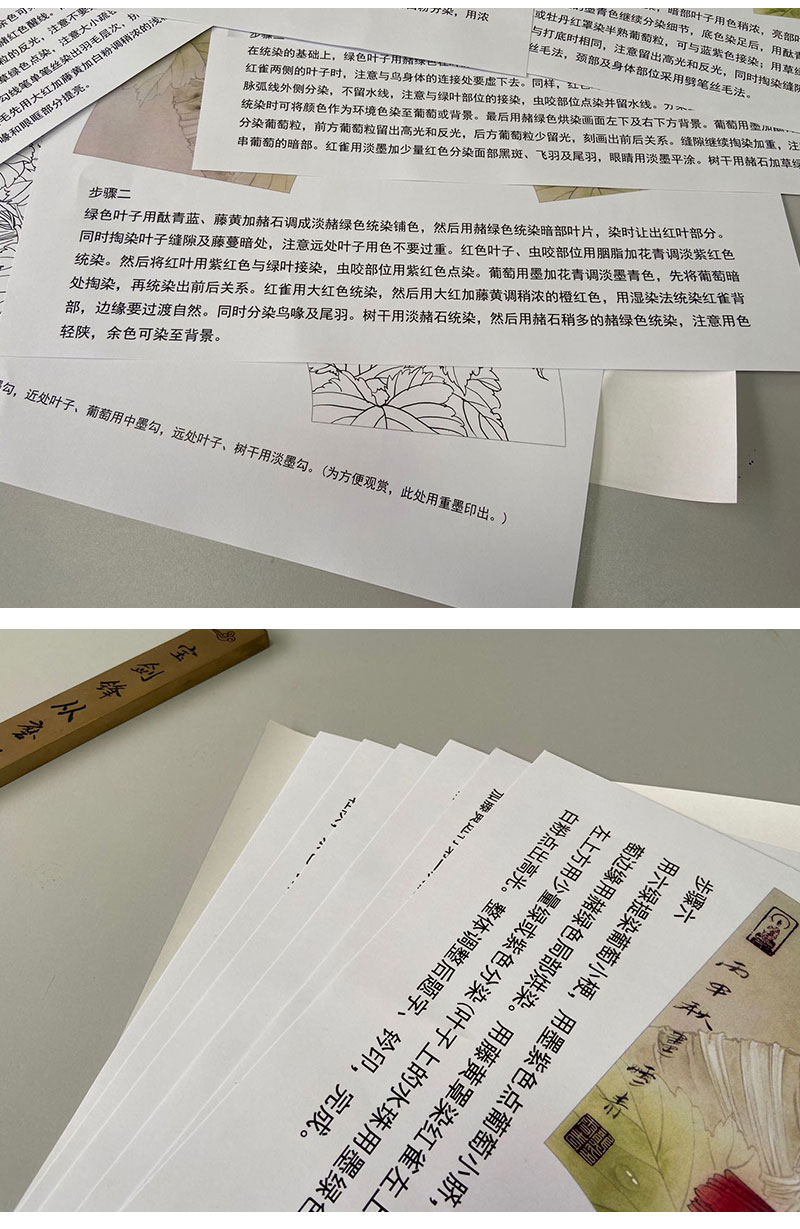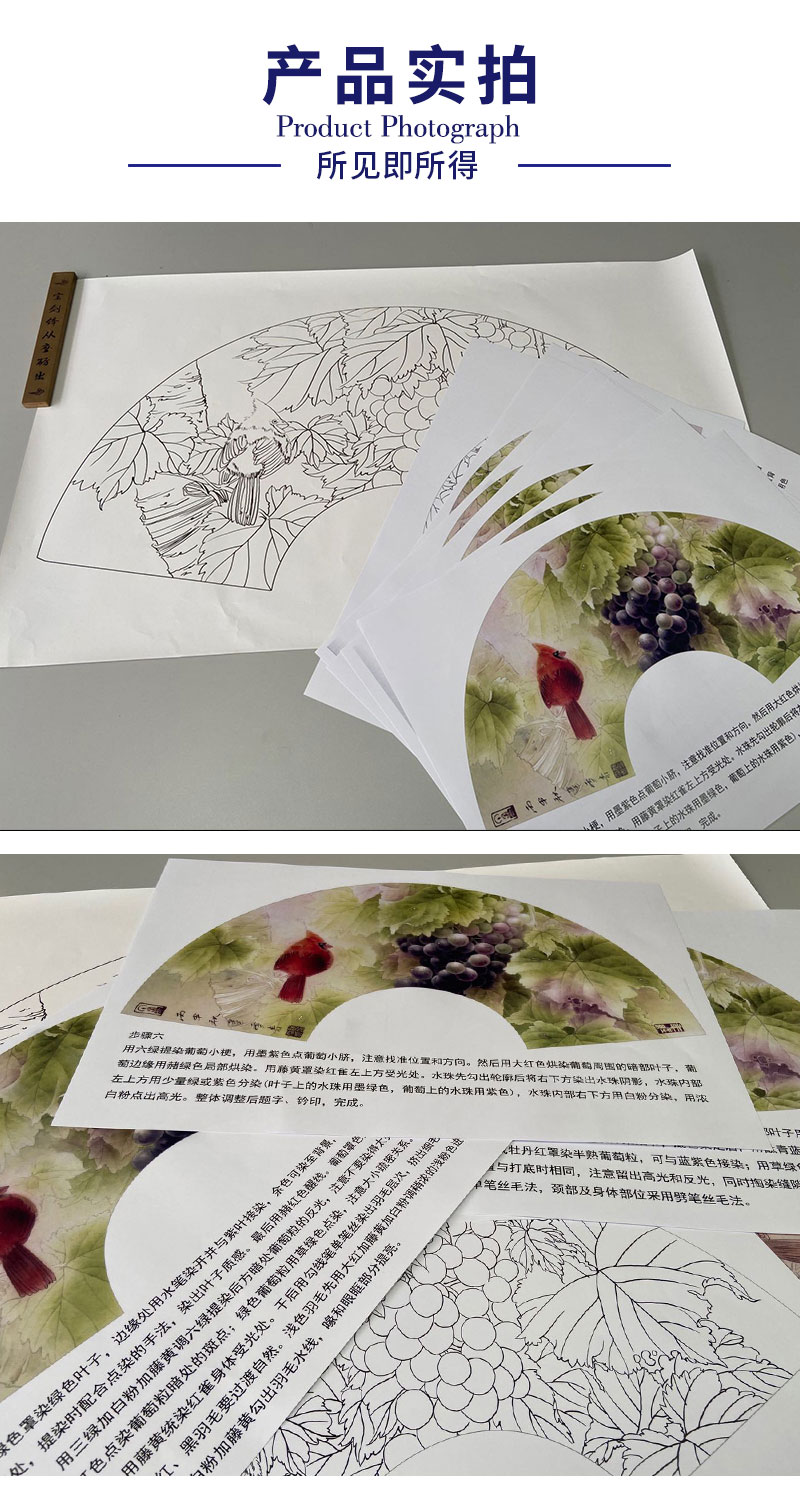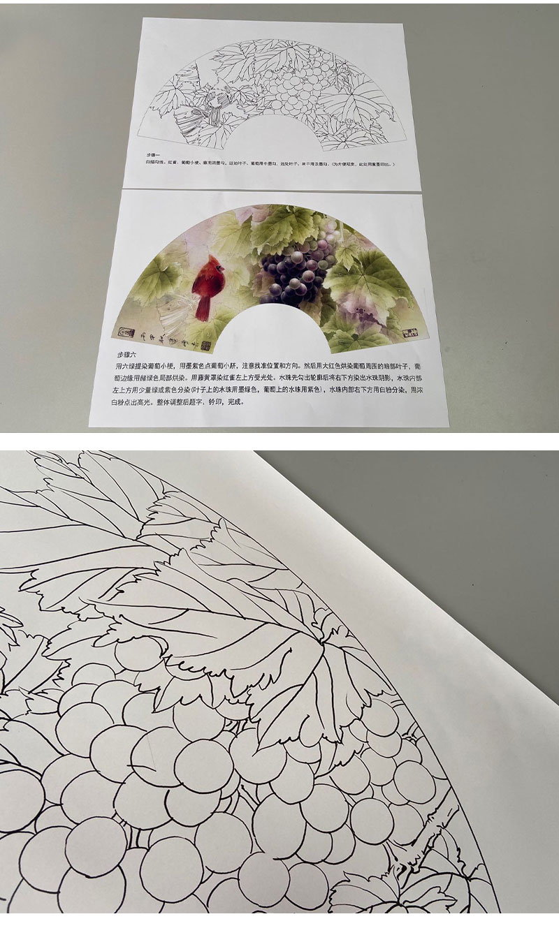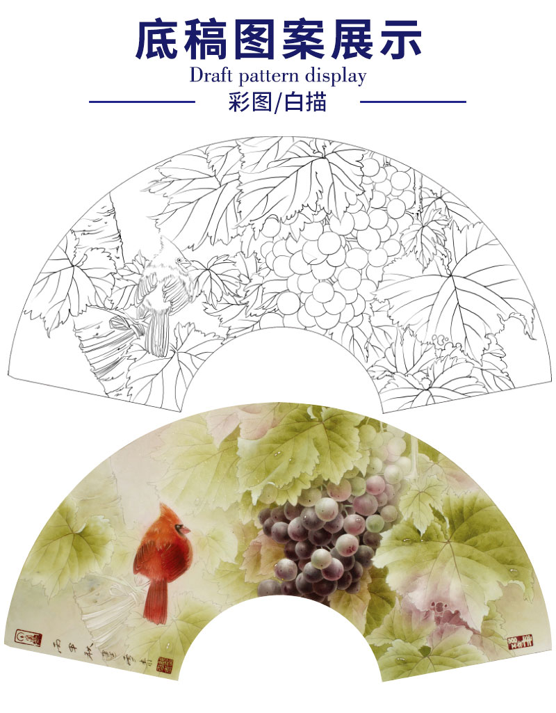 【有步骤】龚雪青工笔画白描底稿扇面小品《葡萄红雀图》初学者临摹花鸟线稿XQ89