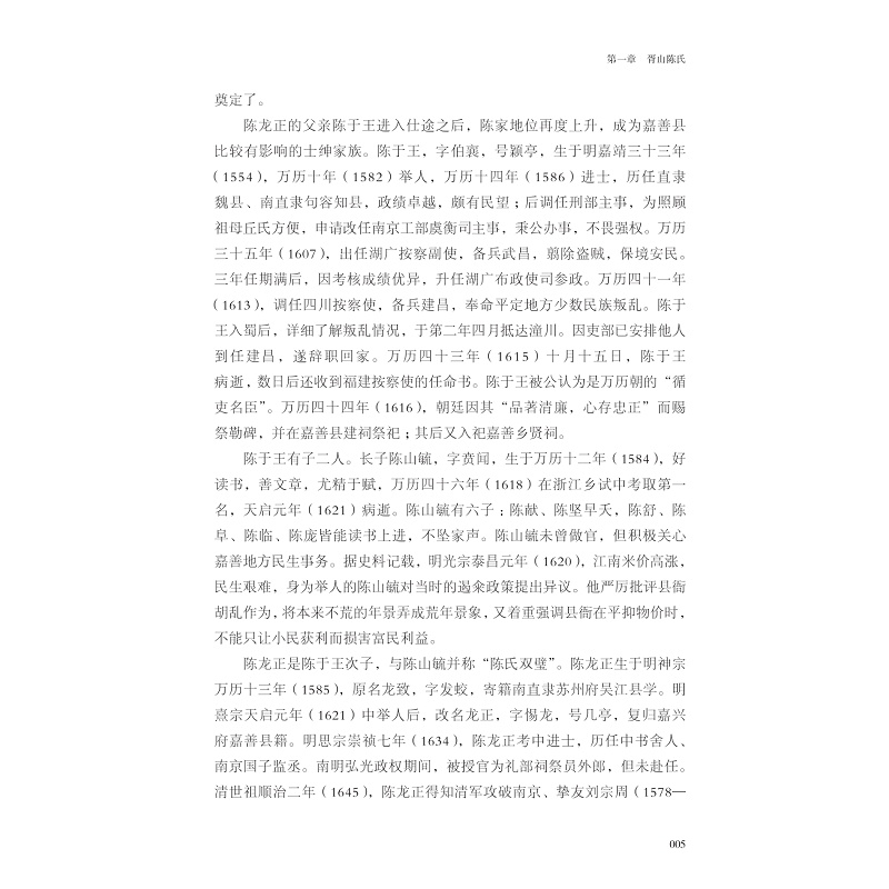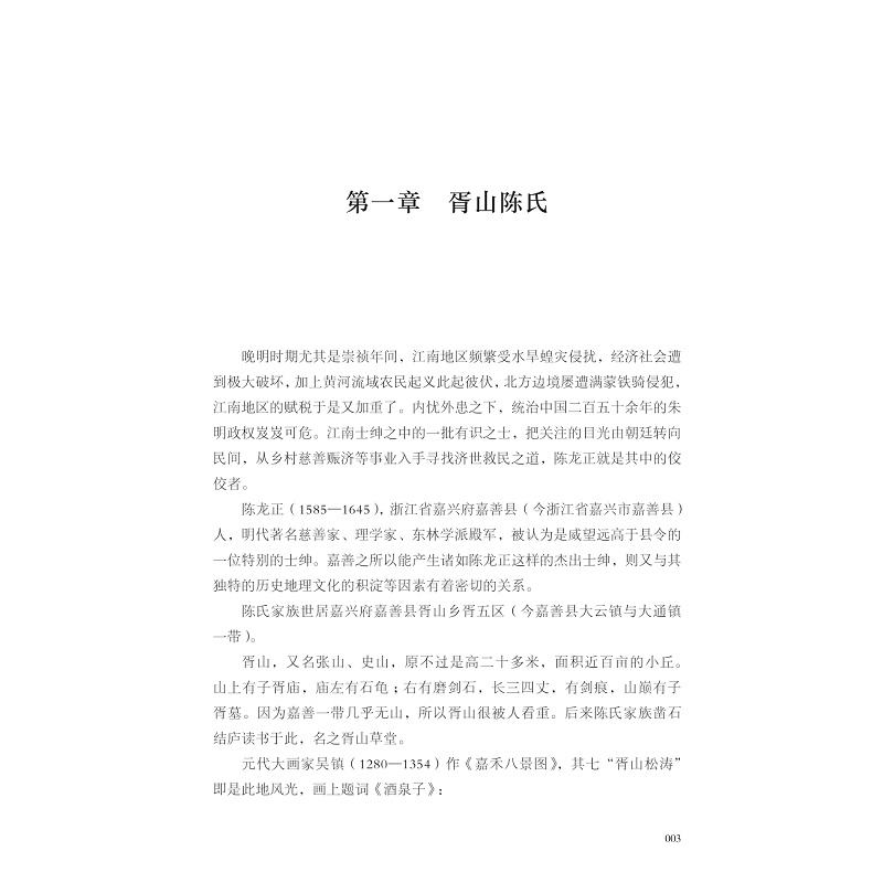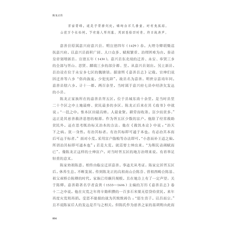 陈龙正是晚明的大儒、名臣,以理学、善学思想著称的思想家,被时人称为“盛代醇儒,经世巨品”,著有《学言》《政书》《救荒策会》等著作,后汇编为《几亭全书》六十多卷。《陈龙正传》包括陈龙正的生平、陈龙正的理学思想、陈龙正的善学思想与实践、陈龙正家训、盛代醇儒经世巨品:陈龙正的社会影响与历史地位,共五章以及年表、参考文献。全面论述了陈龙正光辉的一生,以及对于当时以及后世影响最为深远的理学、善学以及家训等丰富的学术思想,同时也呈现其对于晚明社会的重大影响和后世学人对其人生与思想的评判,呈现一个立体的晚明大思想家的完整形象。