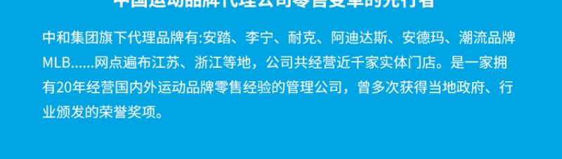 - 中和集团旗下代理安踏、李宁、耐克、安德玛、耐克、中国李宁、MIB等运动时尚品牌,网点遍布江苏、浙江、湖北等身份