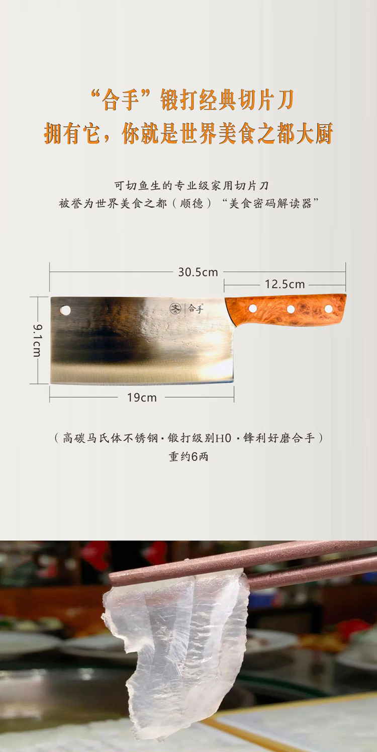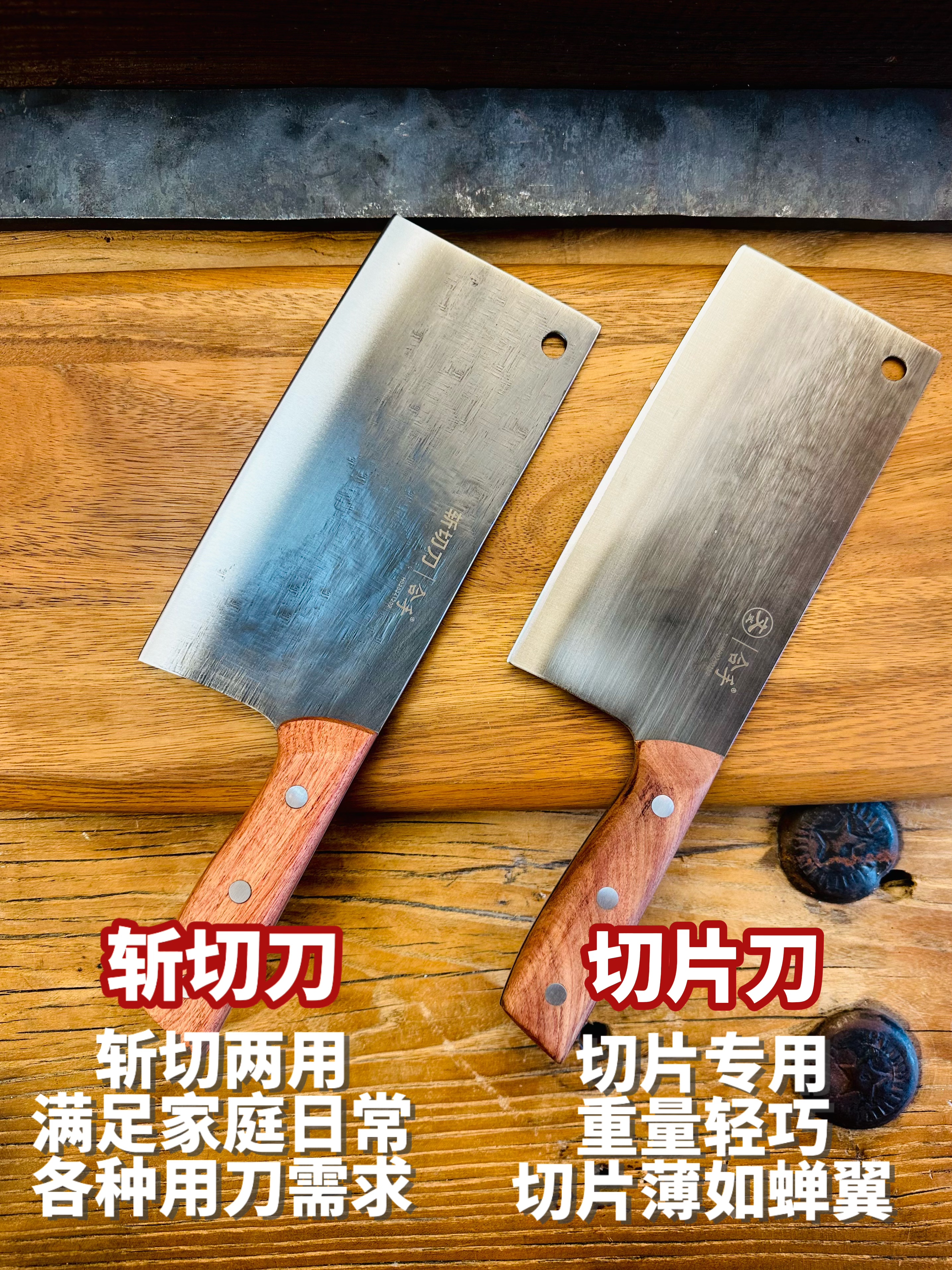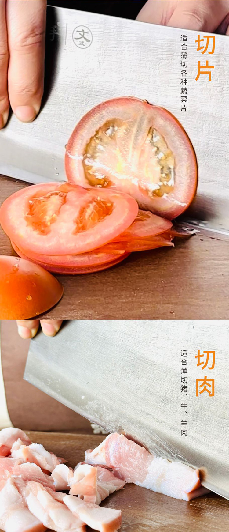 (注意:斩切刀可以斩骨、切片、剁肉等多用;切片刀专用于切片,不适宜斩、剁,以免影响使用效果和寿命。如切片刀因剁骨造成损坏,不属于质量问题。)