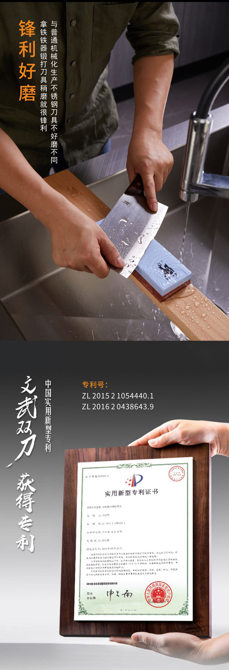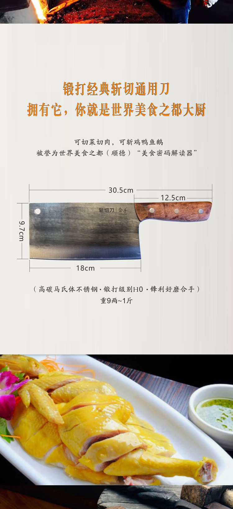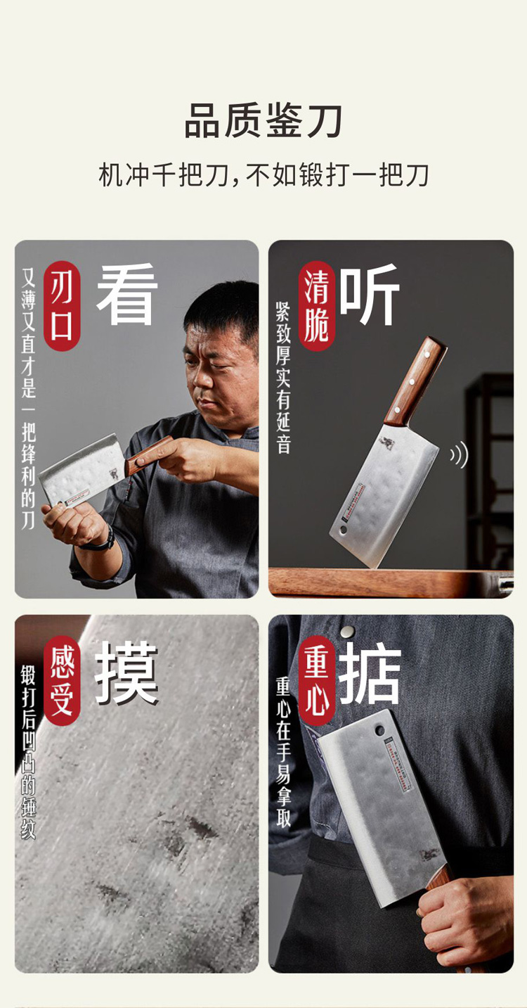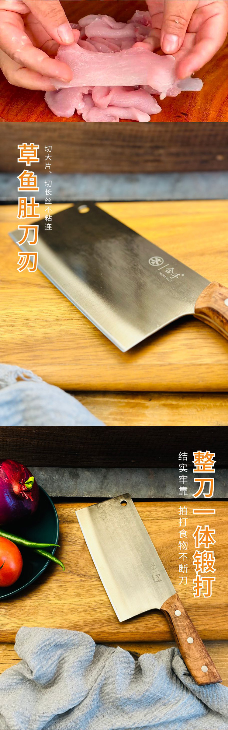 (注意:斩切刀可以斩骨、切片、剁肉等多用;切片刀专用于切片,不适宜斩、剁,以免影响使用效果和寿命。如切片刀因剁骨造成损坏,不属于质量问题。)