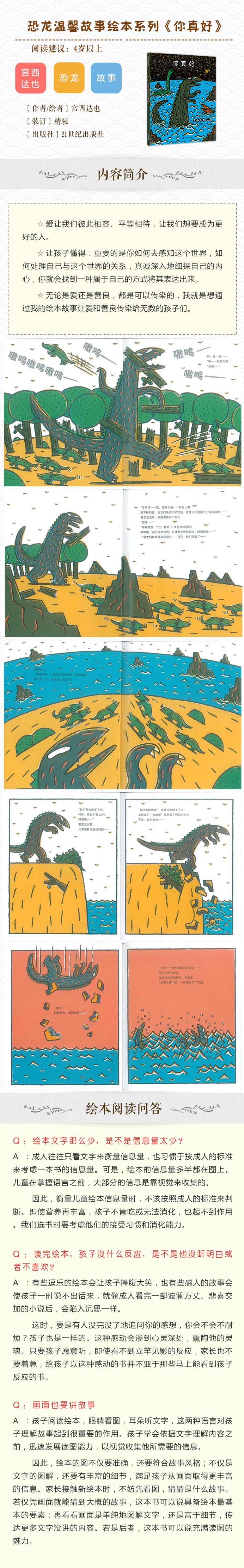 从前,有一只粗暴的、坏心眼的、狡猾的、任性的霸王龙,他总是欺负弱小。但他掉到海里,被善良的薄片龙救出来后,他就跟薄片龙交上朋友。他们天天在一起,霸王龙想到永远跟薄片龙在一起。可是,一天薄片龙被海里的坏家伙咬……这是《恐龙的温馨故事绘本》系列第三本,本书延续了前两本雄浑质朴的画风、曲折动人的情节和细腻丰富的情感。前两本更侧重于表现所谓的“强者与弱者”之间的情感融合,亲情色彩显得比较浓厚。而《你真好》当中,霸王龙和薄片龙之间的感情是平等的,另外一种情感交流,友情还是爱情,不同的读者会有不同的理解。