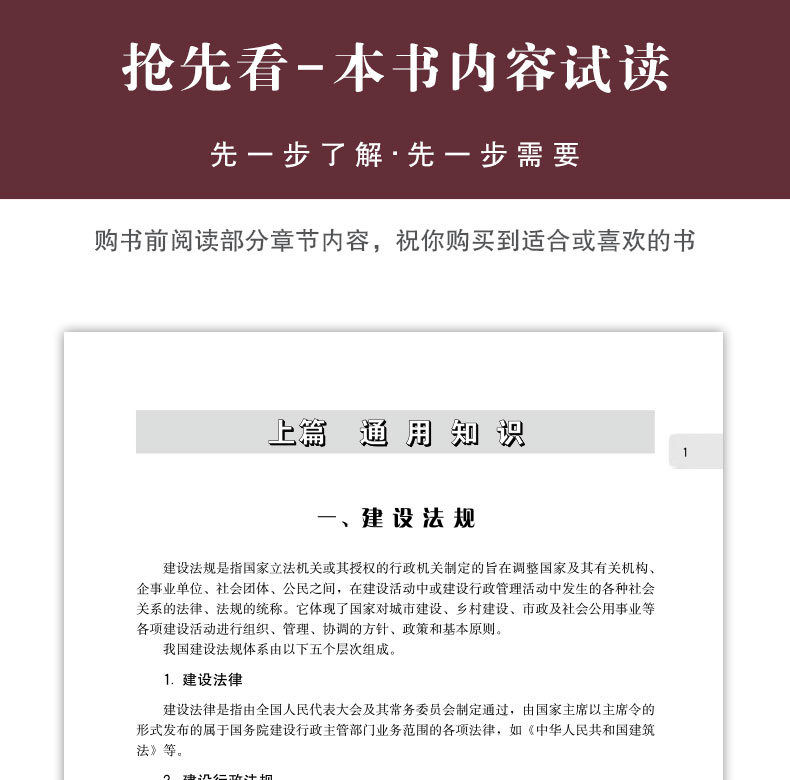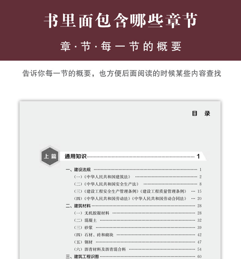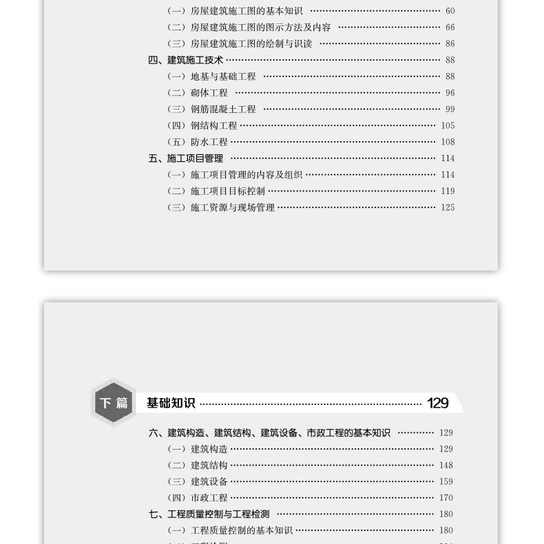 全书分为上、下两篇。上篇包括五部分内容:建设法规,建筑材料,建筑工程识图,建筑施工技术,施工项目管理。下篇包括建筑构造、建筑结构、建筑设备、市政工程的基本知识,工程质量控制与工程检测,施工组织设计。