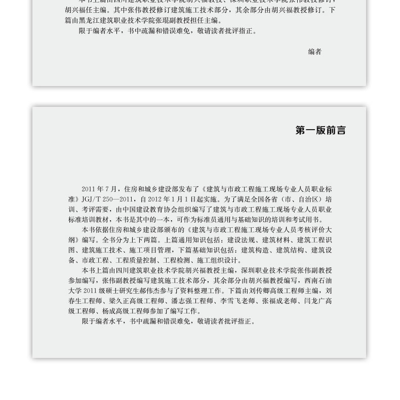 (1)权威性。主编和部分参编人员参加了《建筑与市政工程施工现场专业人员职业标准》JGJ/T 250-2011、《建筑与市政工程施工现场专业人员考核评价大纲》的编写与宣贯,同时聘请了业内权威专家作为审稿人员,因此本书能够充分体现执业标准和考核评价大纲的要求。