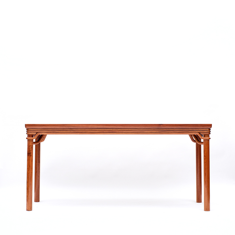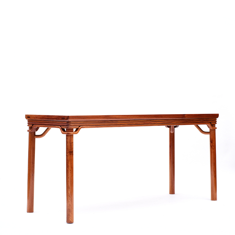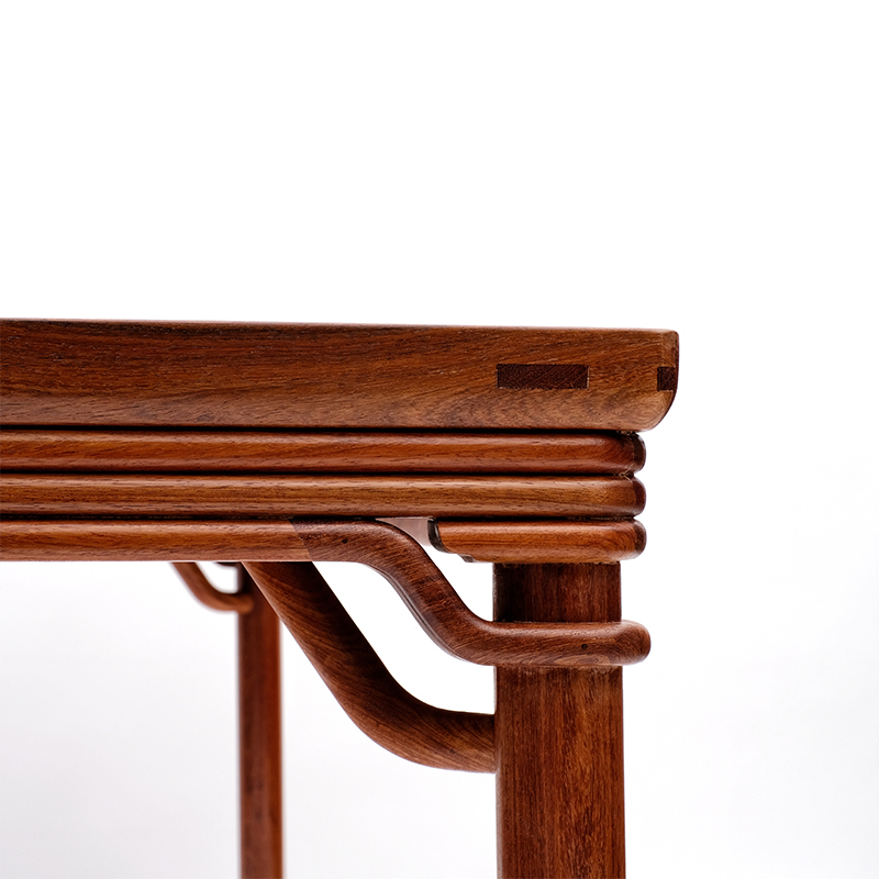 该款复刻作品案面为整块缅花独板,不作拼接,用料奢华,其采用明式家具独特的“圆包圆”工艺,这是圆腿无束腰古典家具上一种非常讲究的做法。