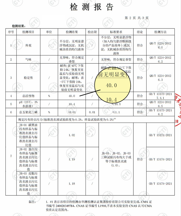 代表清洁力的总活性物高达40(批次数值会有微小差异),是洗衣液国家标准(≥15)的2.6倍,且远超浓缩标准。