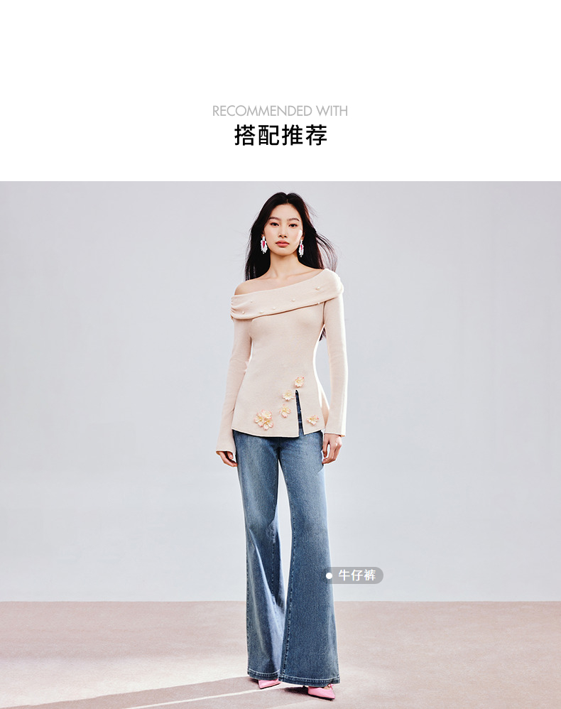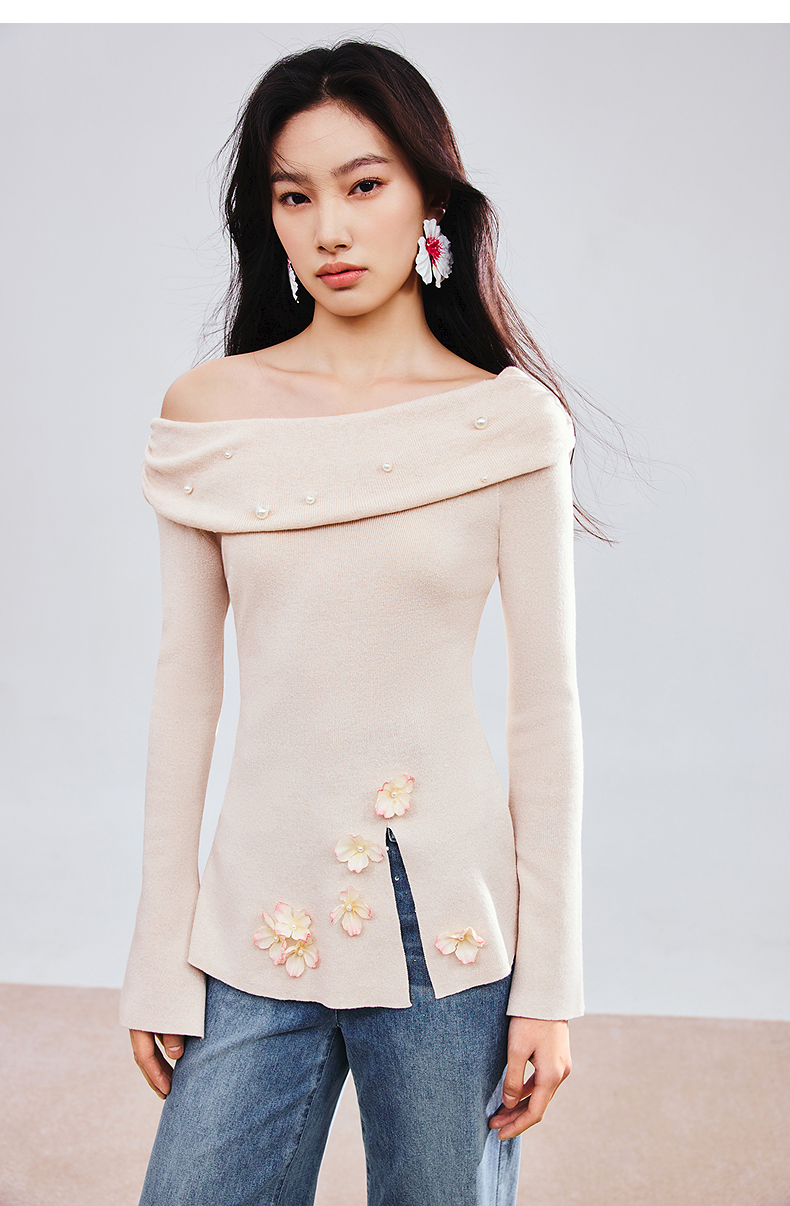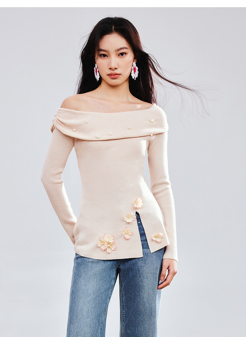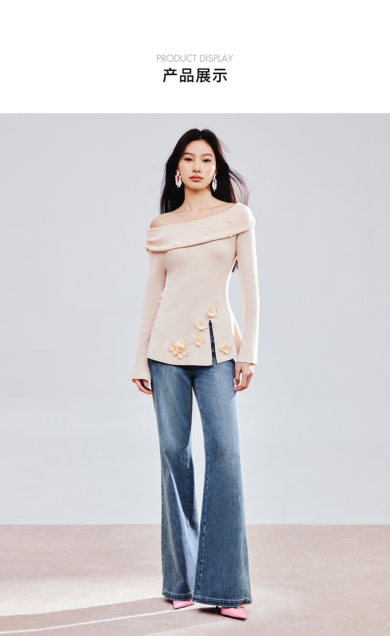 MAXRIENY精致优雅感套头针织衫25春新款一字领修身显瘦长袖上衣女(货号:MS85SW784)