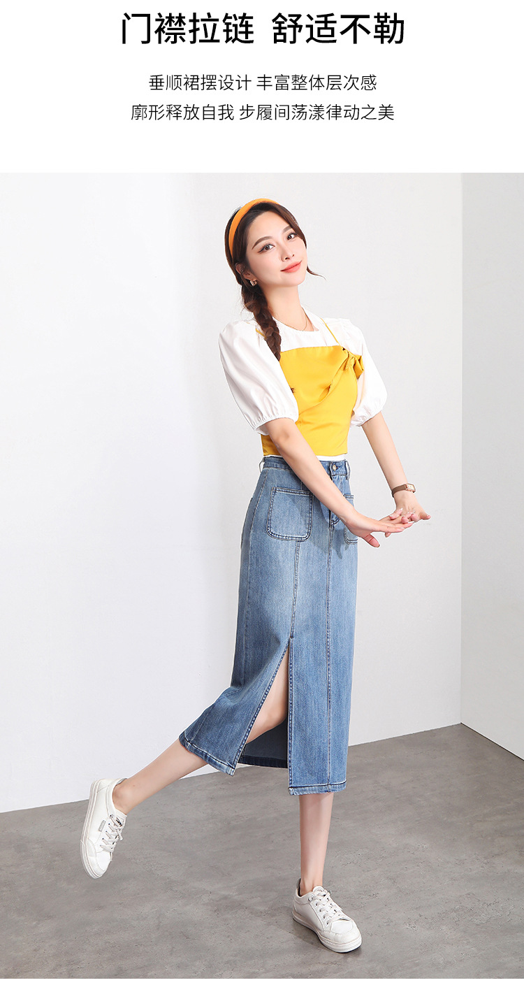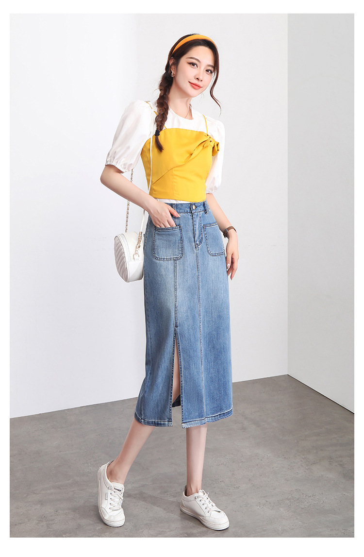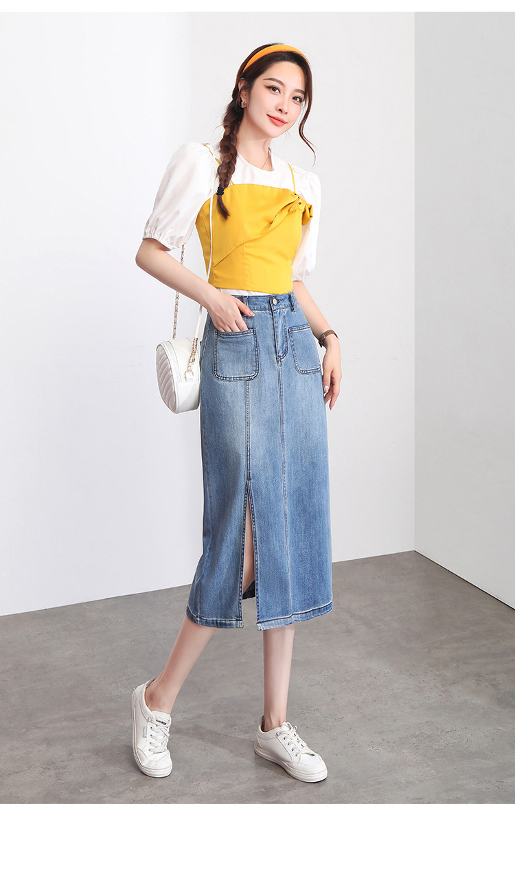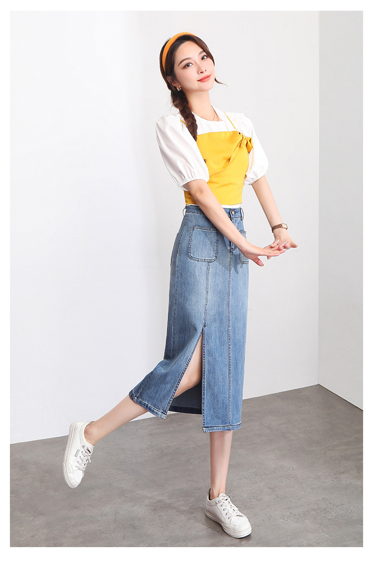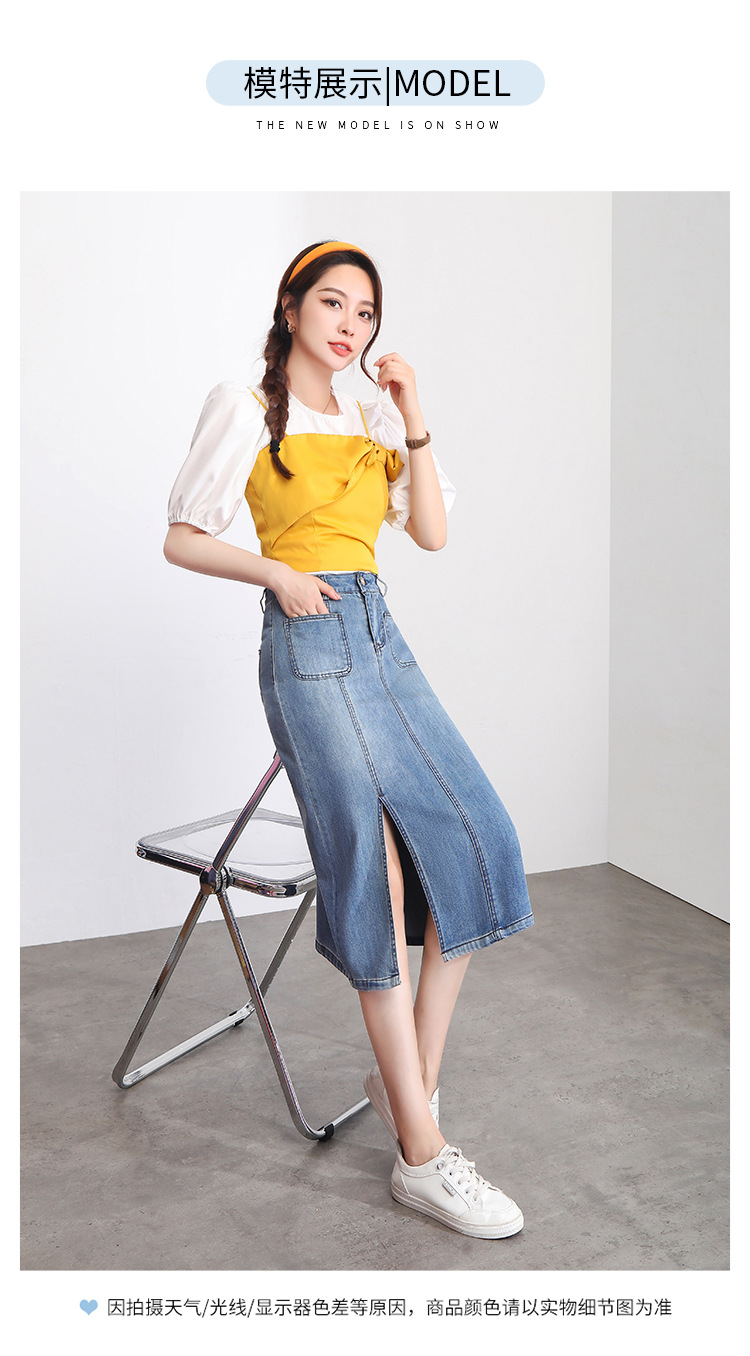 修身时尚,牛仔拼接中长款A字裙夏款高腰休闲侧开叉时髦半身裙MYX-33127