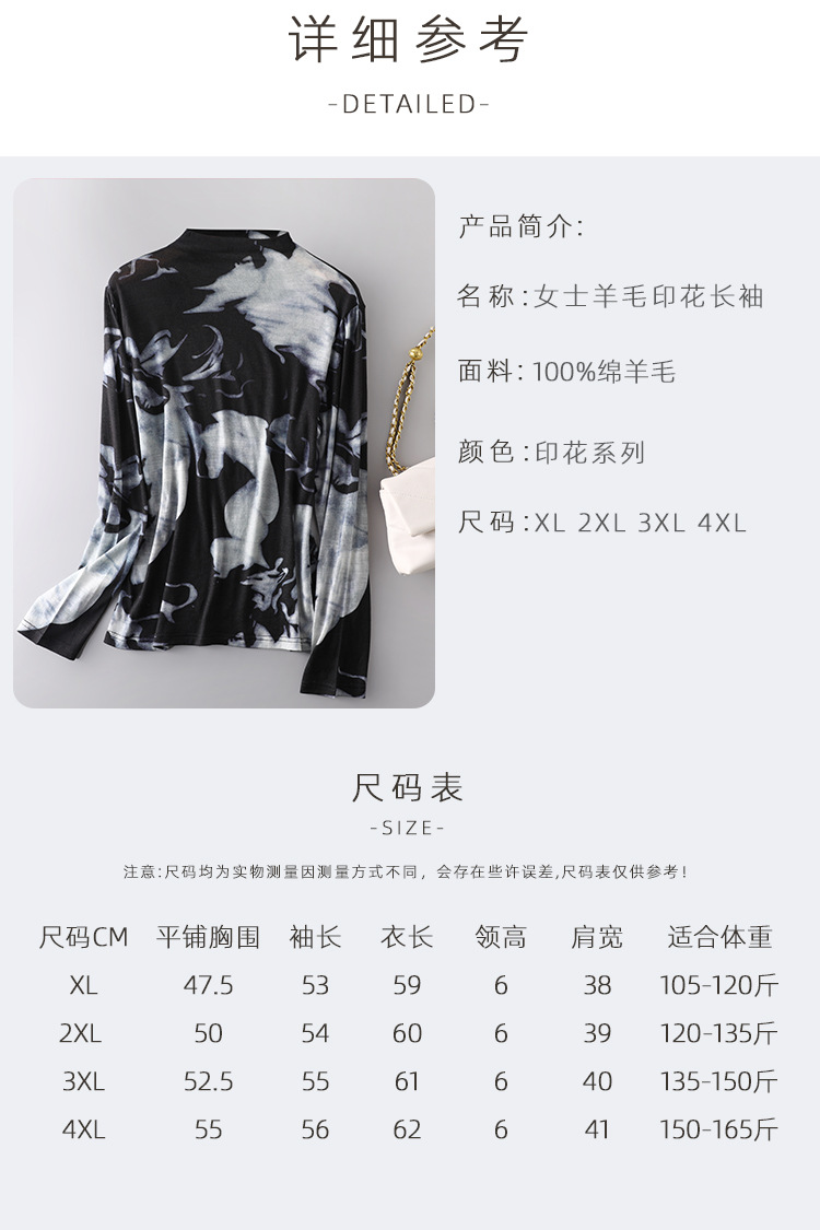 百媚生 100%绵羊毛女士印花长袖 气质半高领上衣CX-086