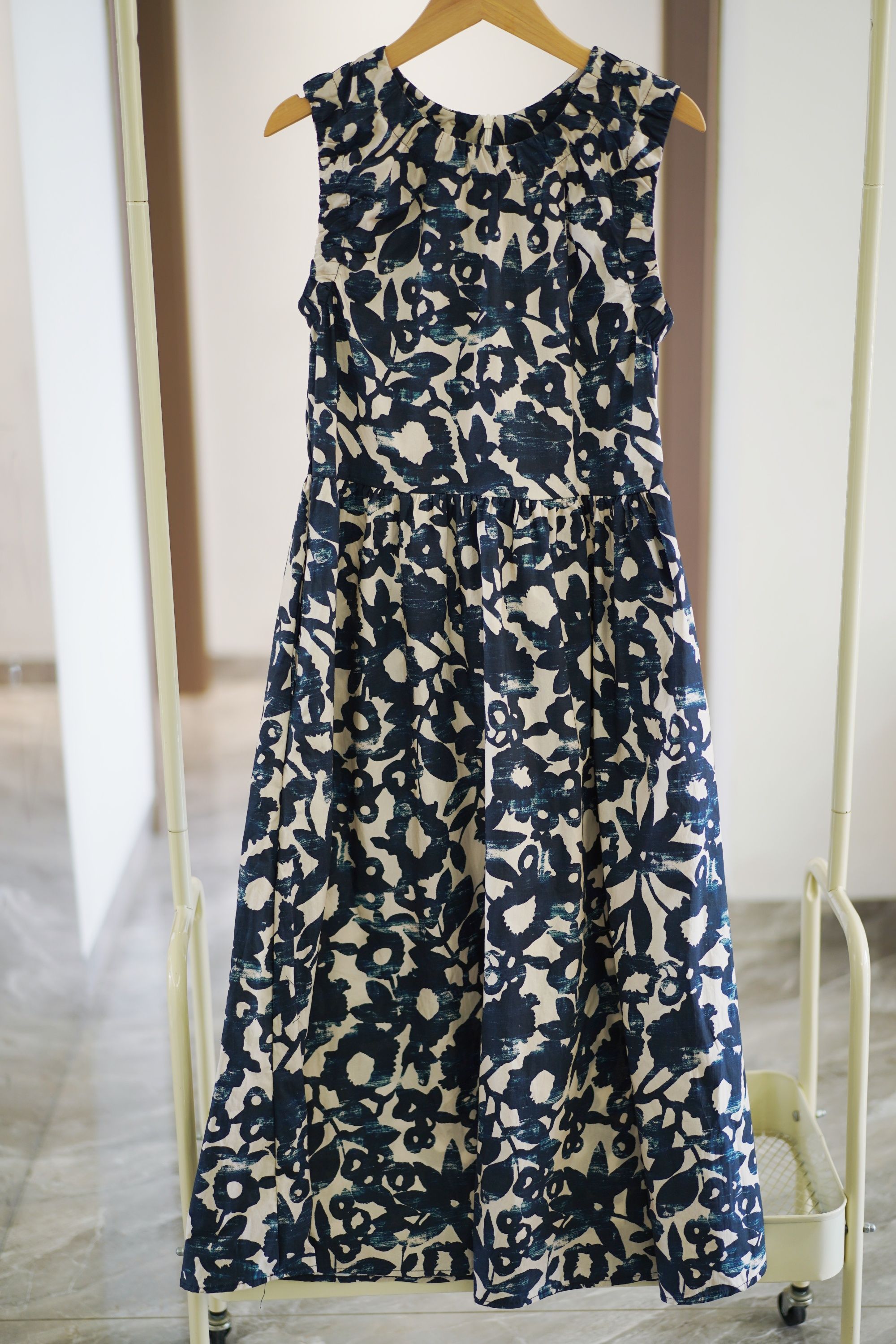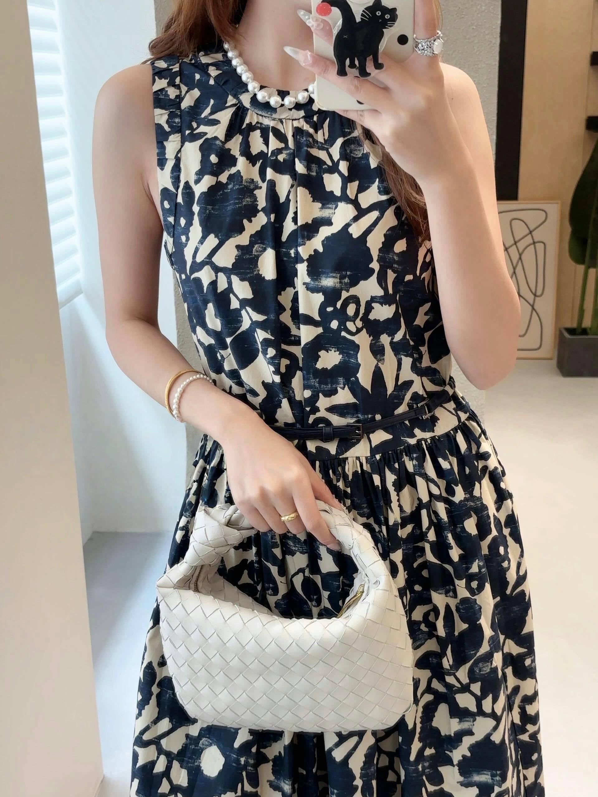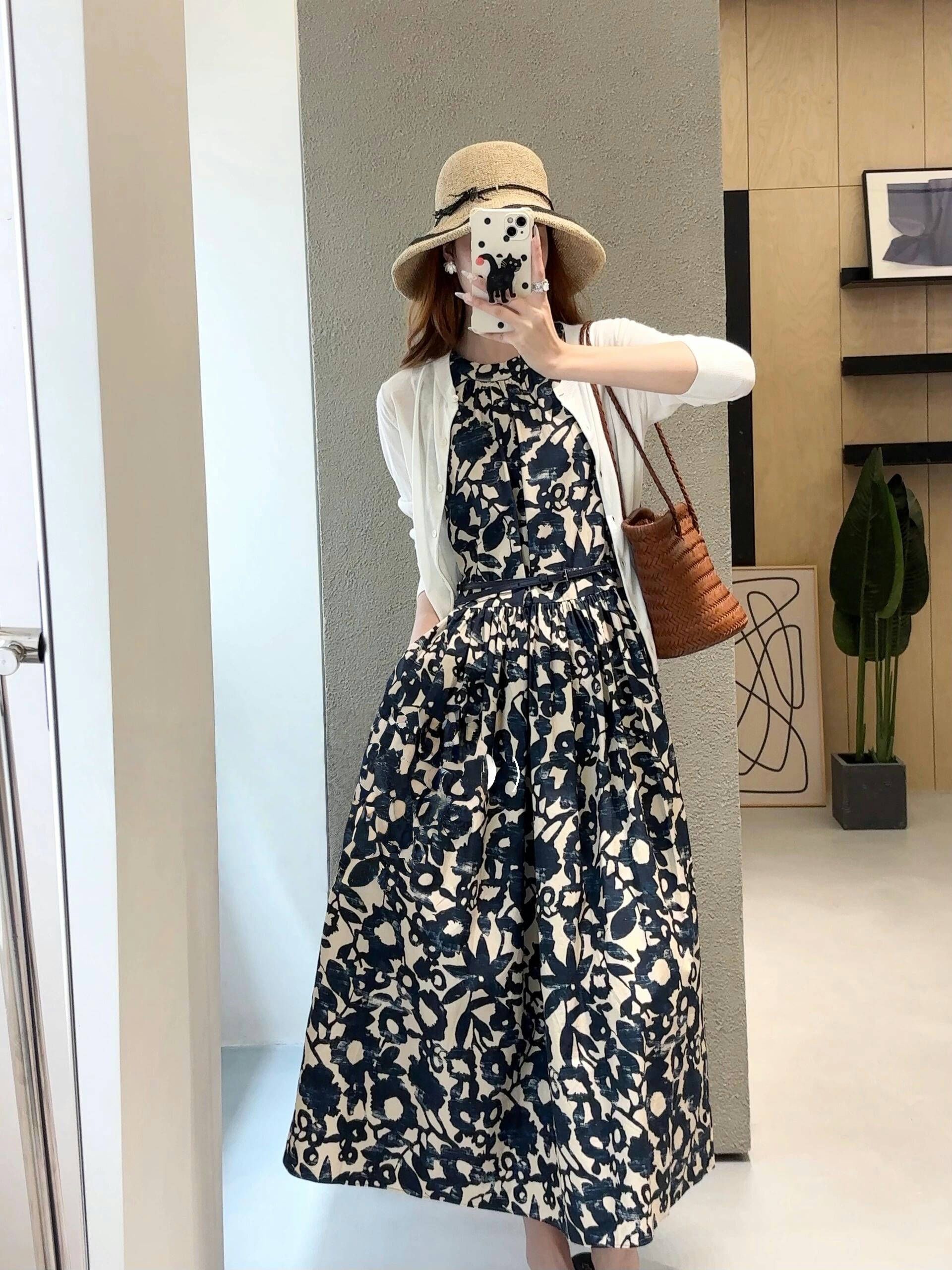 清仓送腰带【【樱西玛ENXIMANE 棉蓝白泼墨连衣裙】走秀款泼墨收腰长裙 无袖法式背心裙 轻奢优雅长裙