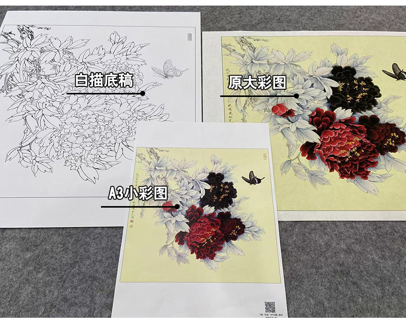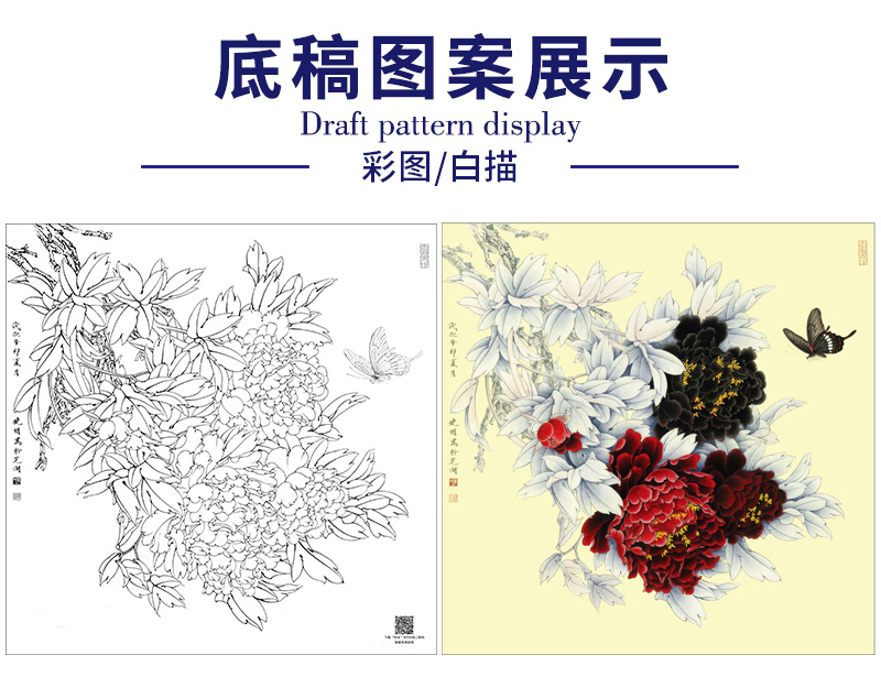 【大彩图】李晓明工笔画白描底稿斗方小品《和风花欲舞》牡丹临摹勾线花鸟线稿K041