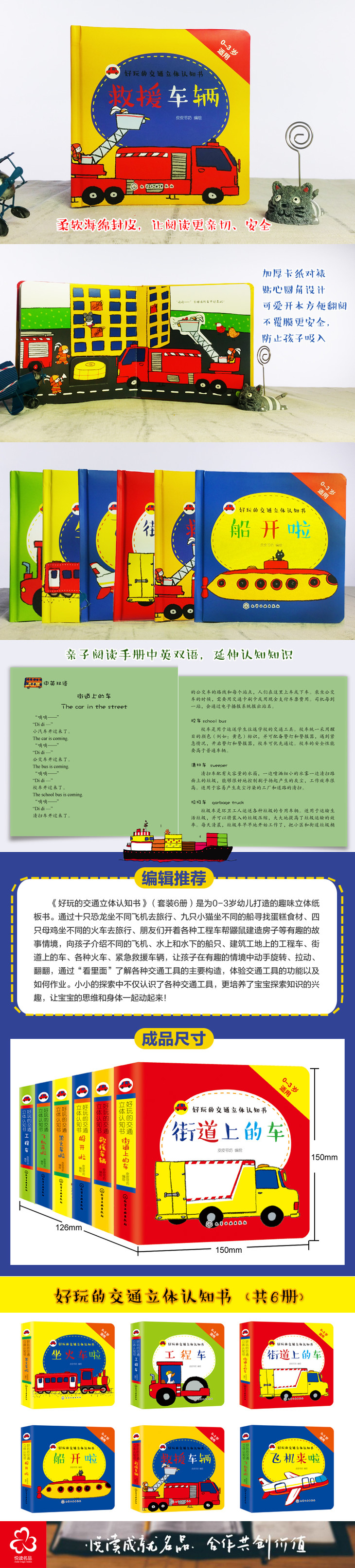 《好玩的交通立体认知书》(套装6册)是为0-3岁幼儿打造的趣味立体纸板书。通过四只母鸡坐火车旅行、九只小猫坐船寻找蛋糕食材的旅程、十只小恐龙的飞机旅行、朋友们开着工程车帮助小鼹鼠建造新家等有趣的绘本故事情境,向孩子介绍了水上和水下的船只,不同类型的飞机、各种各样的工程车、不同的火车、紧急救援车辆、街道上的车辆等交通工具的外形结构、颜色、功能、使用场所等,让孩子在认知、朗读、动手翻翻拉拉的过程中全方位地认知各种交通工具,让孩子的思维和手指一起动起来!