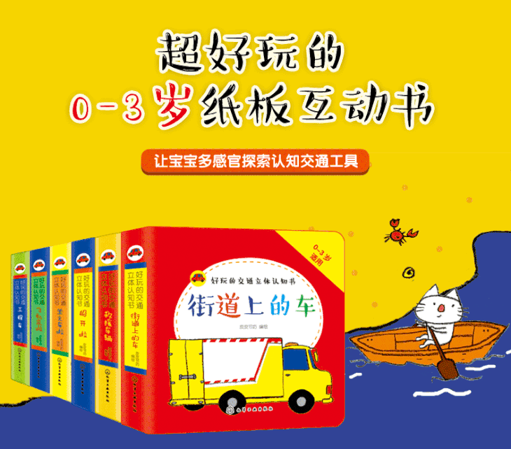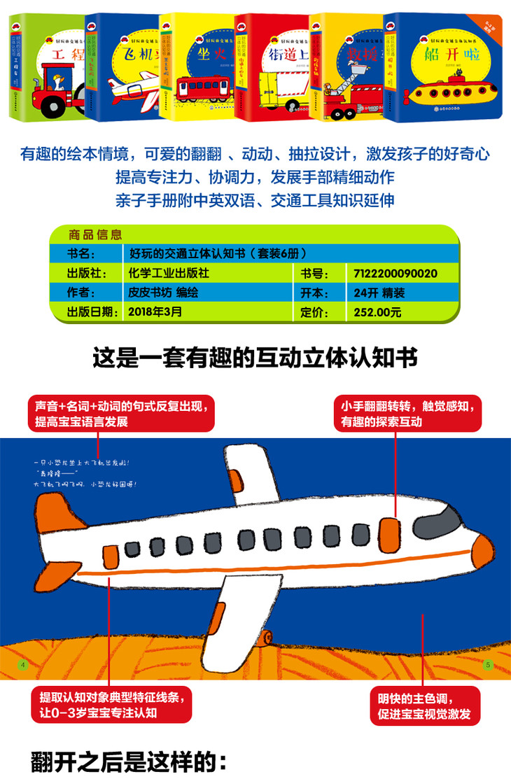 反复简单的排比句式,有趣的故事情境,明快的色彩、简单的造型特征,小手翻翻动动抽拉,体验交通工具的结构和功能,符合0-3岁宝宝的认知特点。