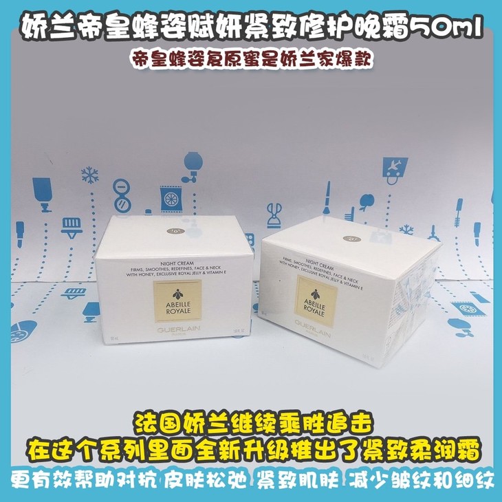 娇兰帝皇蜂姿赋妍紧致修护日霜50ml/#晚霜50ml👍帝皇蜂姿复原蜜是娇兰家爆款🔥,法国娇兰继续乘胜追击👏,在这个系列里面全新升级推出了紧致柔润霜☁,不仅对核心成分黑蜂修护科技进行全新升级⬆,还结合维生素E衍生物,更有效帮助对抗👉皮肤松弛,紧致肌肤,减少皱纹和细纹。此款日霜晚霜推荐混合性肤质,搭配使用效果更佳😘!