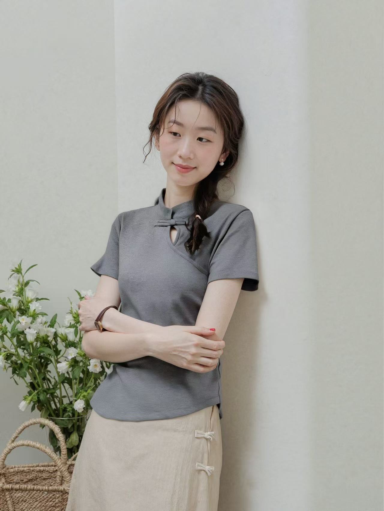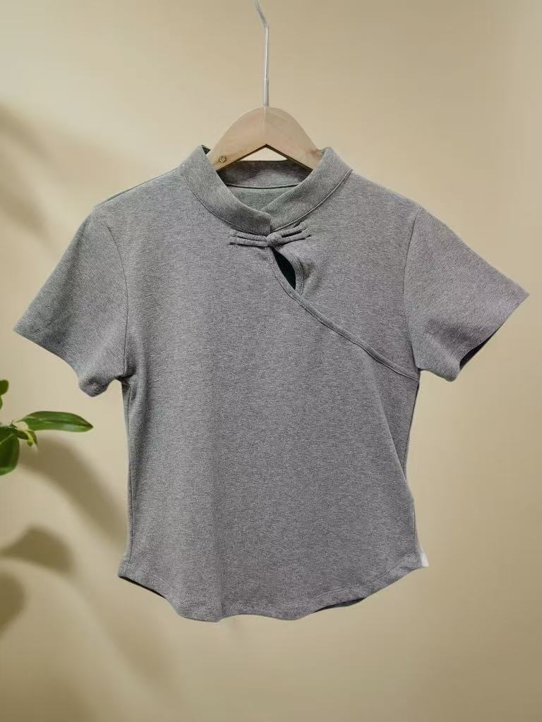 【新品特卖】3050新中式花灰镂空修身短袖T恤-喜出