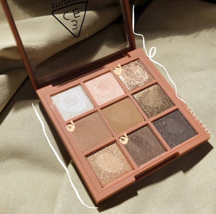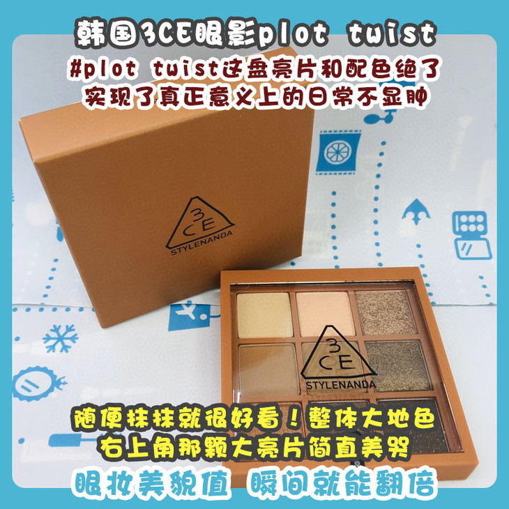 韩国3CE眼影plot twist👍#plot twist这盘亮片和配色绝了👀,实现了真正意义上的日常不显肿,🤩随便抹抹就很好看!整体大地色,右上角那颗大亮片简直美哭🌟,光是冲着那一颗就很值得!!眼妆美貌值,瞬间就能翻倍😍!不管是新手还是经常化妆的宝宝,❤这盘栗棕色系的搭配很值得入手~