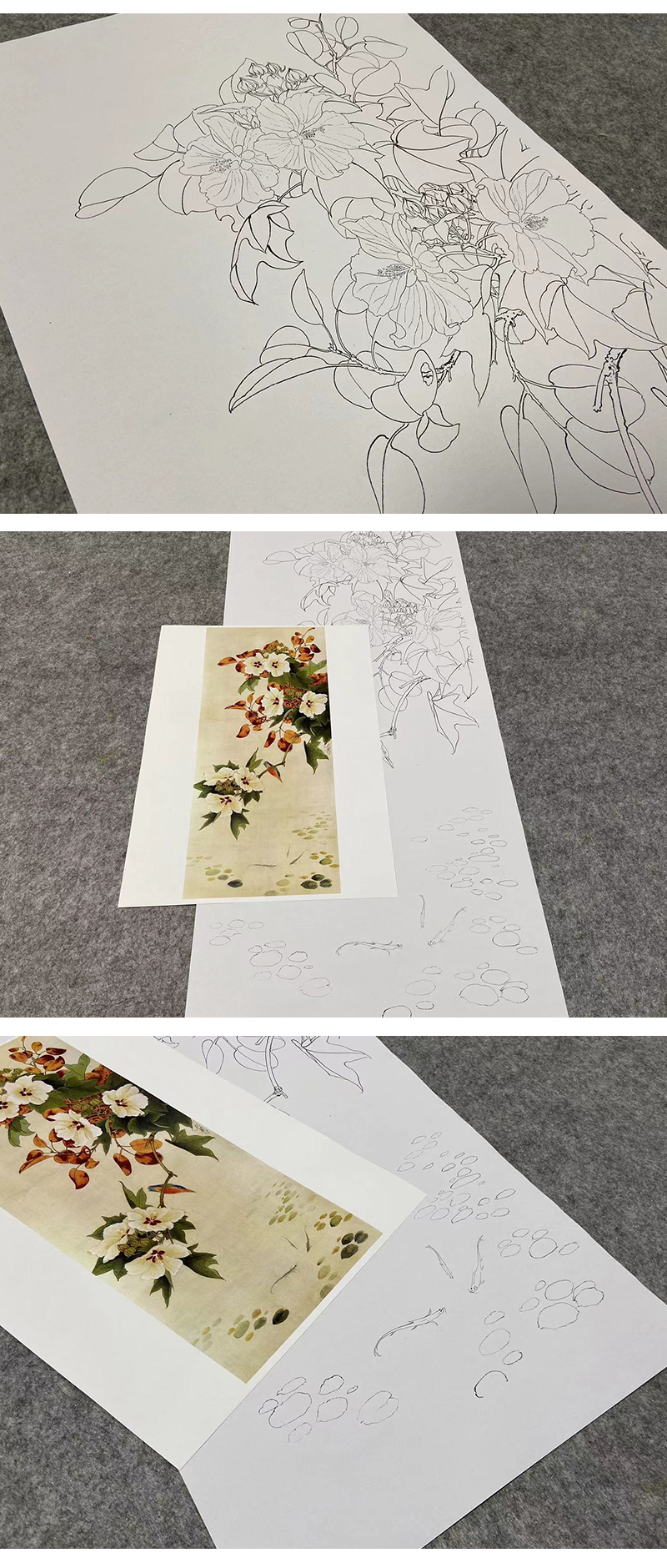 竖幅工笔花鸟白描底稿-周彦生-紫荆花《比翼》-多种白描尺寸可选-A069