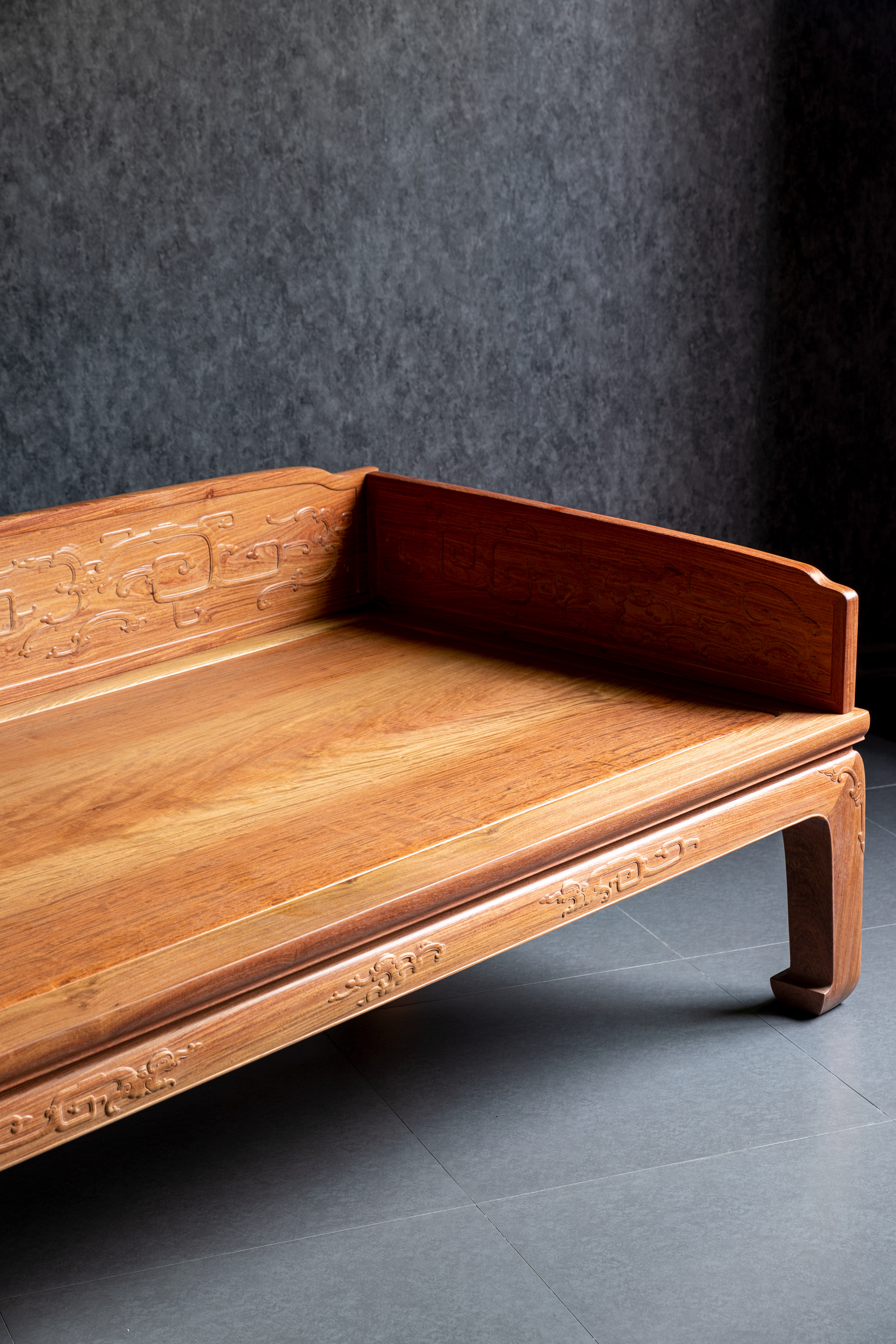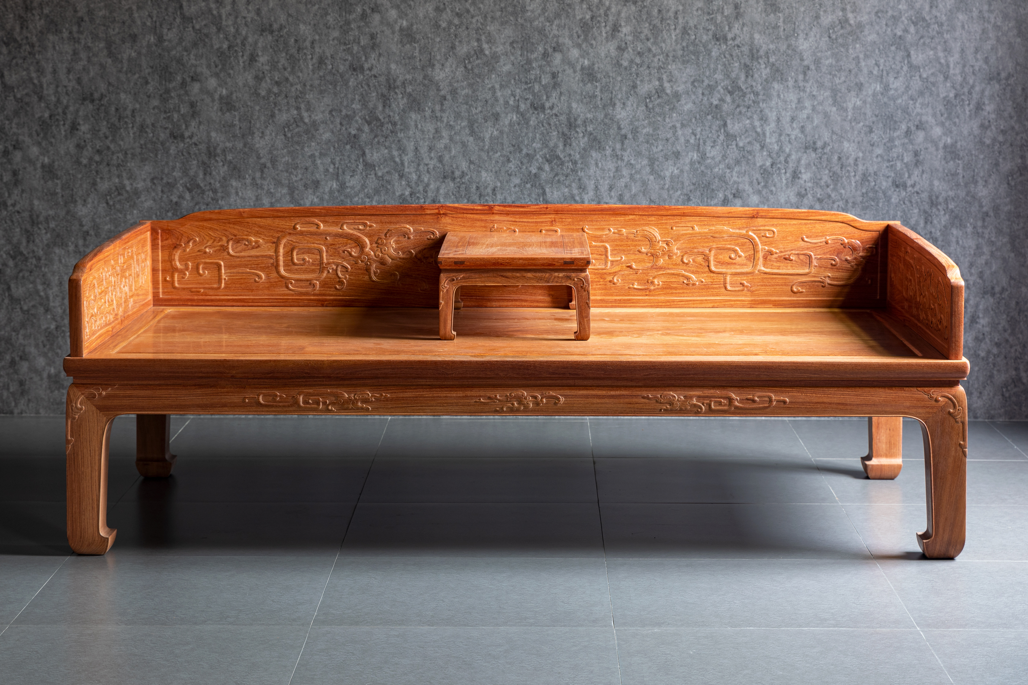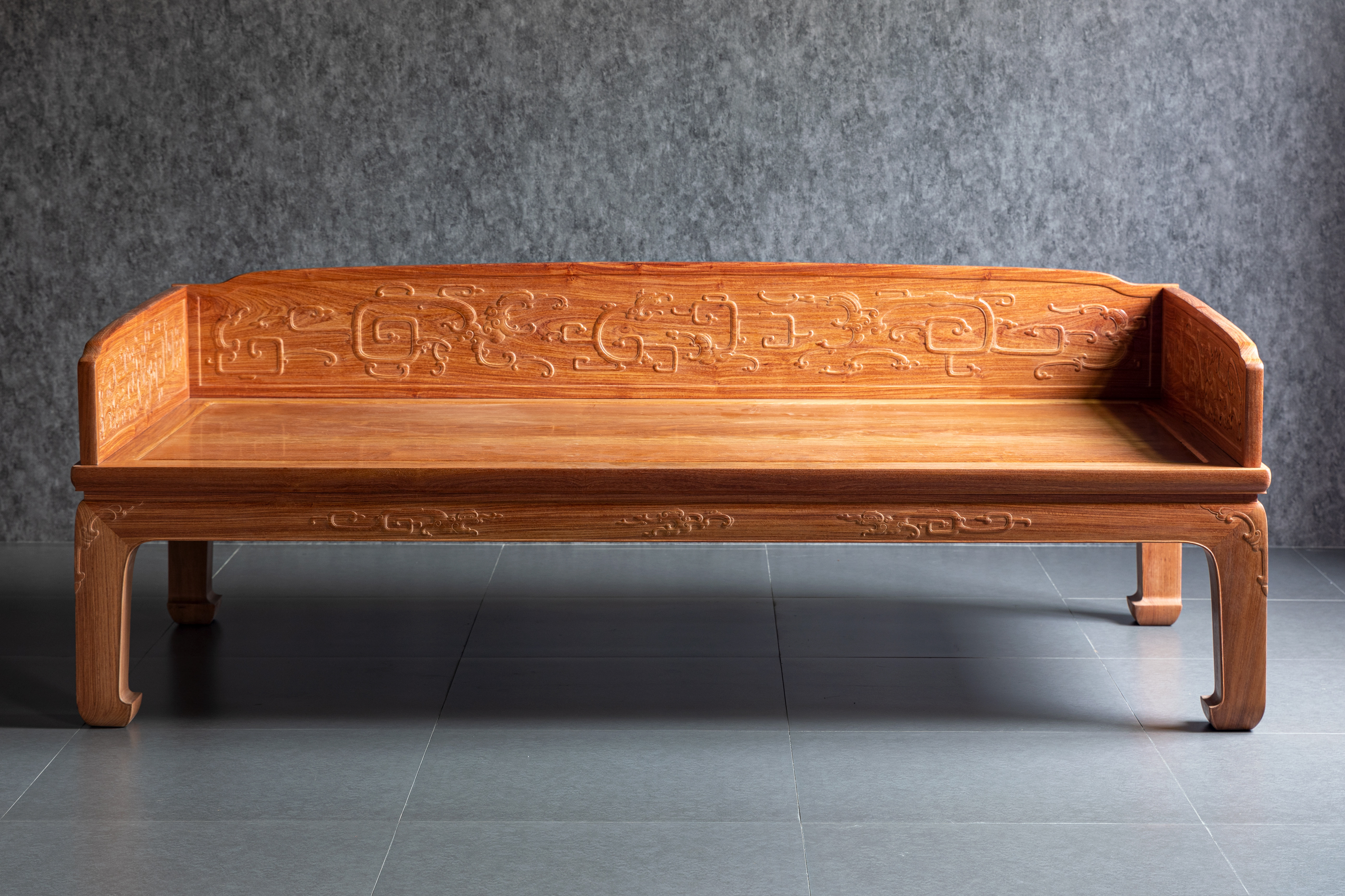 在独板围子上雕刻夔龙的,于传世罗汉床中并不多见。明尼亚波利斯美术馆收藏有布鲁斯•代顿伉俪旧藏一例较大;另一例为香港攻玉山房叶承耀医生旧藏,售于香港苏富比2015年10月。