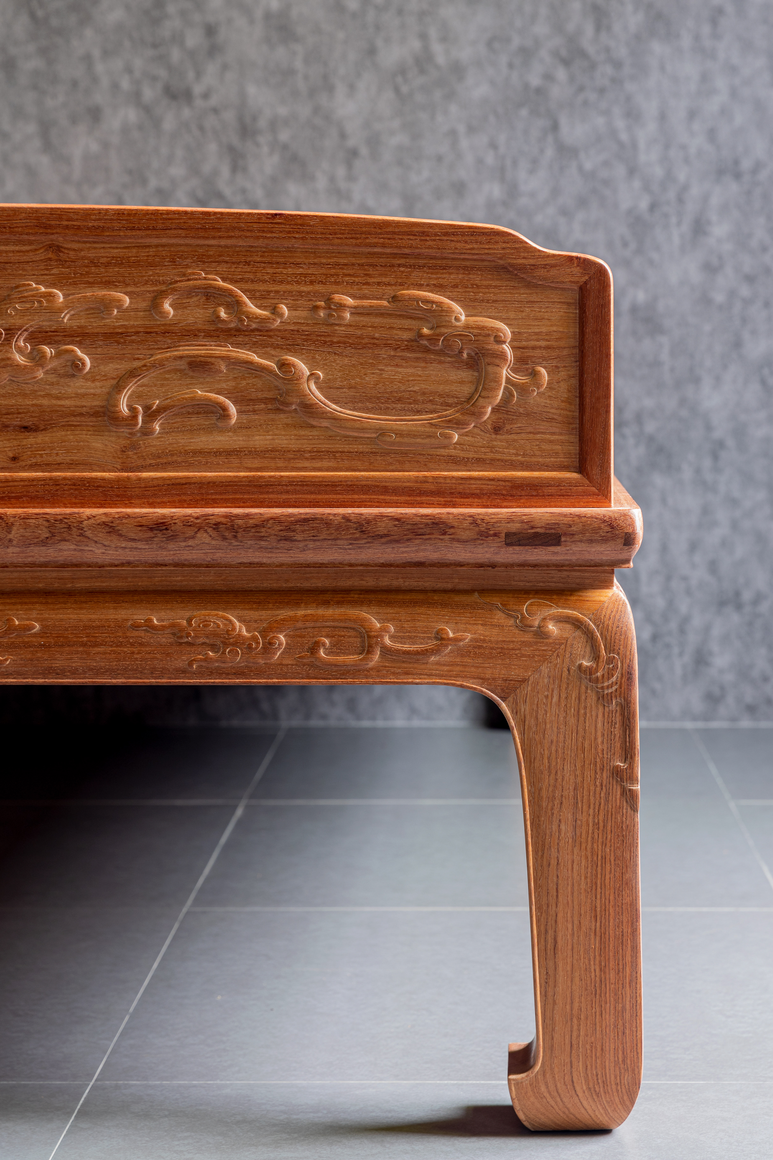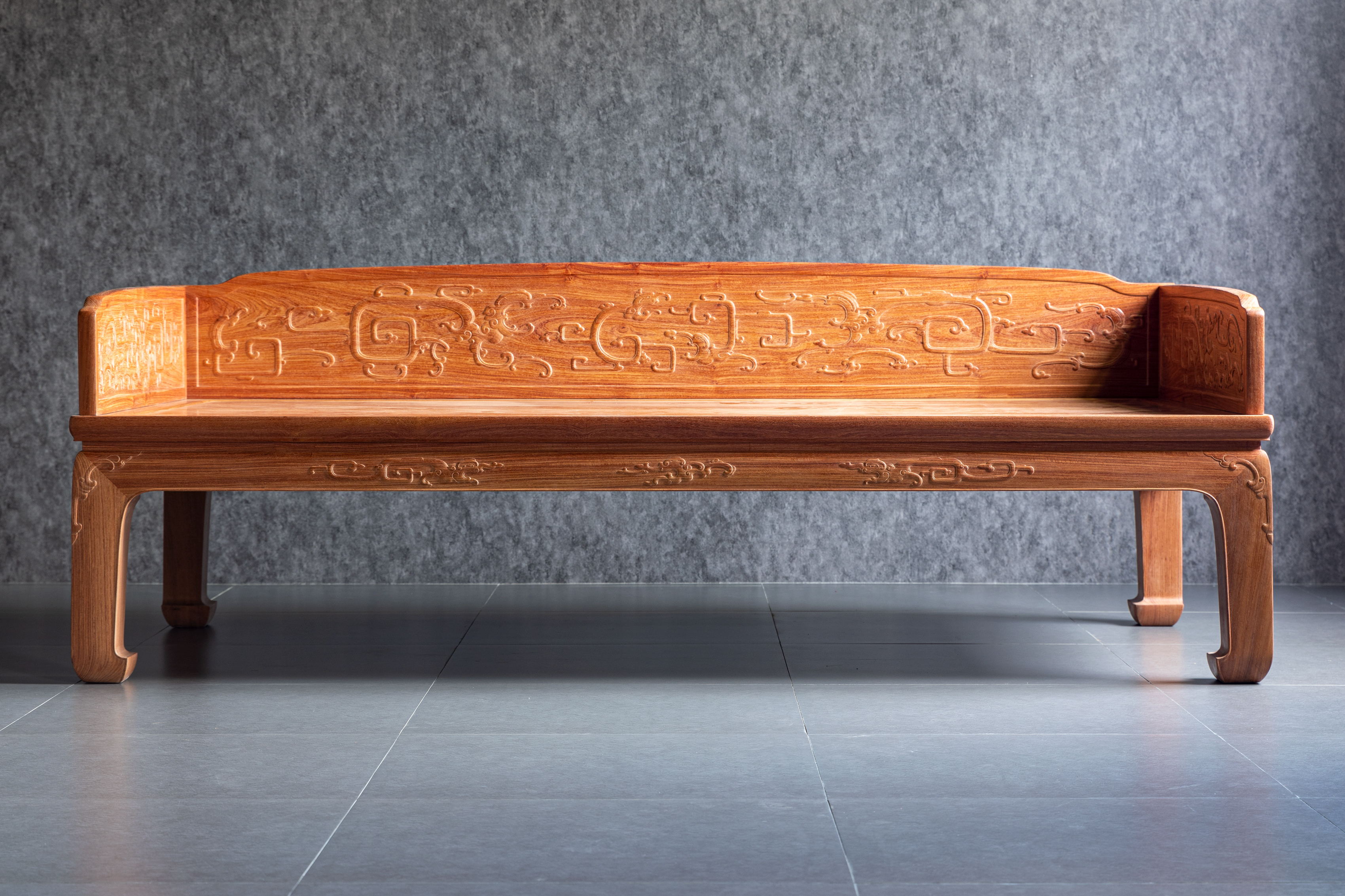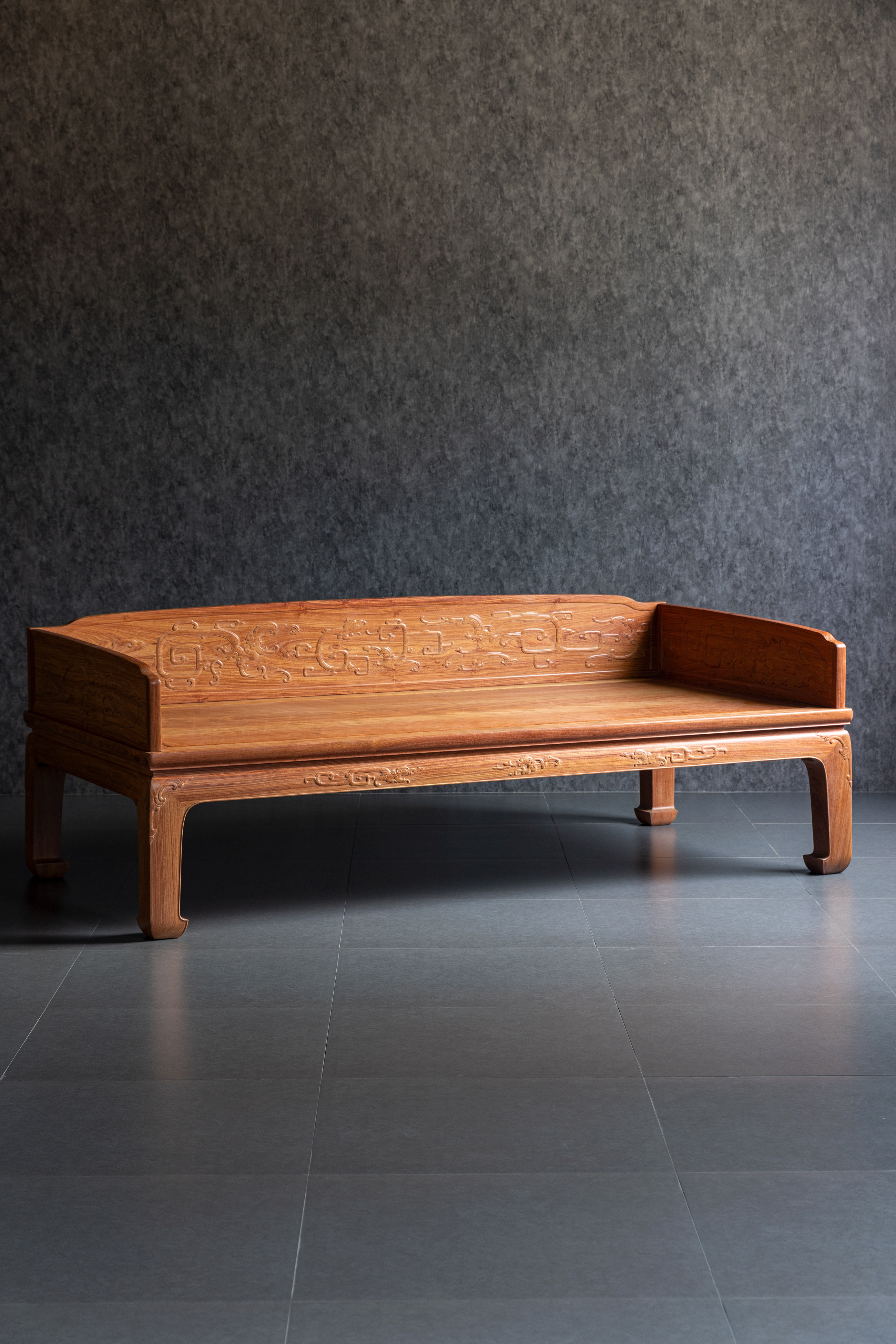 在独板围子上雕刻夔龙的,于传世罗汉床中并不多见。明尼亚波利斯美术馆收藏有布鲁斯•代顿伉俪旧藏一例较大;另一例为香港攻玉山房叶承耀医生旧藏,售于香港苏富比2015年10月。