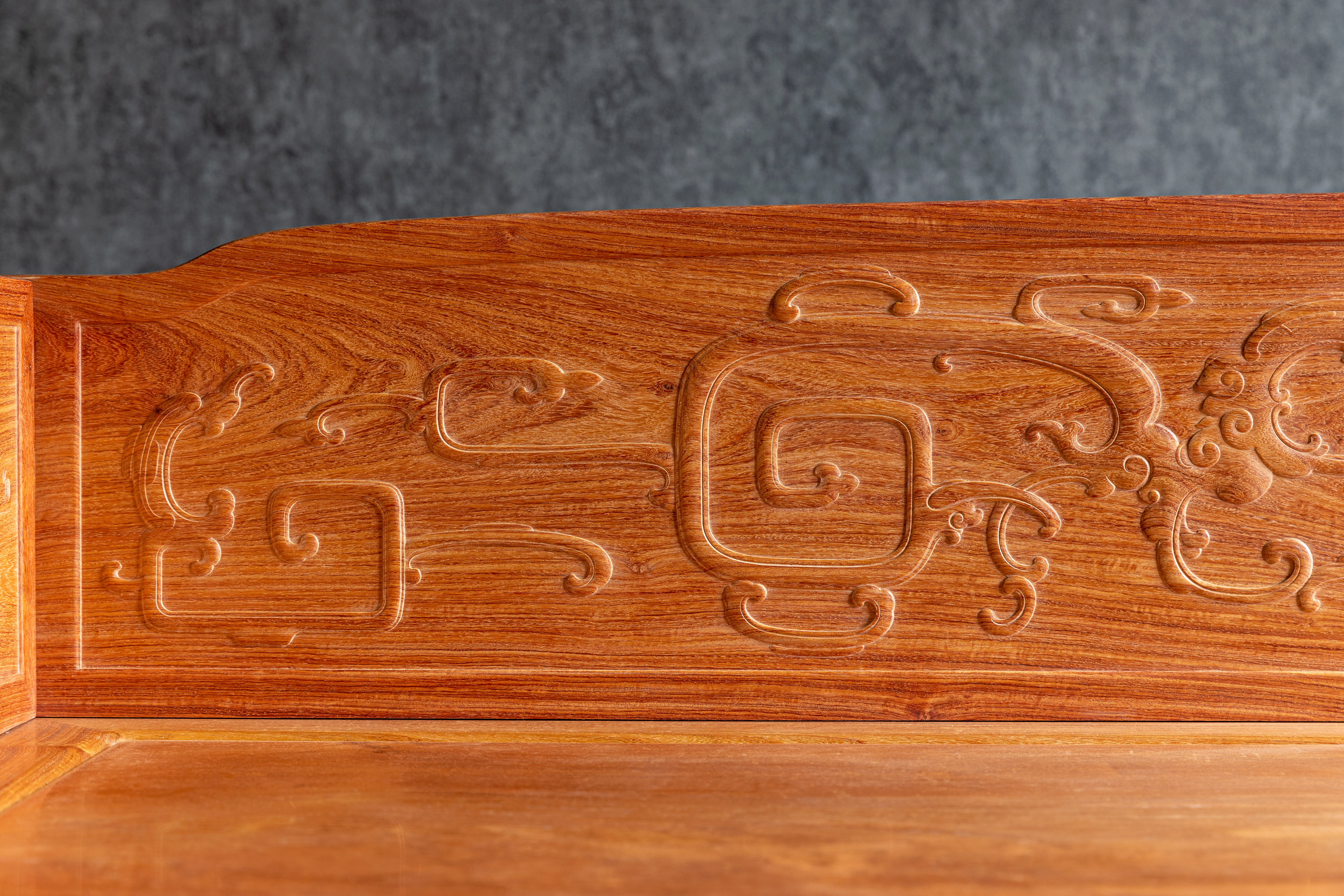 三面独板围子较为低矮,顶部微微上拱,尽头和缓下落,显得端庄稳重。除靠墙面外,三围另五面均开光如攒框,铲地浮雕夔龙纹,身型卷曲矫健,盘桓姿态威猛逼真。四面牙子也用相同纹饰,两大夹一小。在中国古代的龙纹应用中,如此例大小结合者,通常含有苍龙教子的美好寓意。