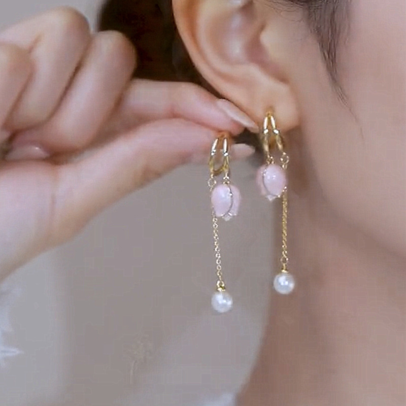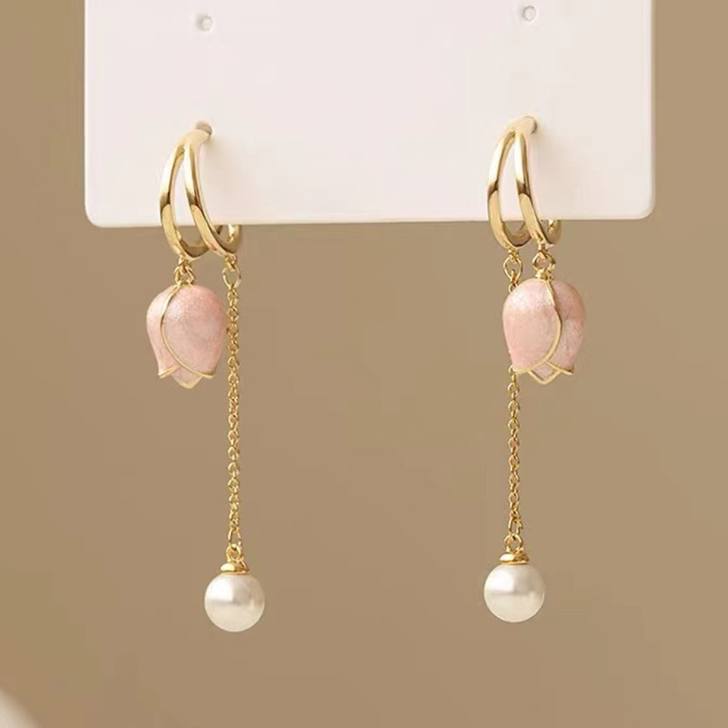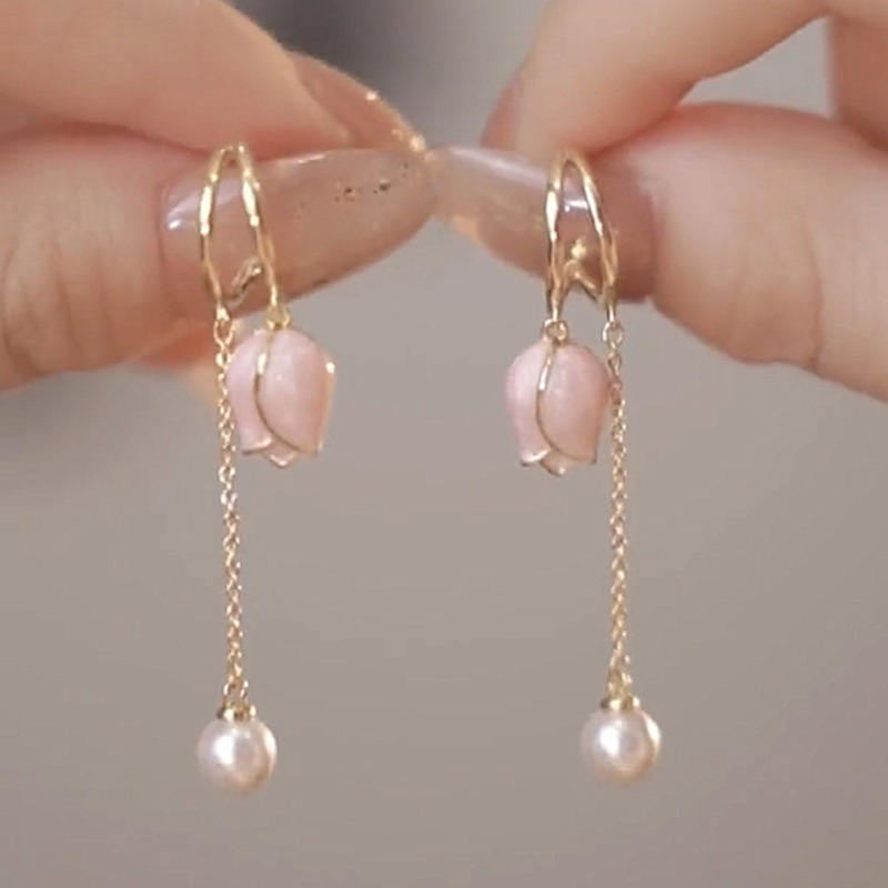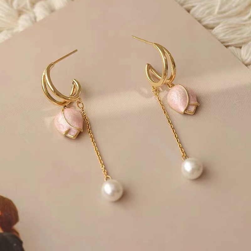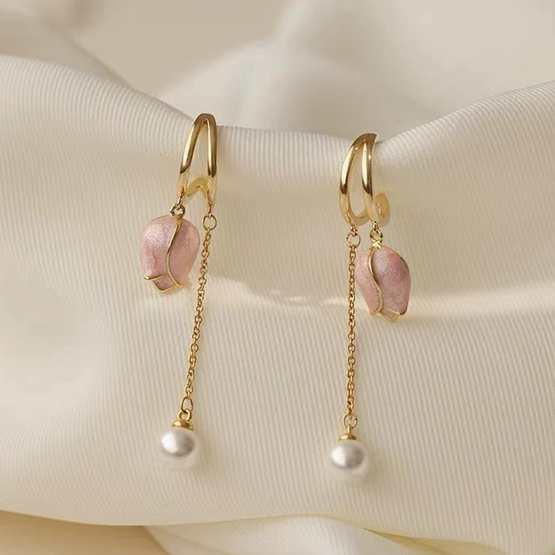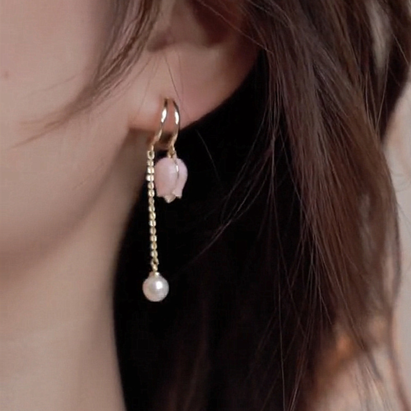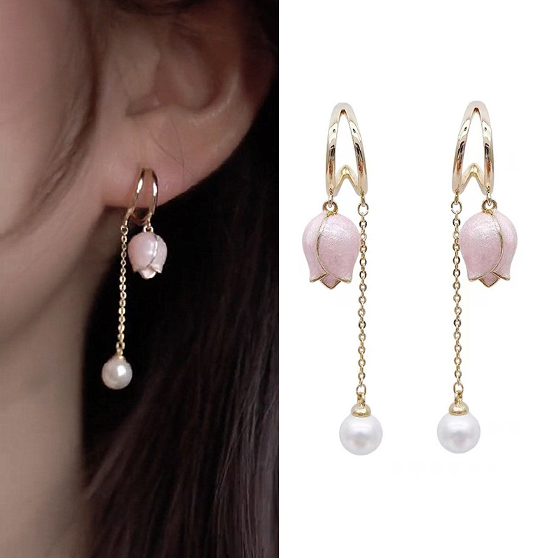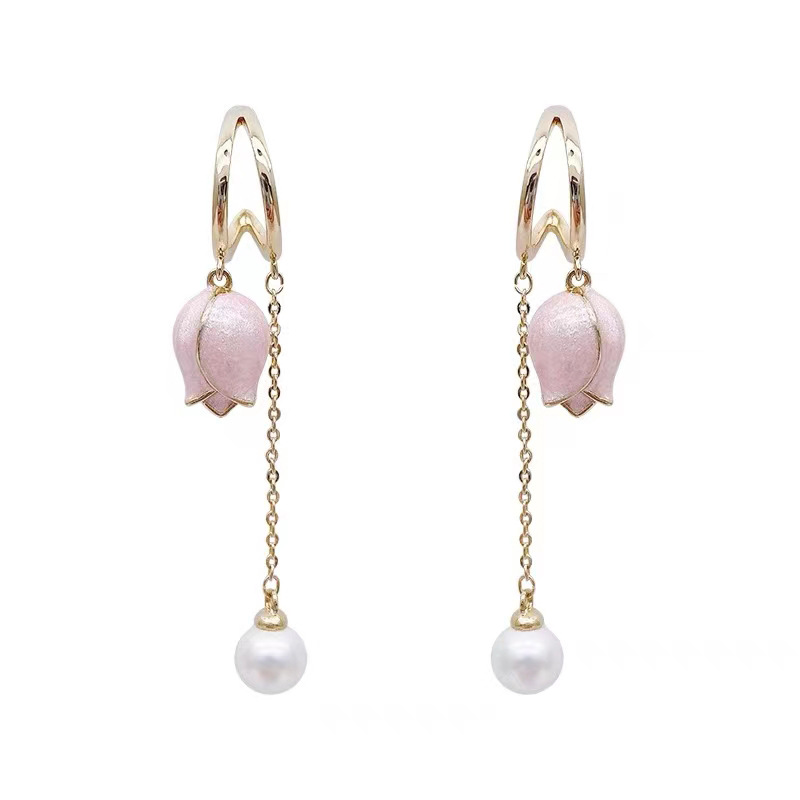 JU-A310仙女显脸瘦粉色郁金香耳环流苏长款耳坠珍珠耳饰耳钉